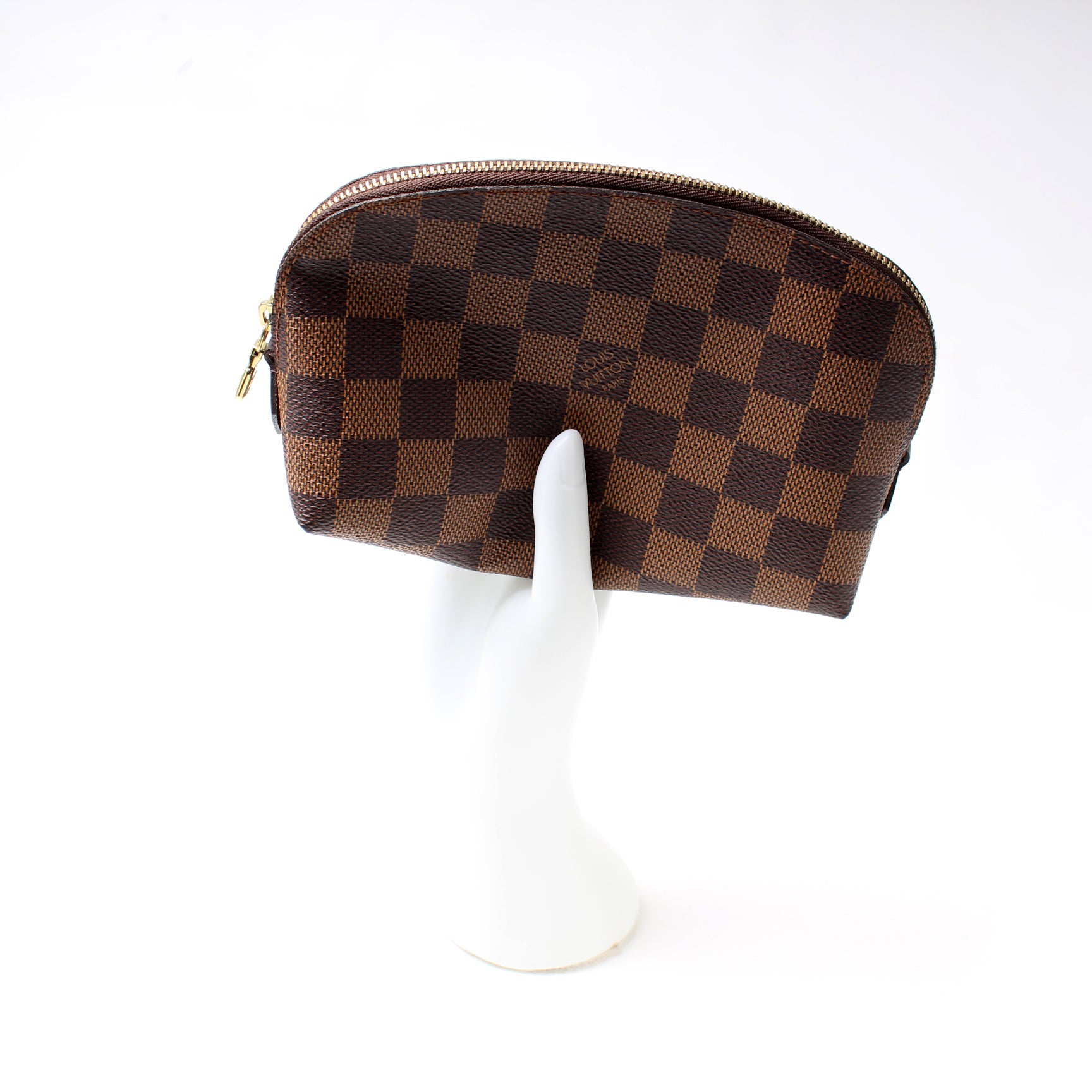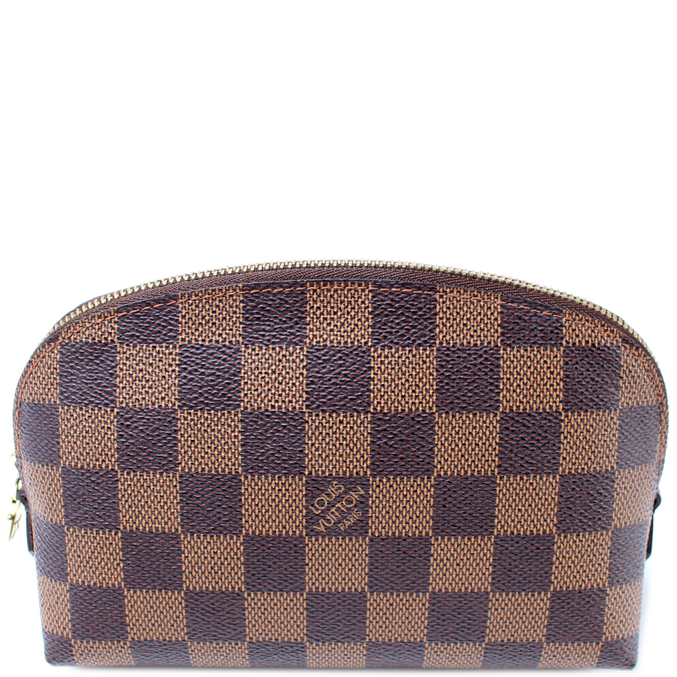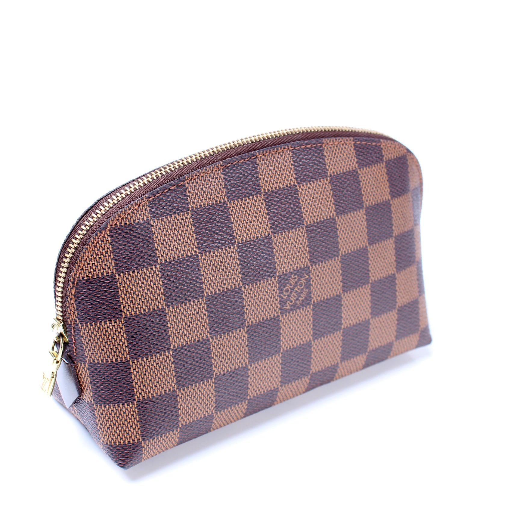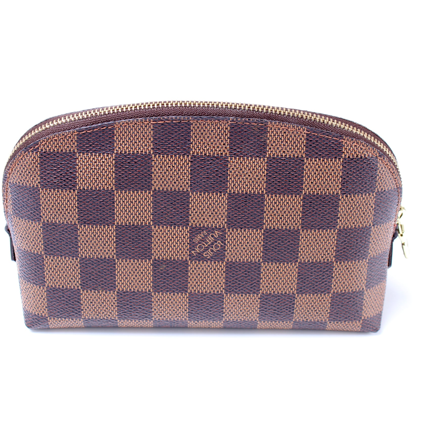 This pre-owned Louis Vuitton Cosmetic Pouch PM is guaranteed 100% authentic. The exterior is in the classic Louis Vuitton Damier Ebene coated canvas.