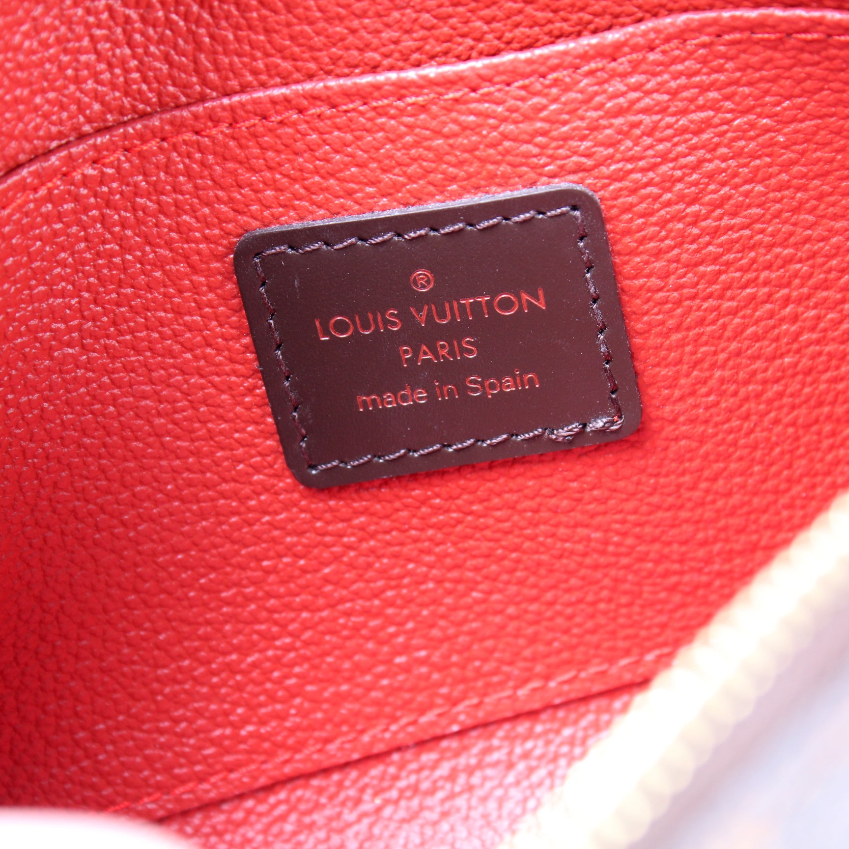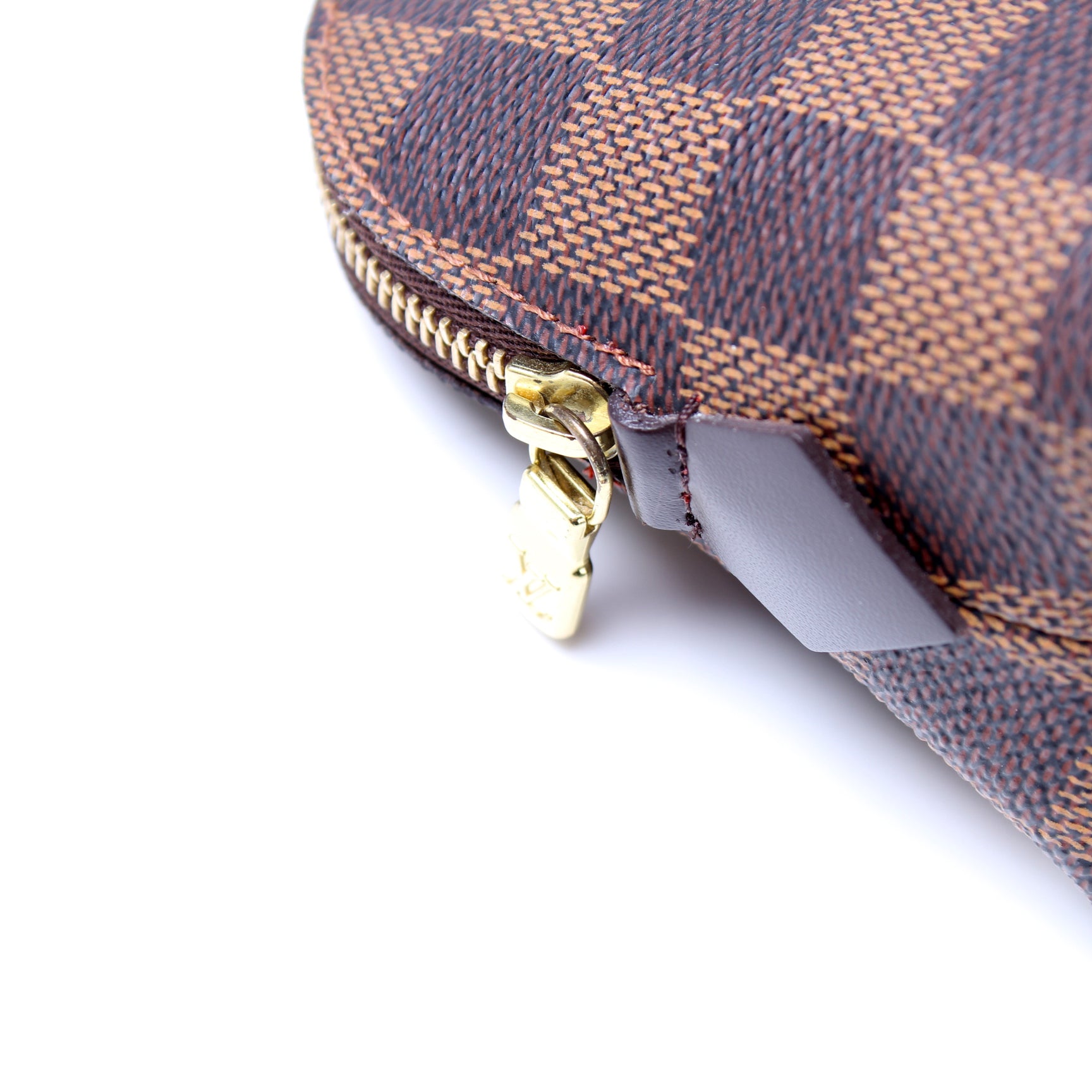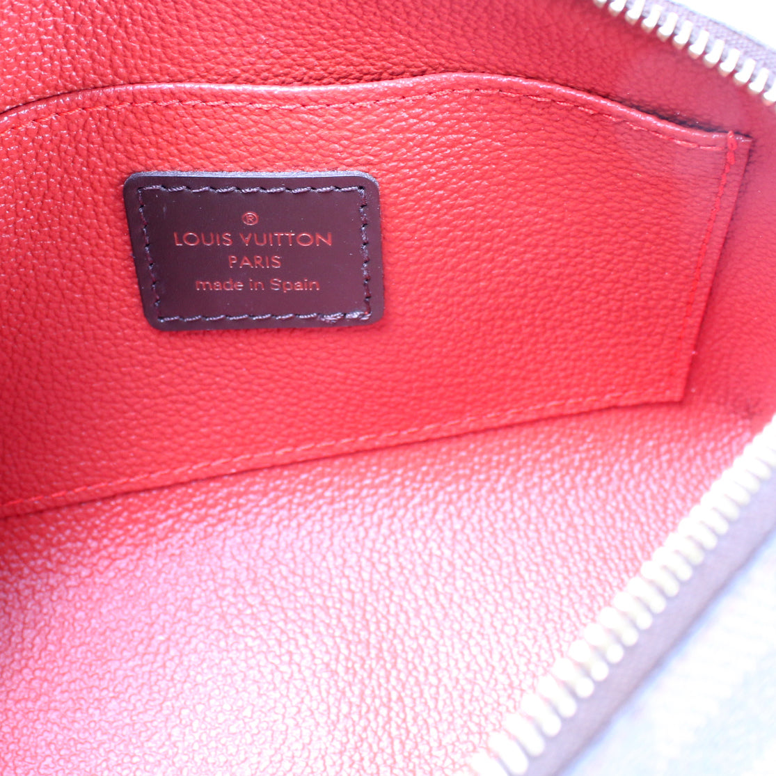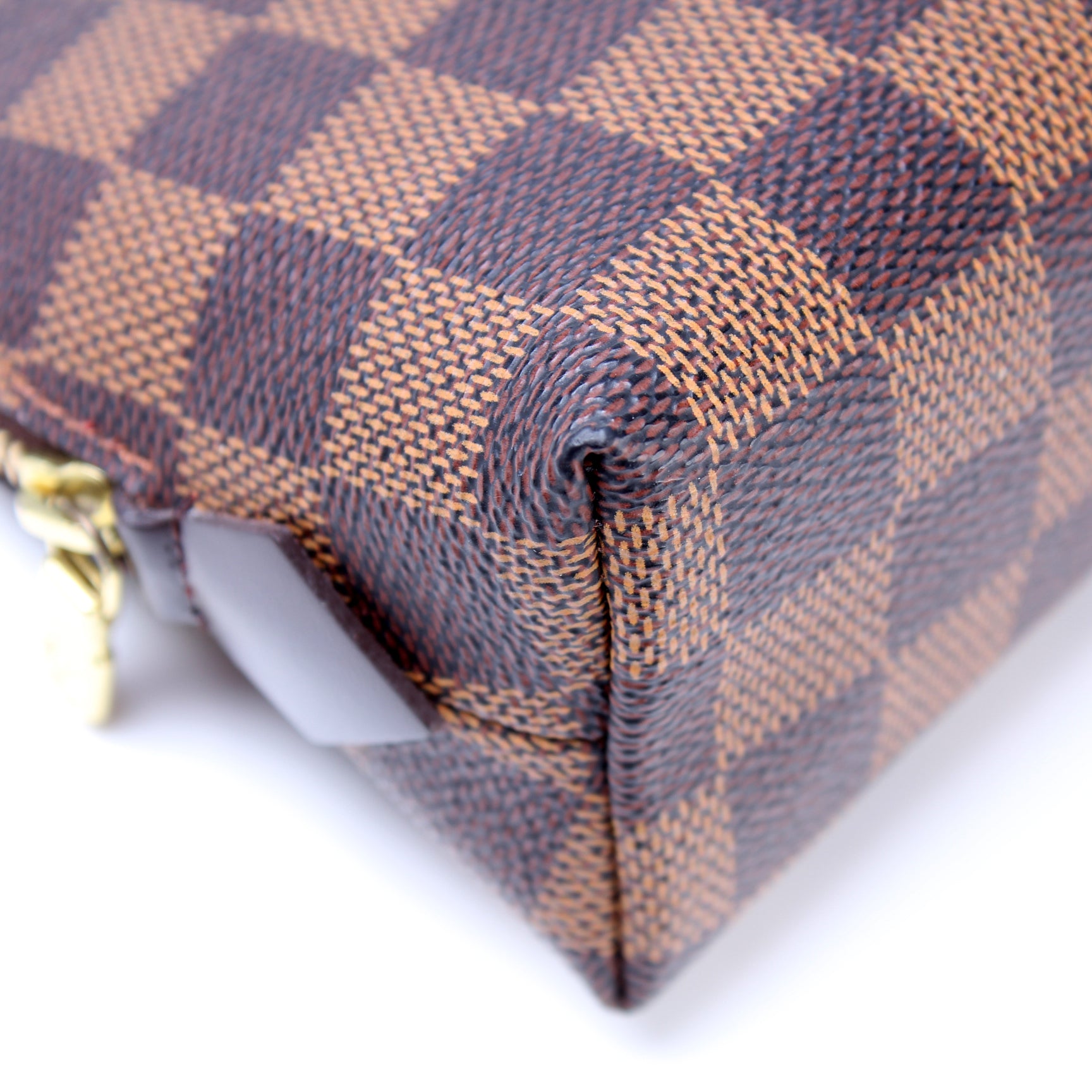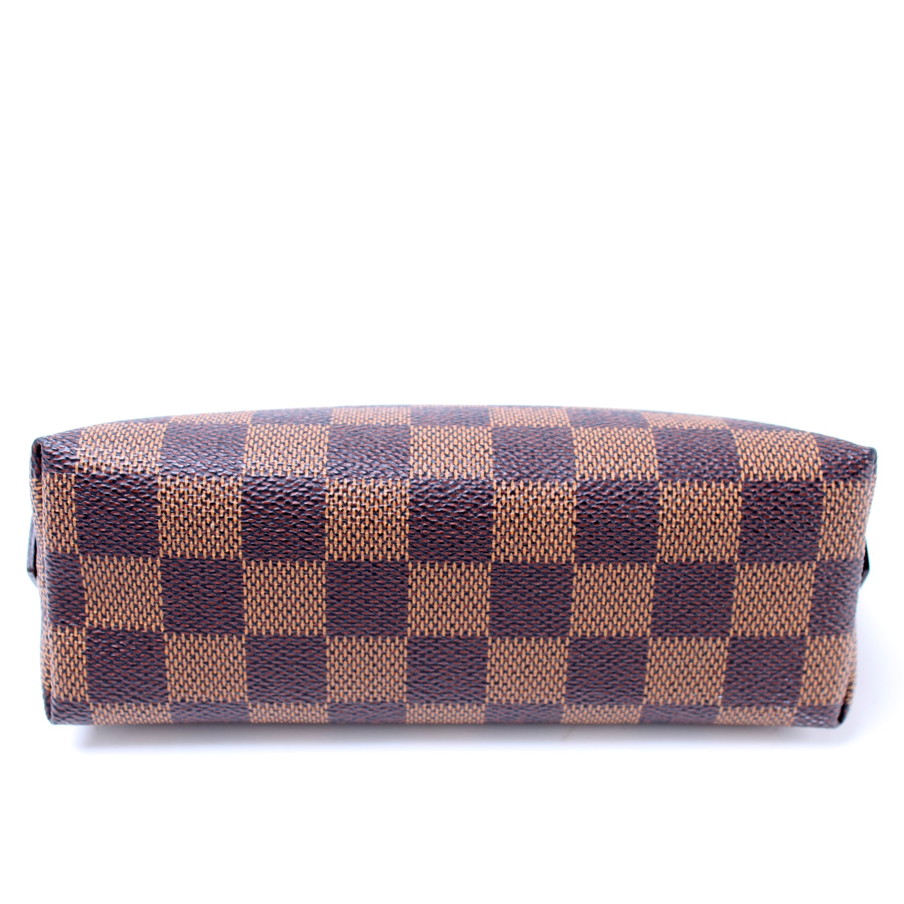 This pre-owned Louis Vuitton Cosmetic Pouch PM is guaranteed 100% authentic. The exterior is in the classic Louis Vuitton Damier Ebene coated canvas.