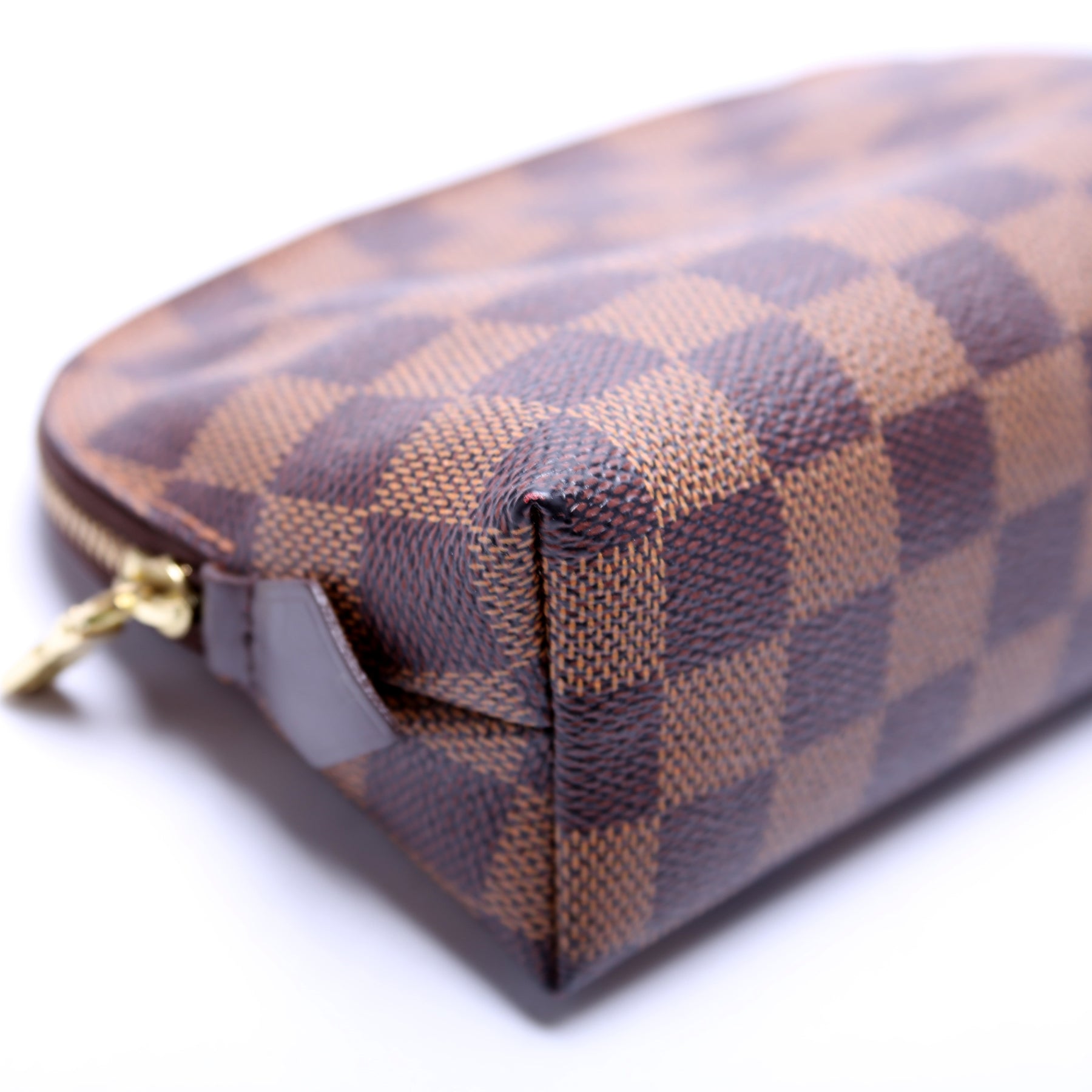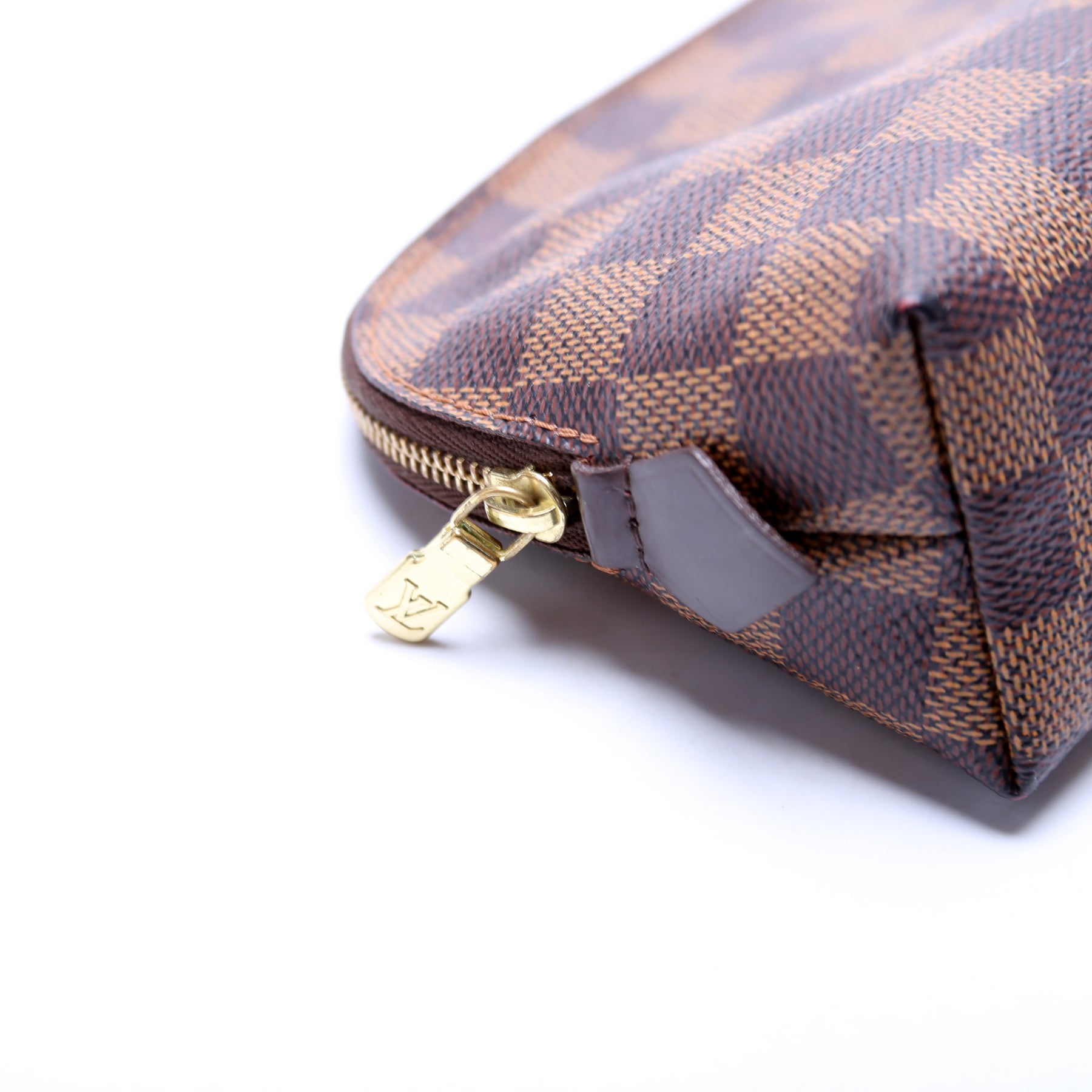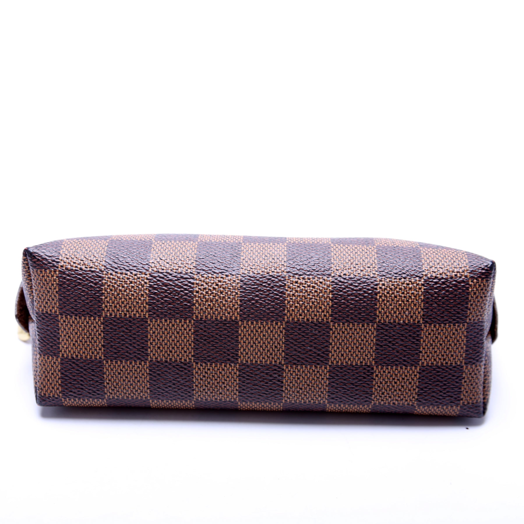 This pre-owned Louis Vuitton Cosmetic Pouch PM is guaranteed 100% authentic. The exterior is in the classic Louis Vuitton Damier Ebene coated canvas.