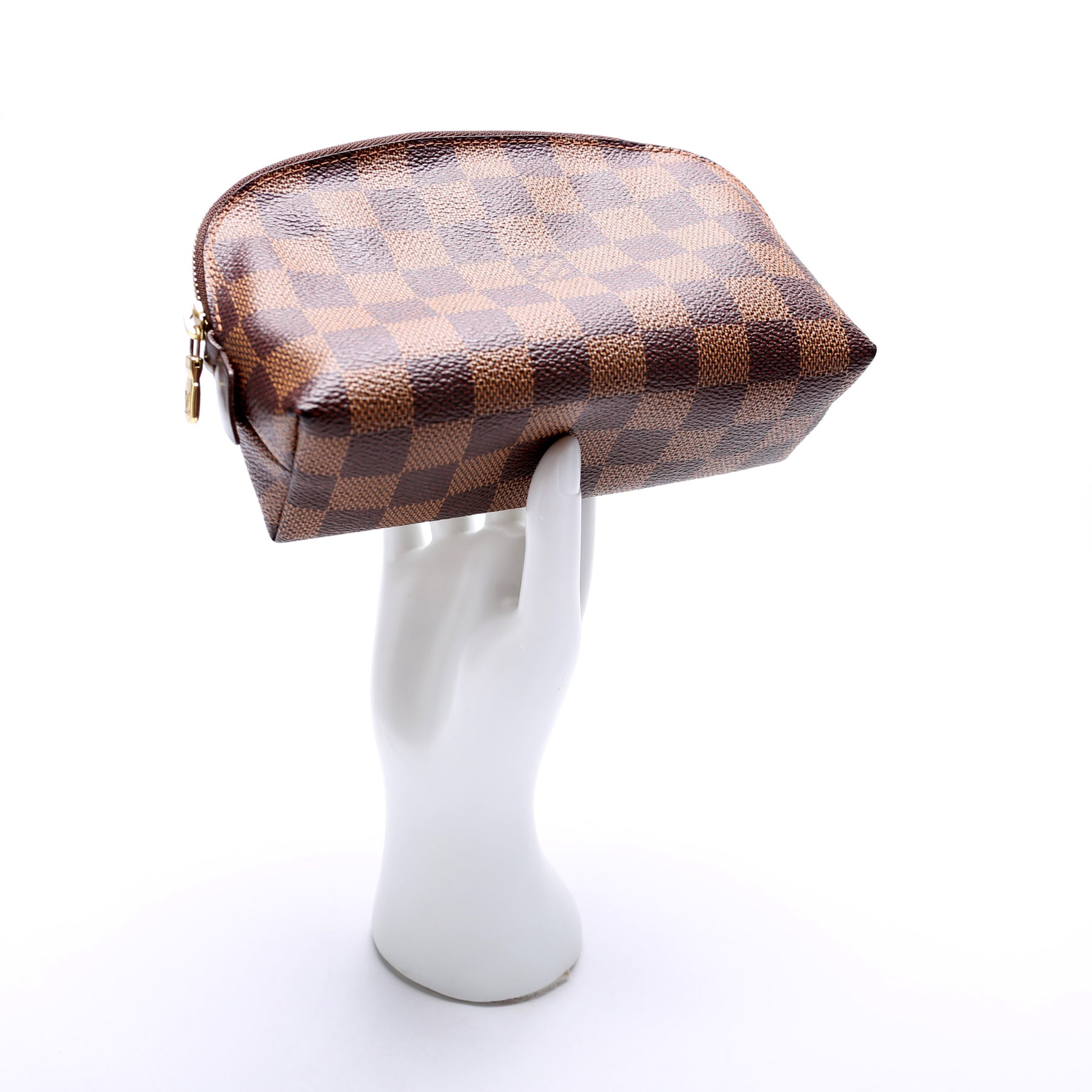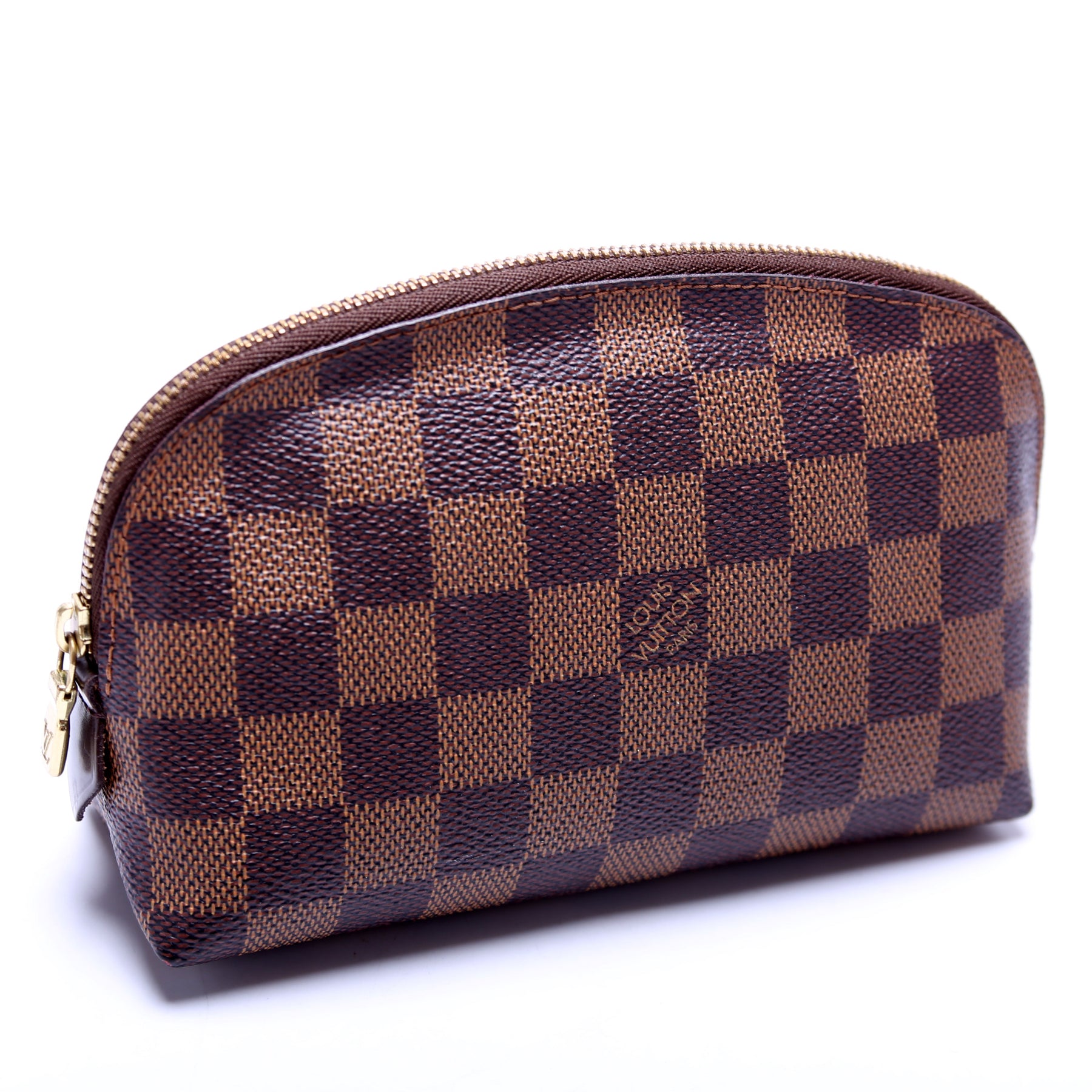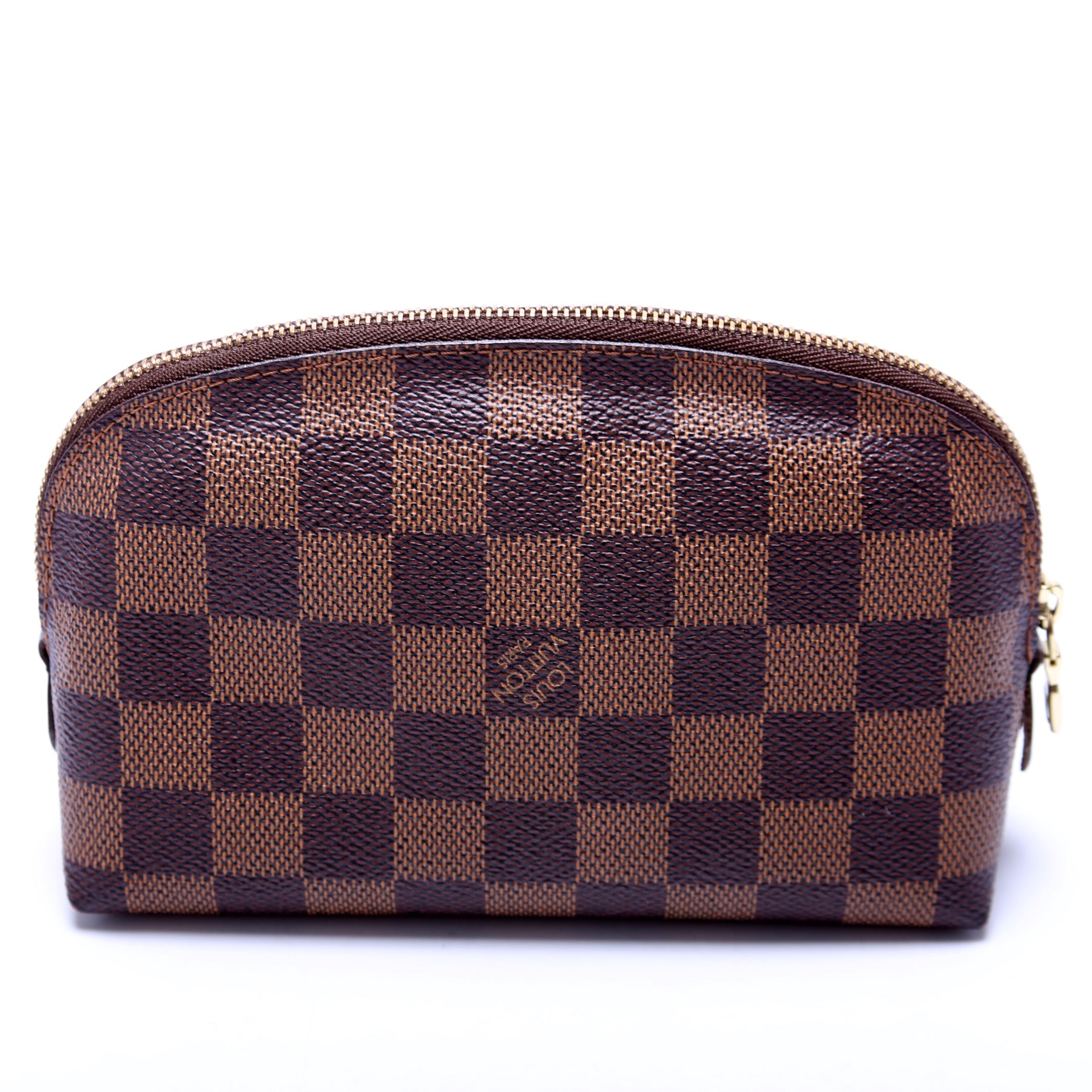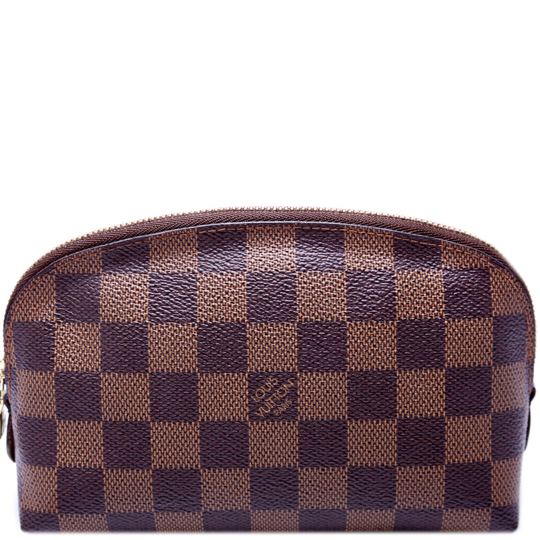 This pre-owned Louis Vuitton Cosmetic Pouch PM is guaranteed 100% authentic. The exterior is in the classic Louis Vuitton Damier Ebene coated canvas.