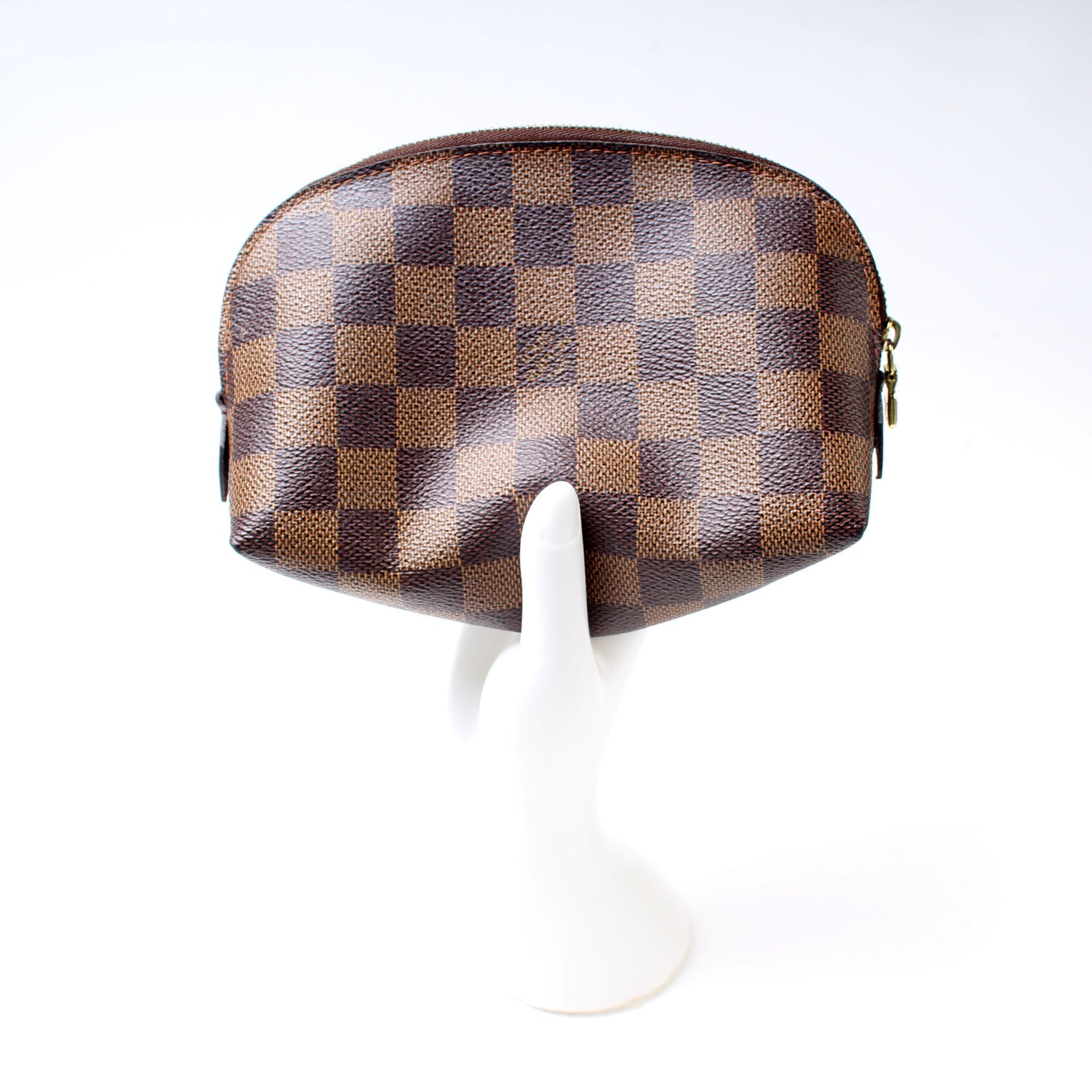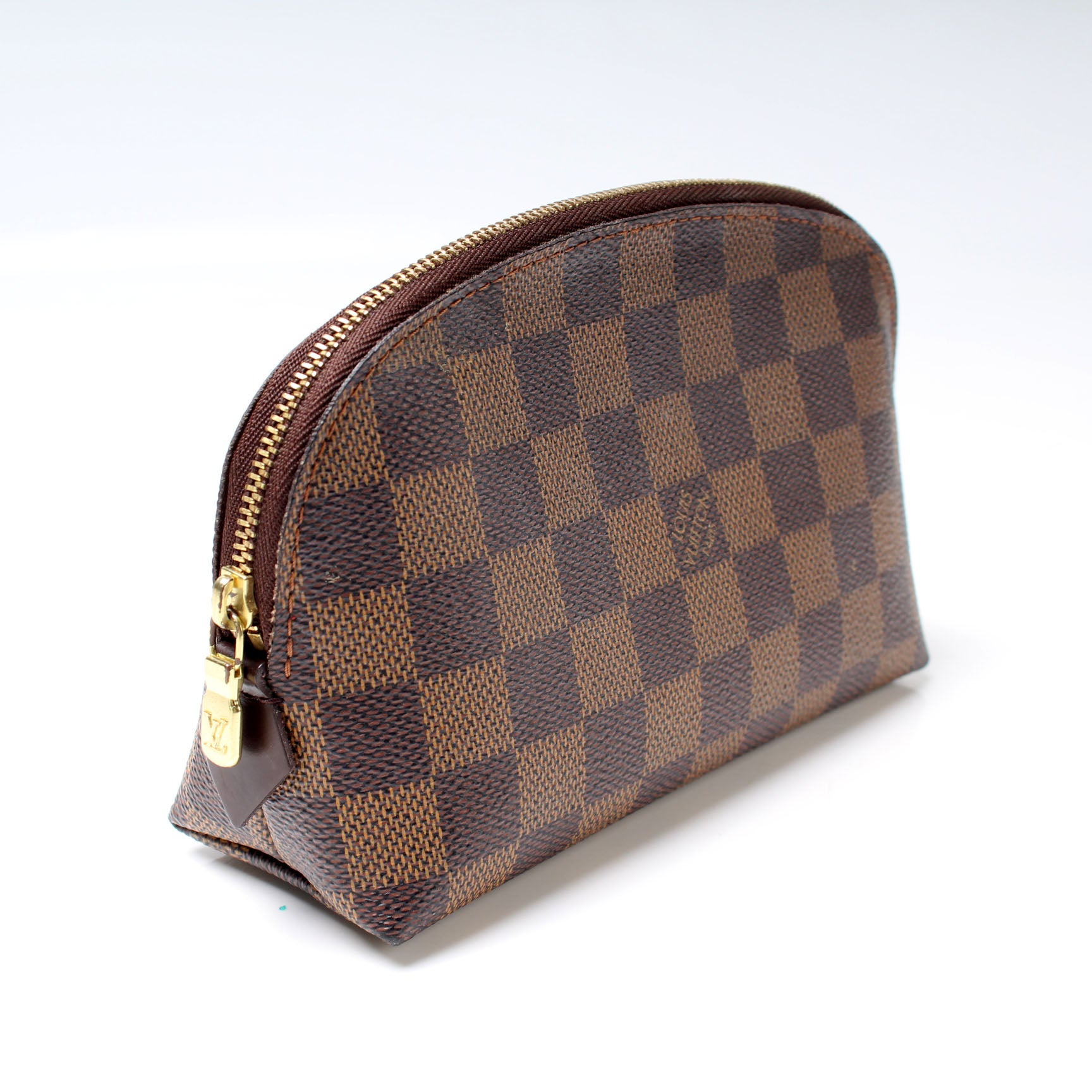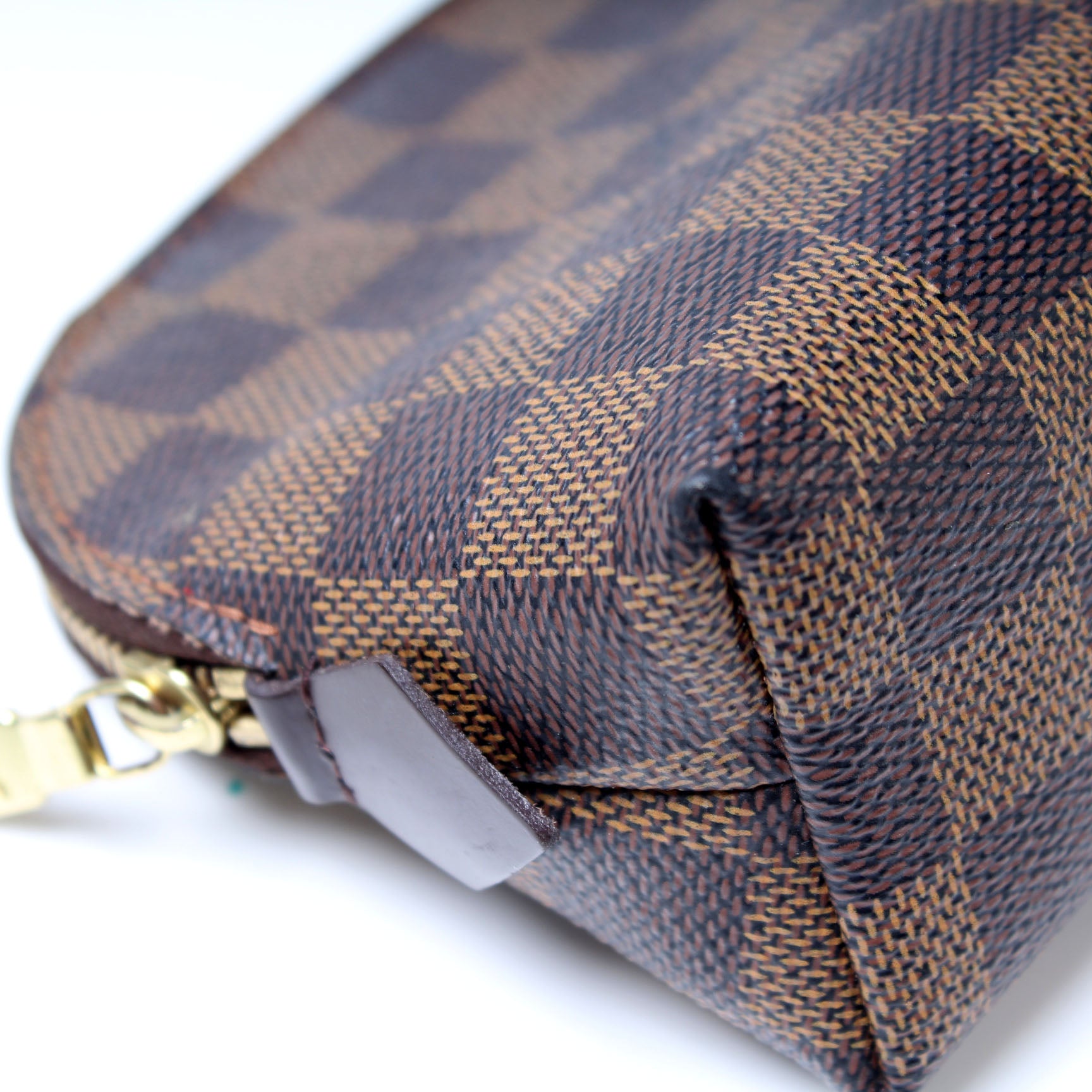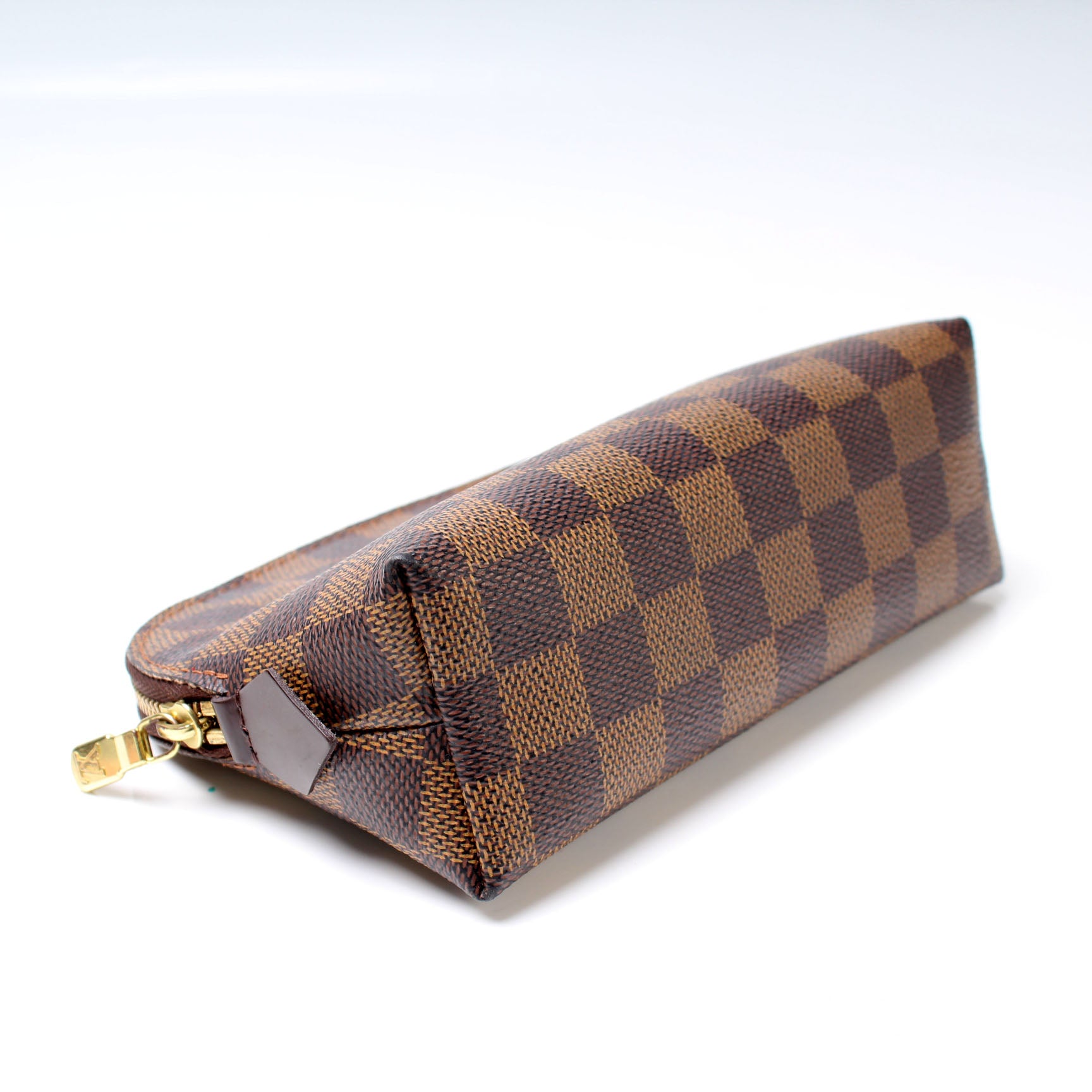 This pre-owned Louis Vuitton Cosmetic Pouch PM is guaranteed 100% authentic. The exterior is in the classic Louis Vuitton Damier Ebene coated canvas.