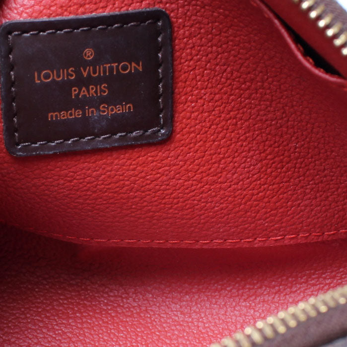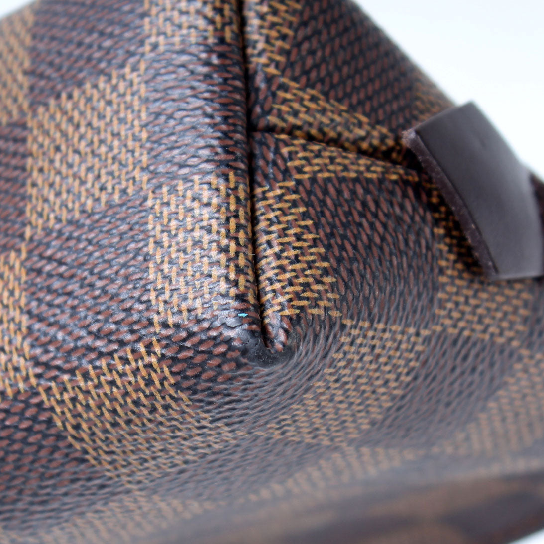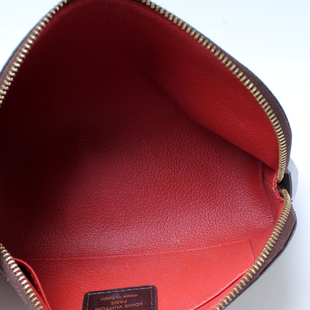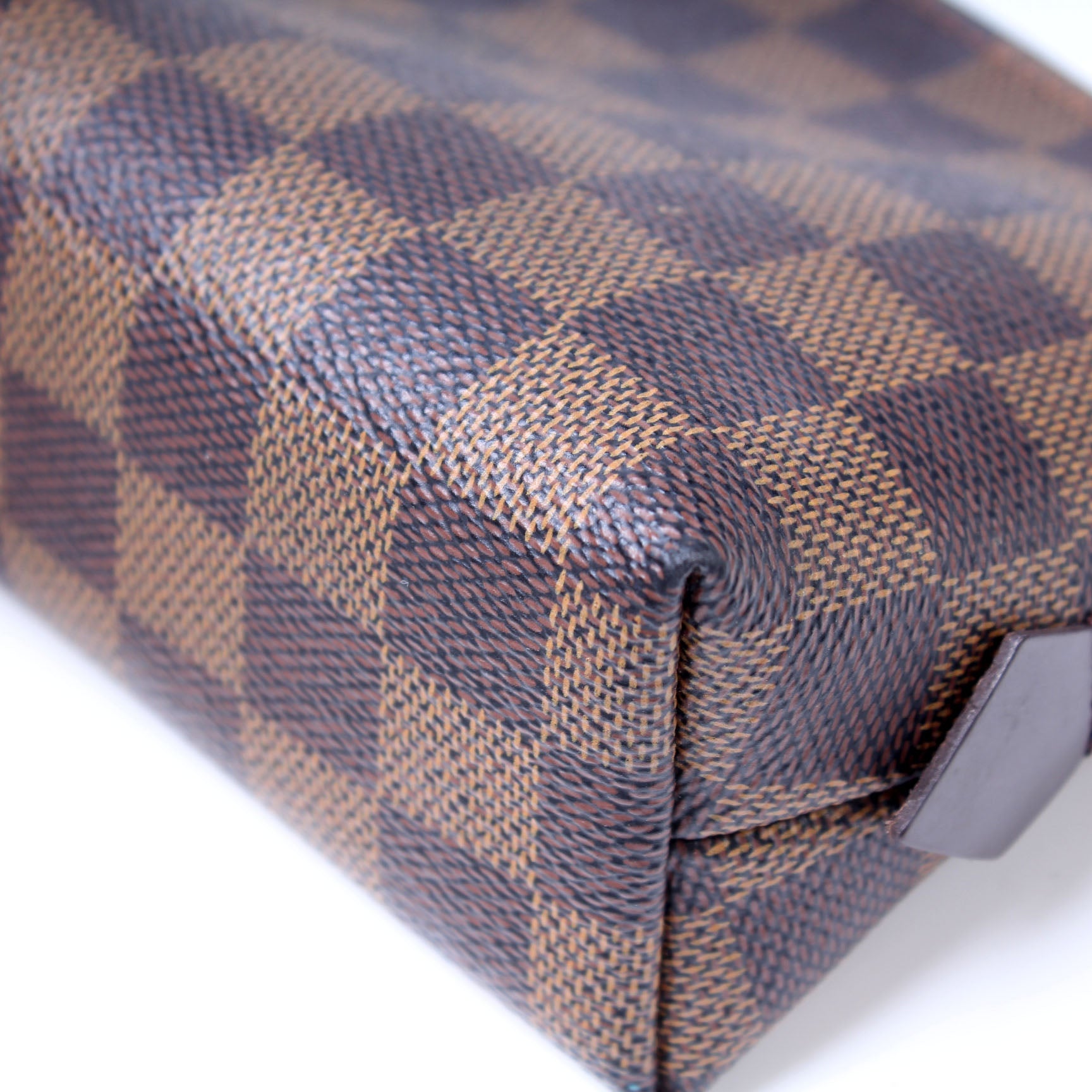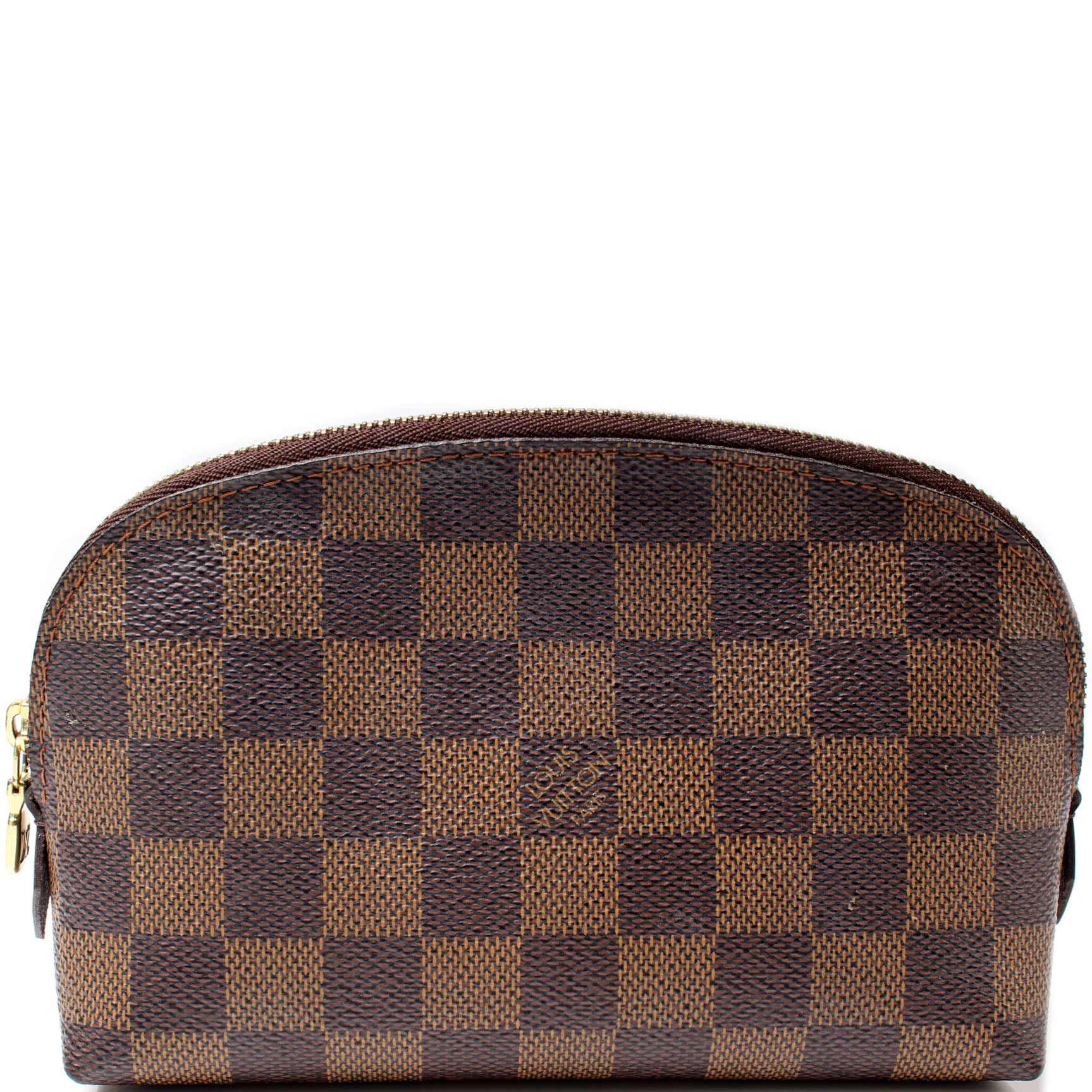 This pre-owned Louis Vuitton Cosmetic Pouch PM is guaranteed 100% authentic. The exterior is in the classic Louis Vuitton Damier Ebene coated canvas.
