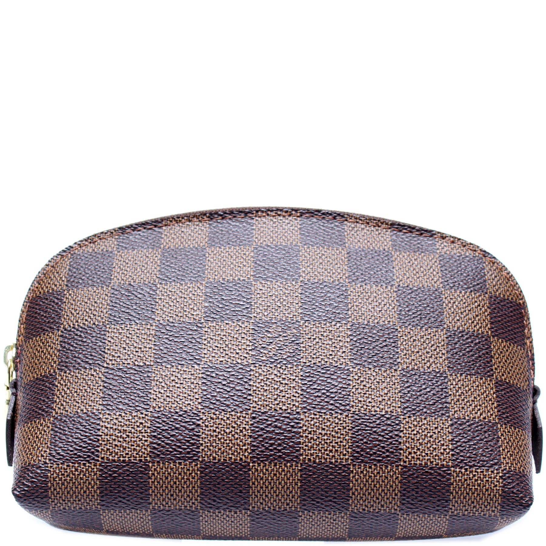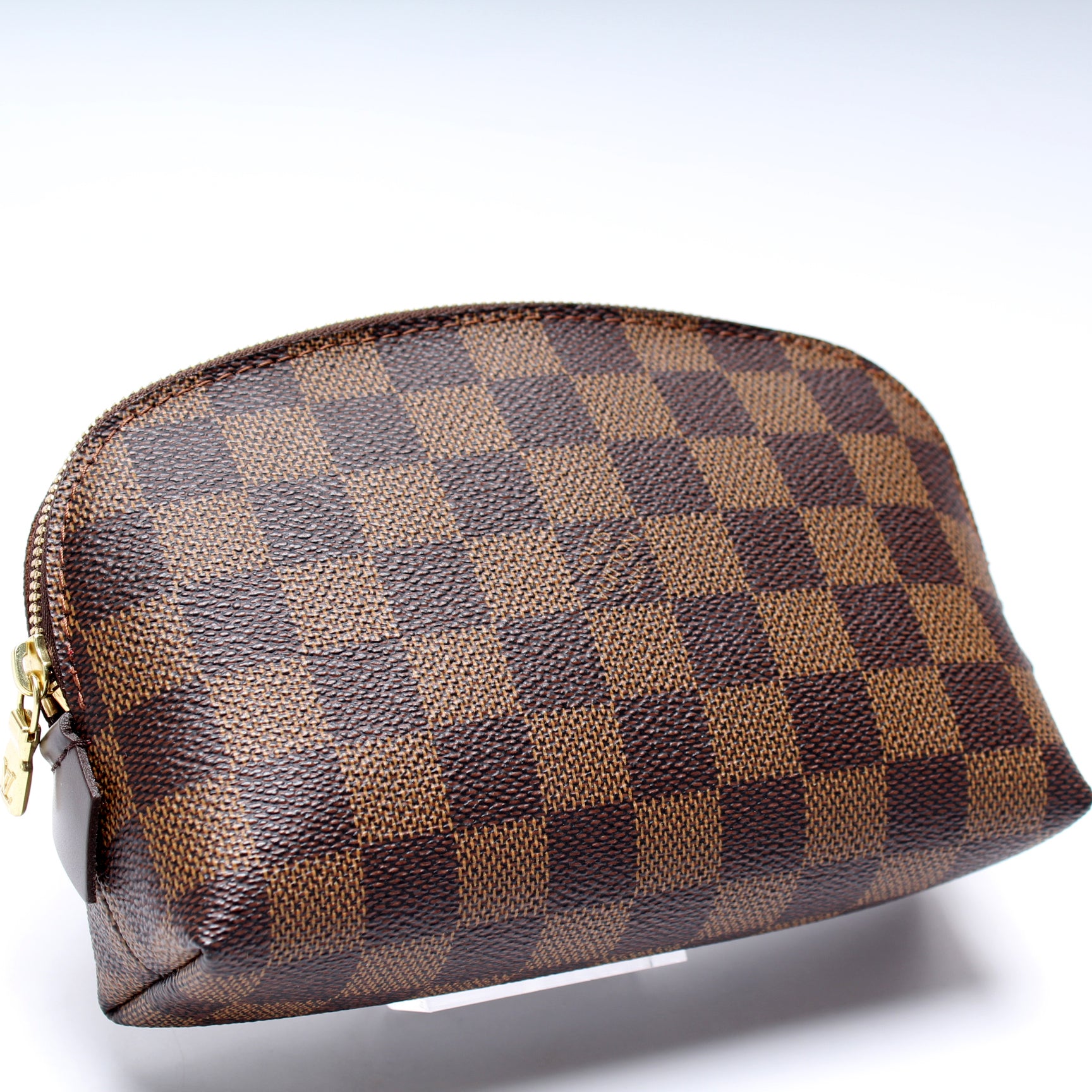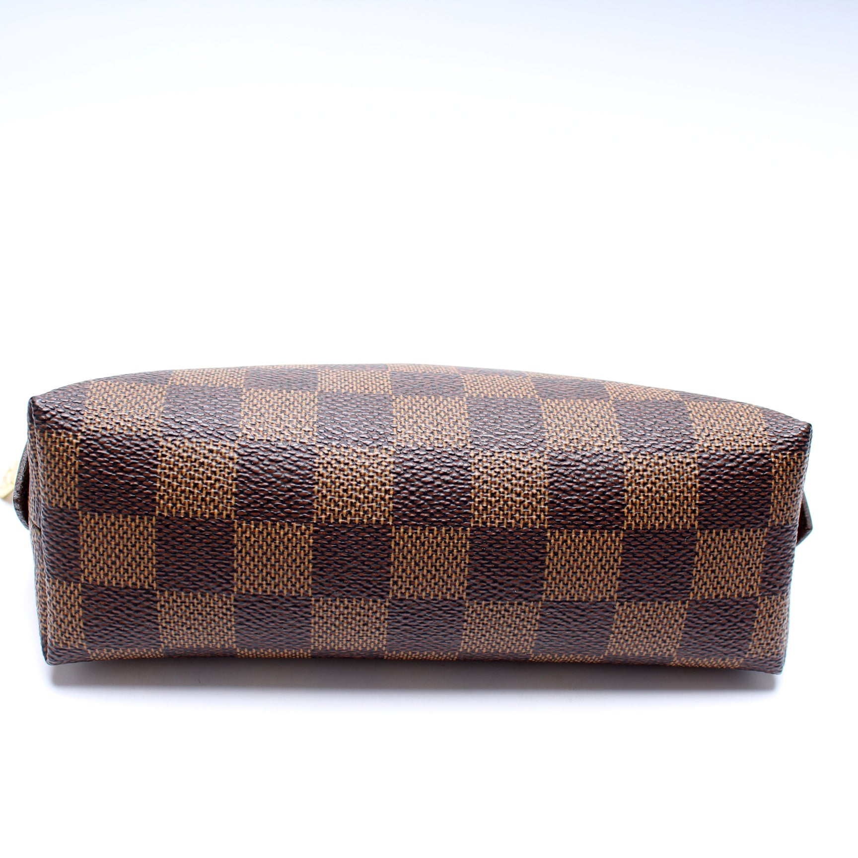 This pre-owned Louis Vuitton Cosmetic Pouch PM is guaranteed 100% authentic. The exterior is in the classic Louis Vuitton Damier Ebene coated canvas.