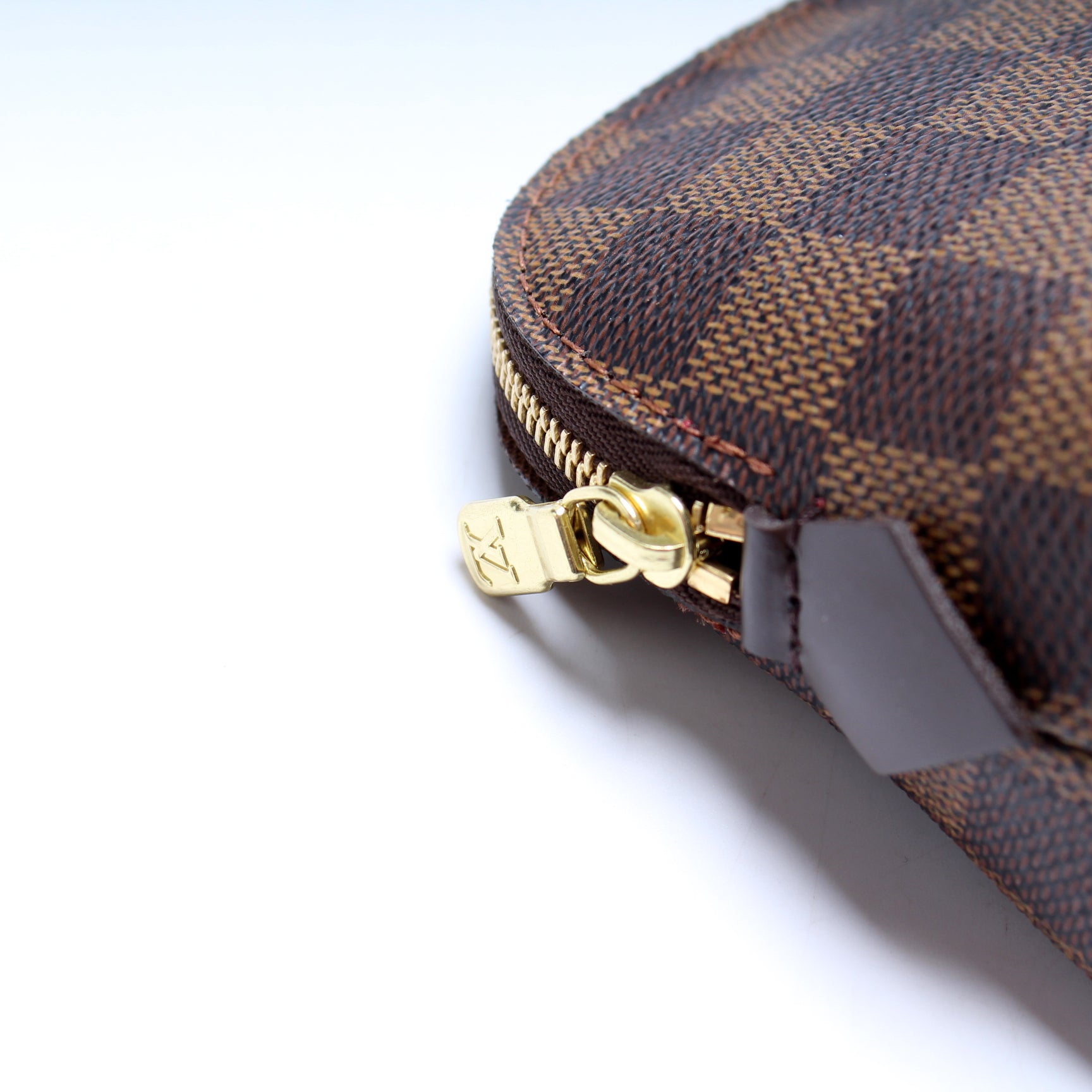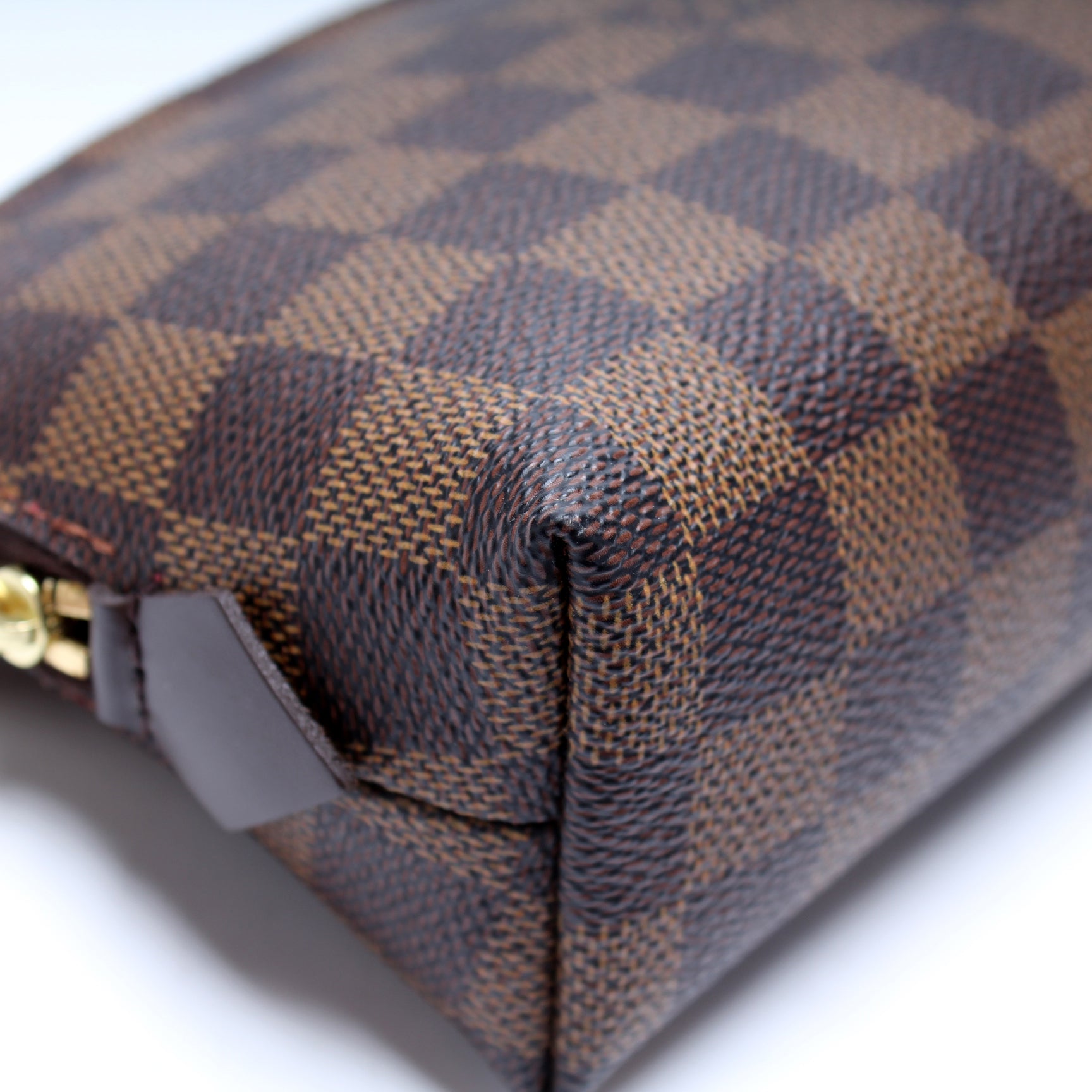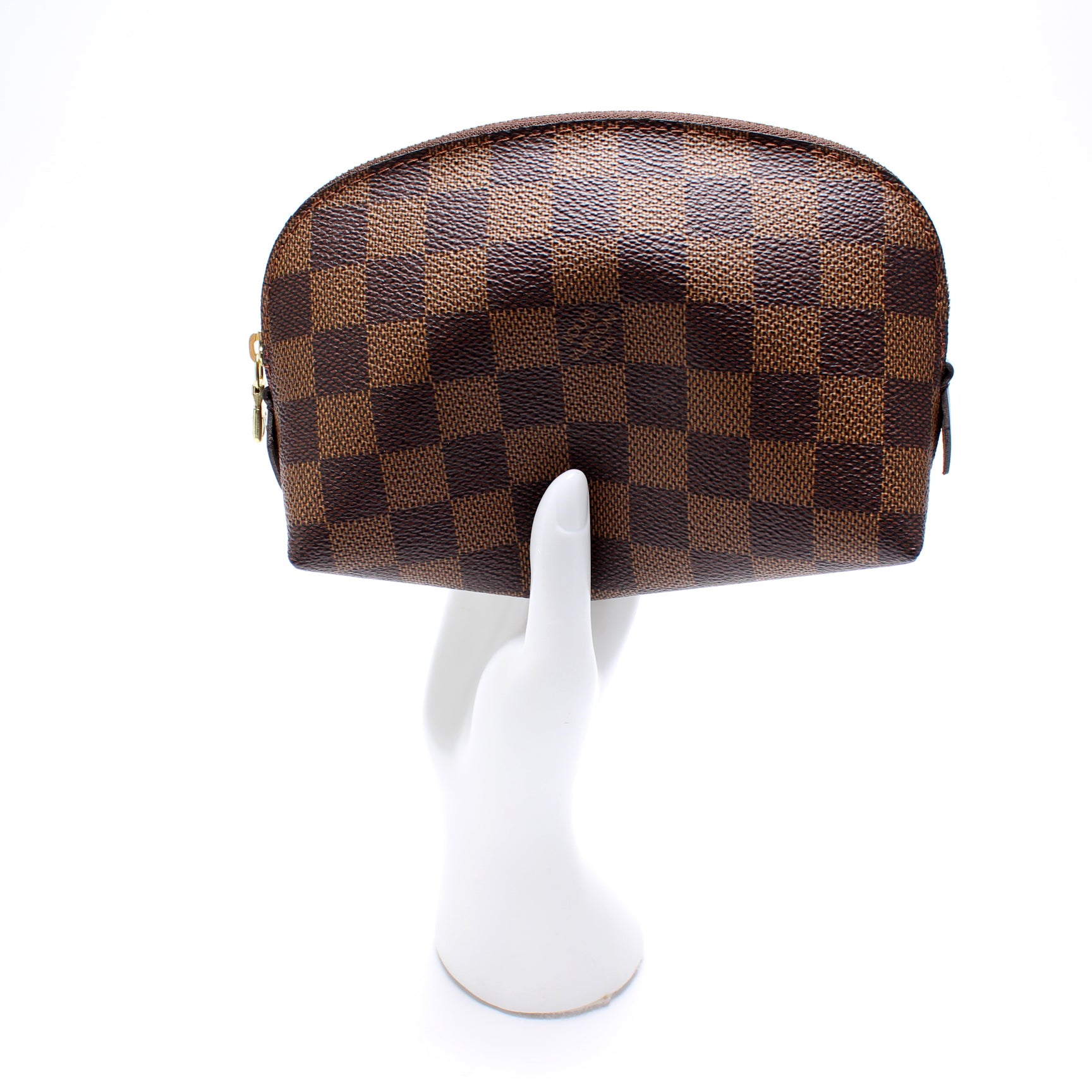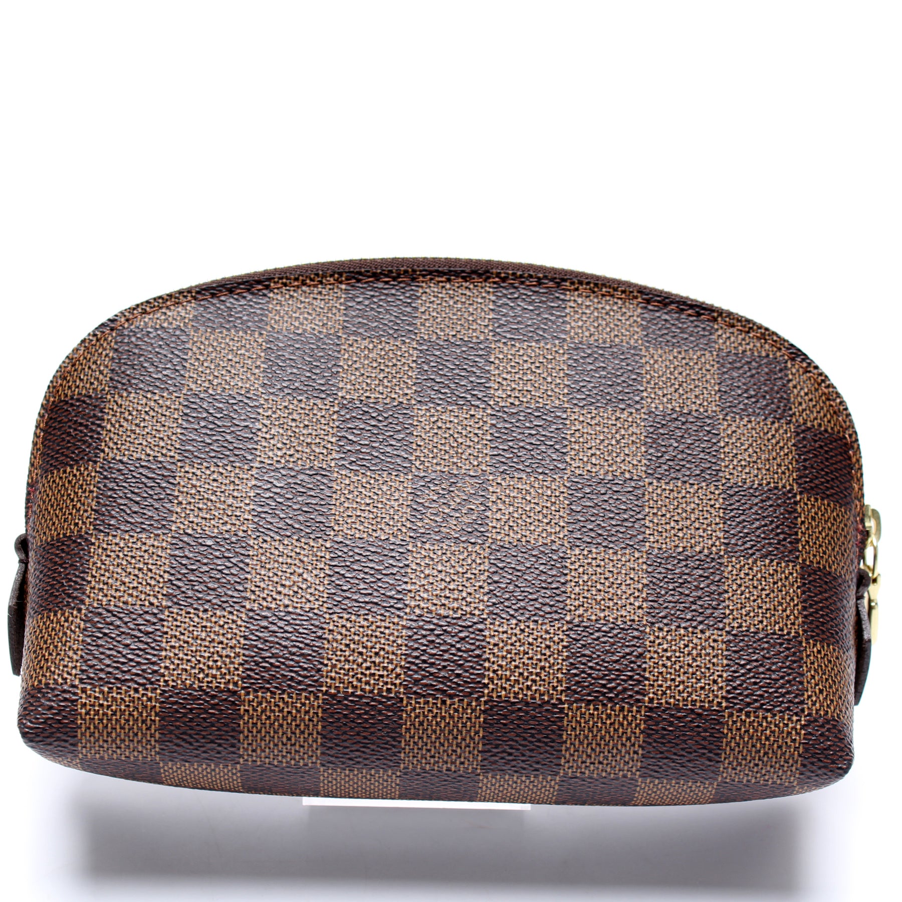 This pre-owned Louis Vuitton Cosmetic Pouch PM is guaranteed 100% authentic. The exterior is in the classic Louis Vuitton Damier Ebene coated canvas.