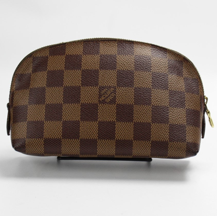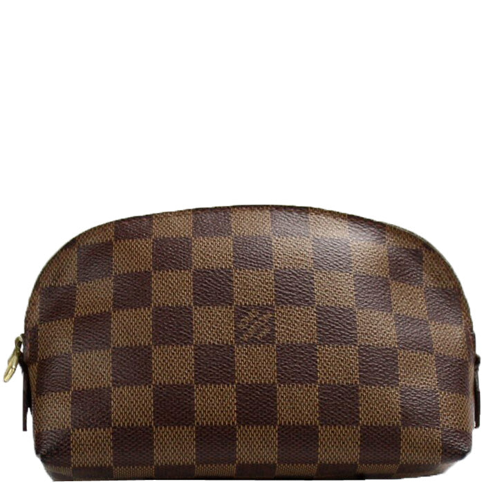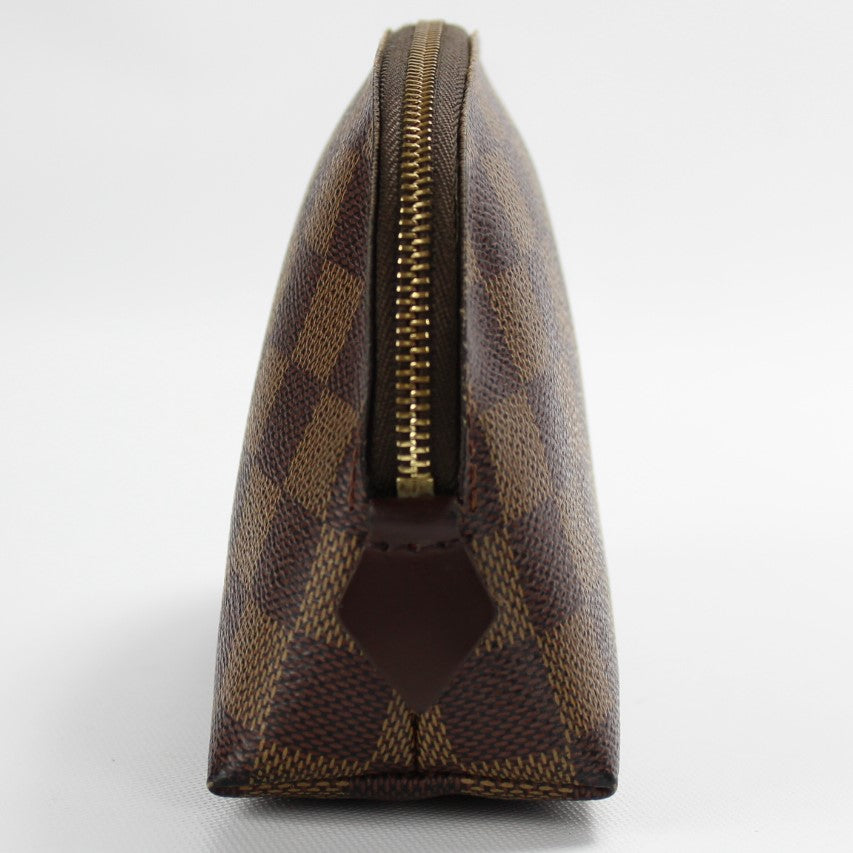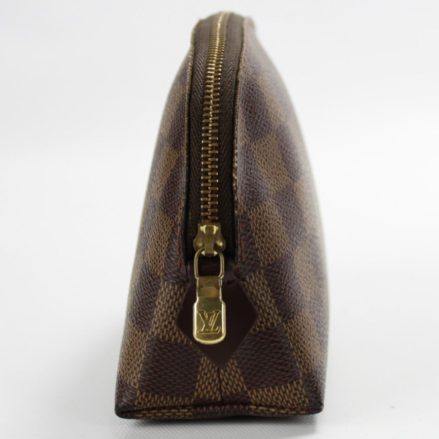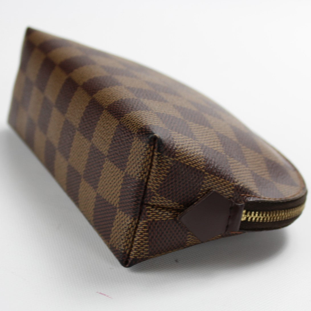 This pre-owned Louis Vuitton Cosmetic Pouch PM is guaranteed 100% authentic. The exterior is in the classic Damier Ebene coated canvas.