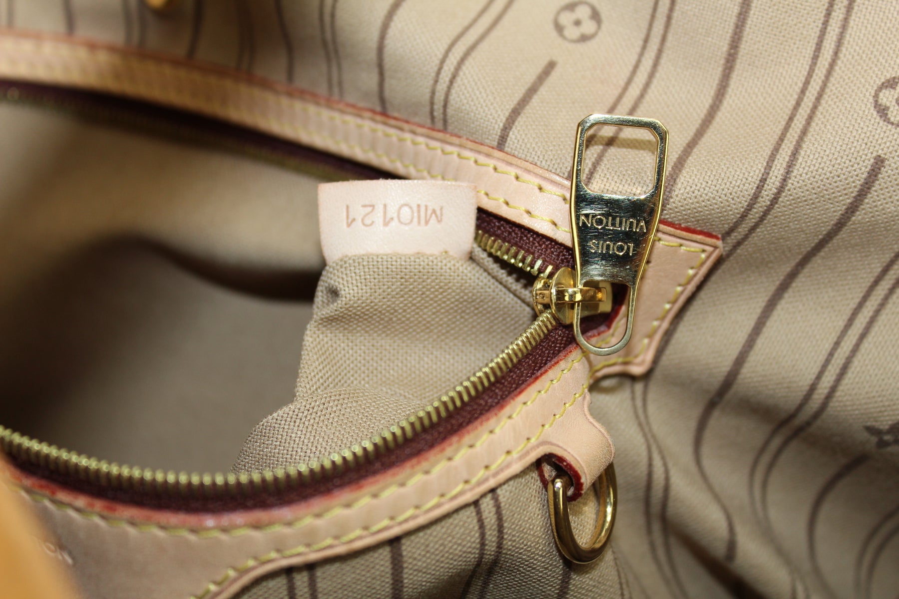Interior: The interior is clean and free of rips or tears. It includes one zippered pocket.