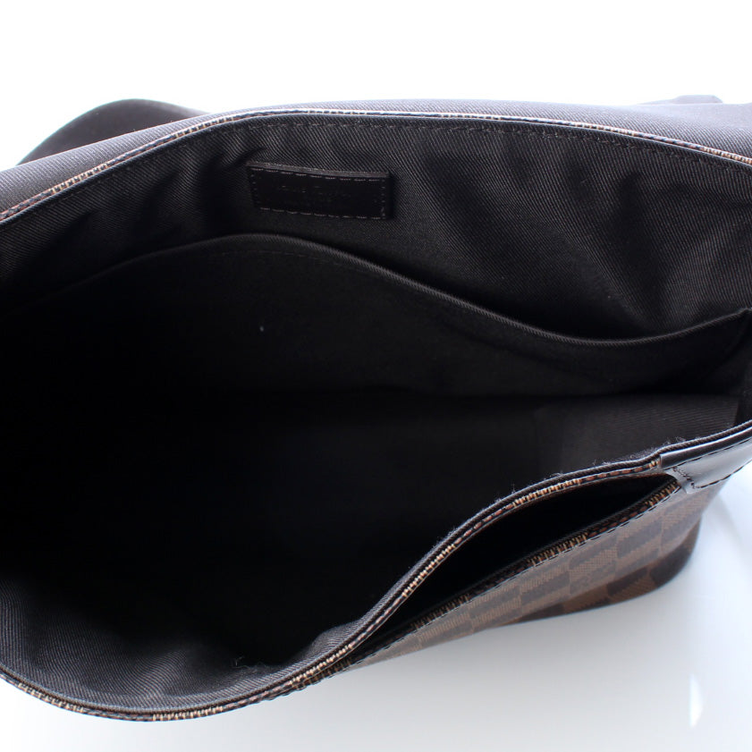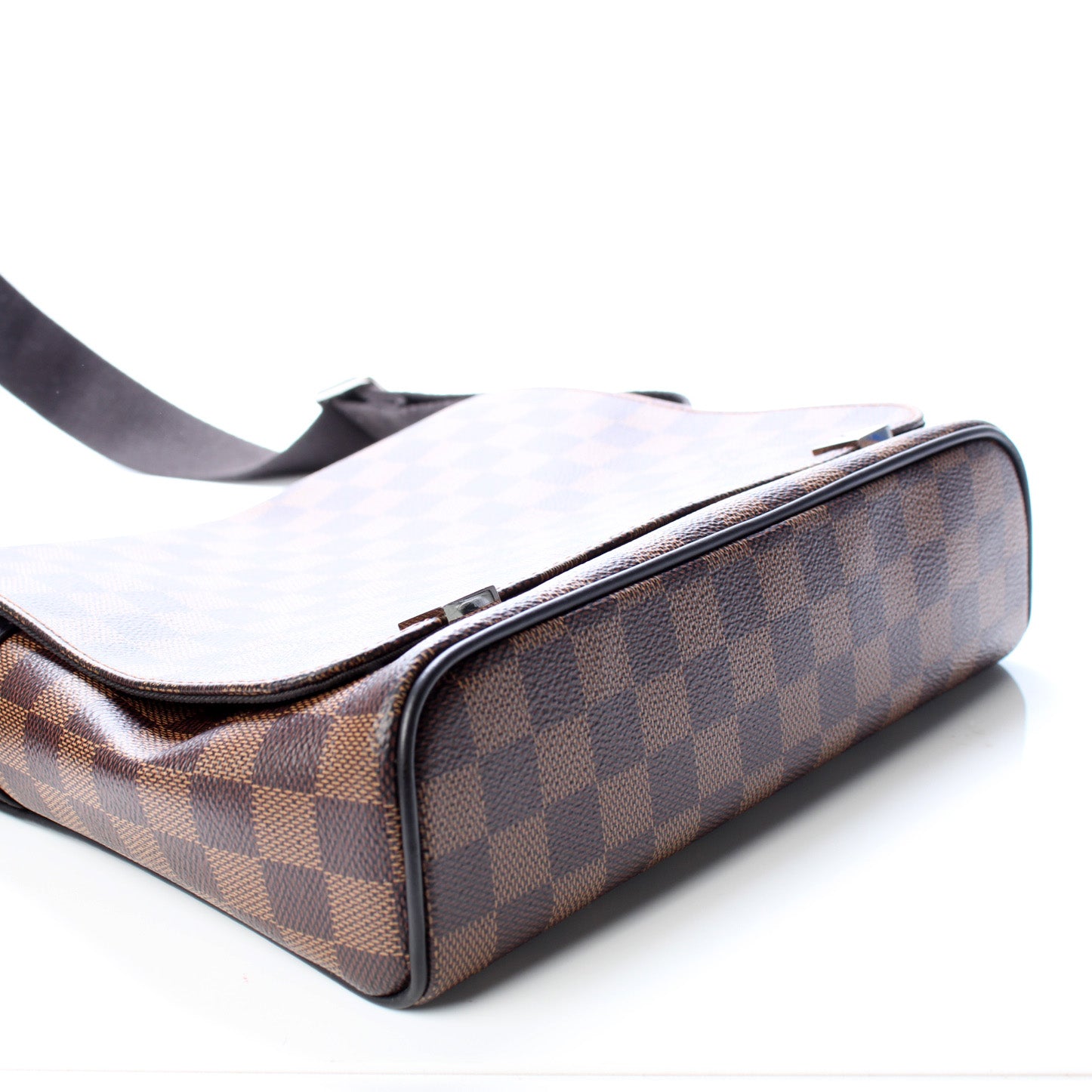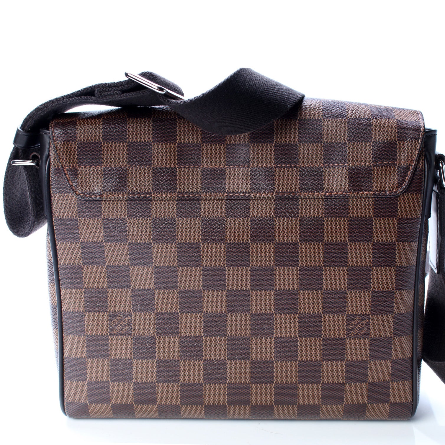 This pre-owned Louis Vuitton District PM is guaranteed 100% authentic. The exterior is in the classic Louis Vuitton Damier Ebene coated canvas.