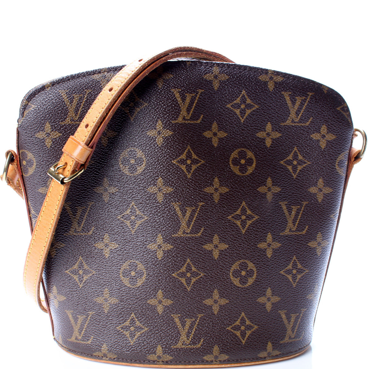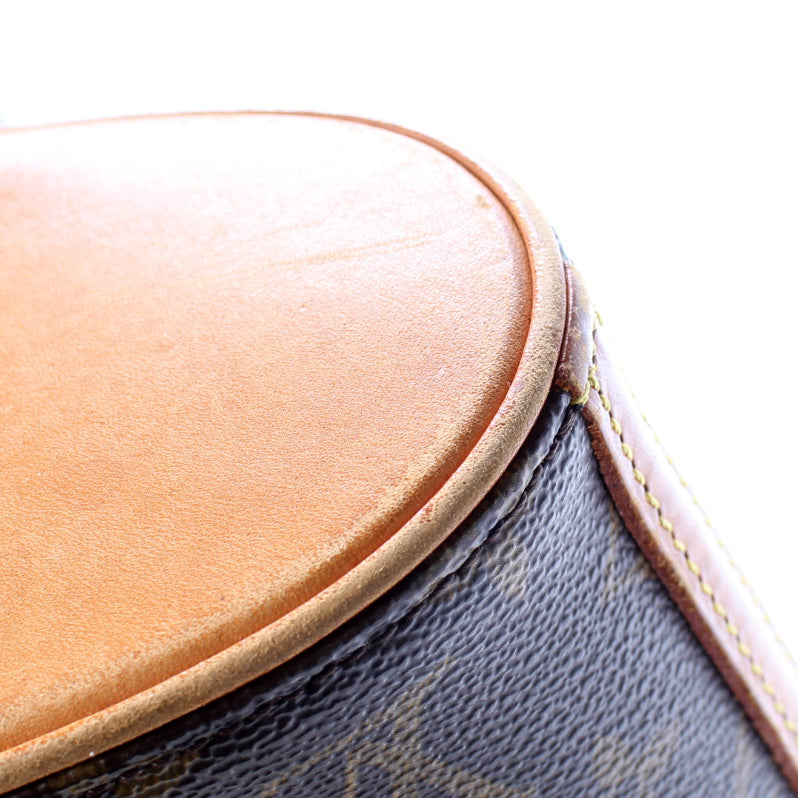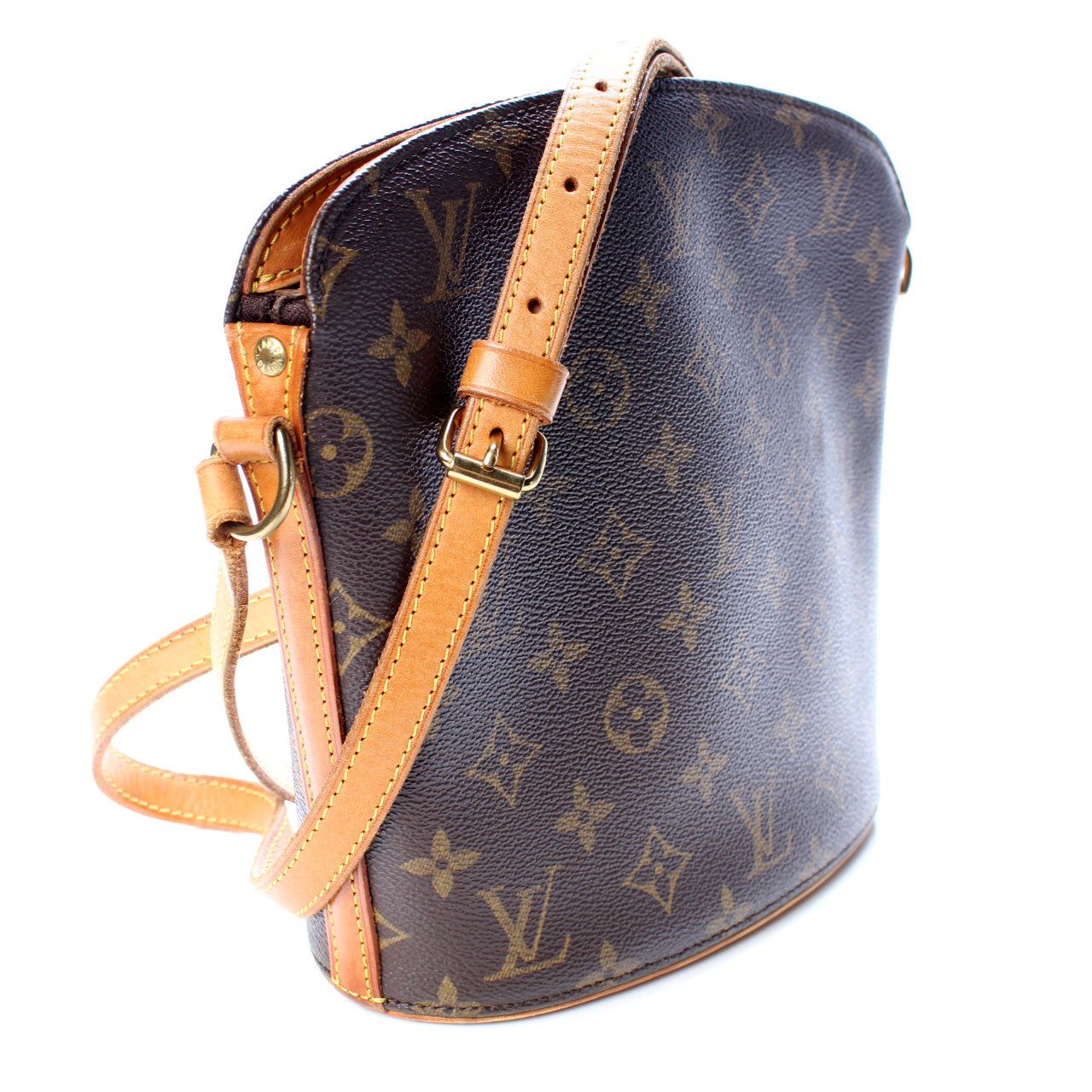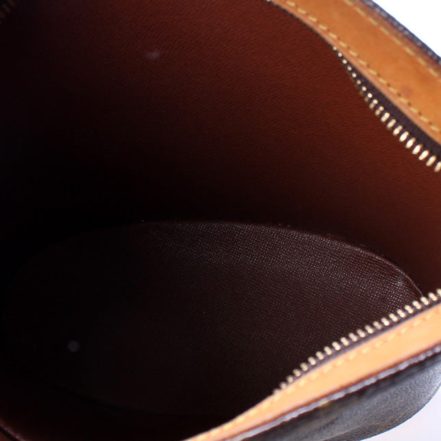 This pre-owned Louis Vuitton Drouot is guaranteed 100% authentic. The exterior is in the classic Louis Vuitton Monogram coated canvas.