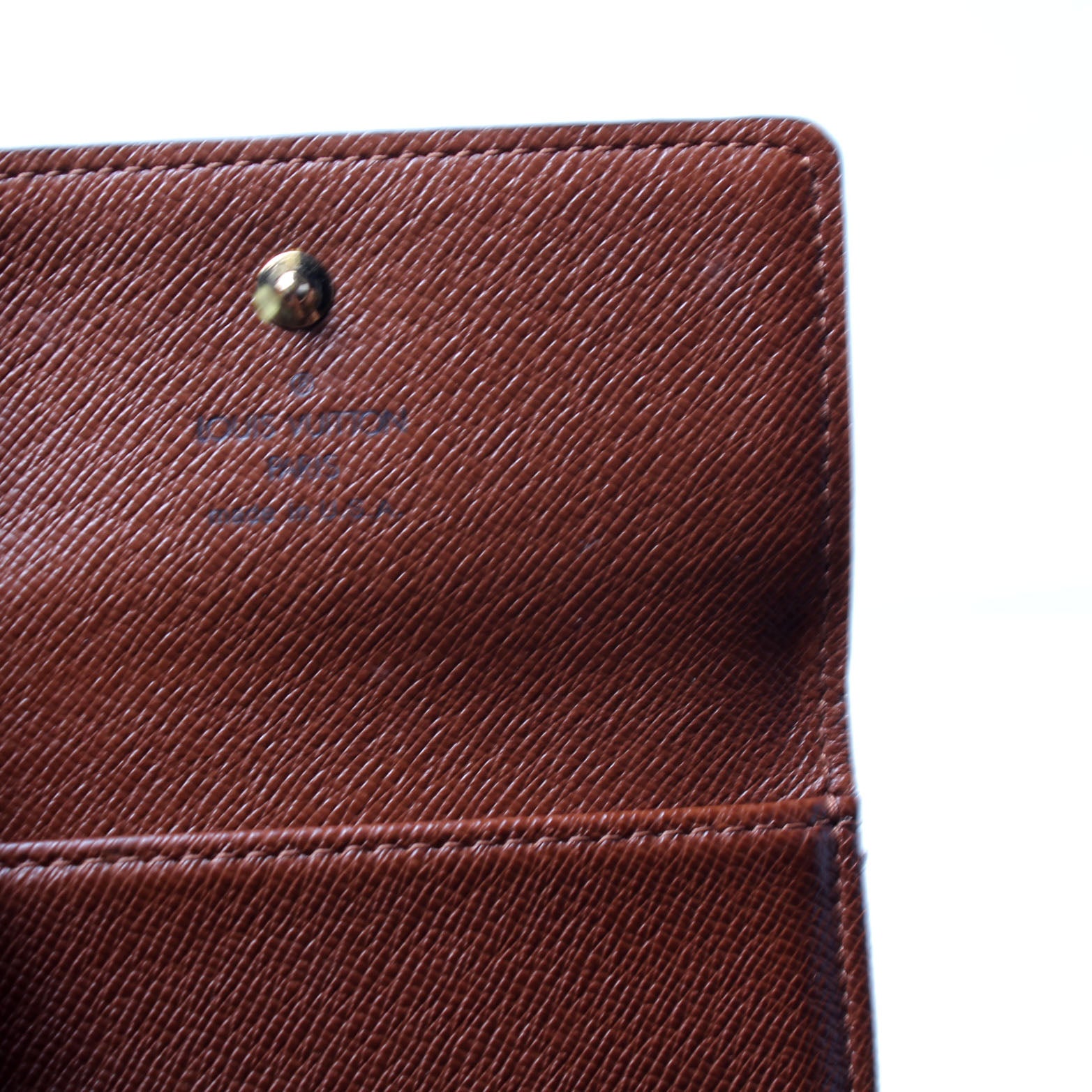 Interior: The interior is clean and free of rips or tears. The interior features one snap closure coin pouch, six card slots, and one bill slot.