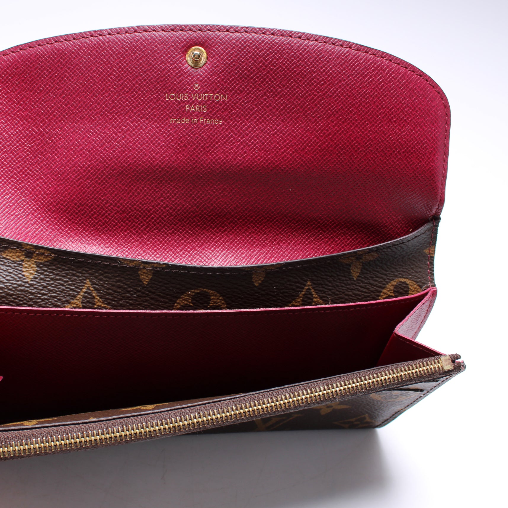 This pre-owned Louis Vuitton Emilie Wallet is guaranteed 100% authentic. The exterior is in the classic Louis Vuitton Monogram coated canvas.