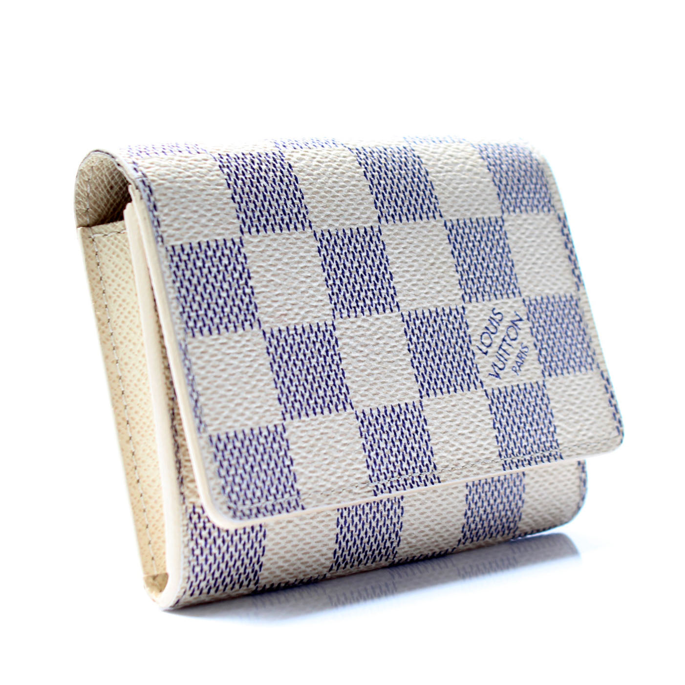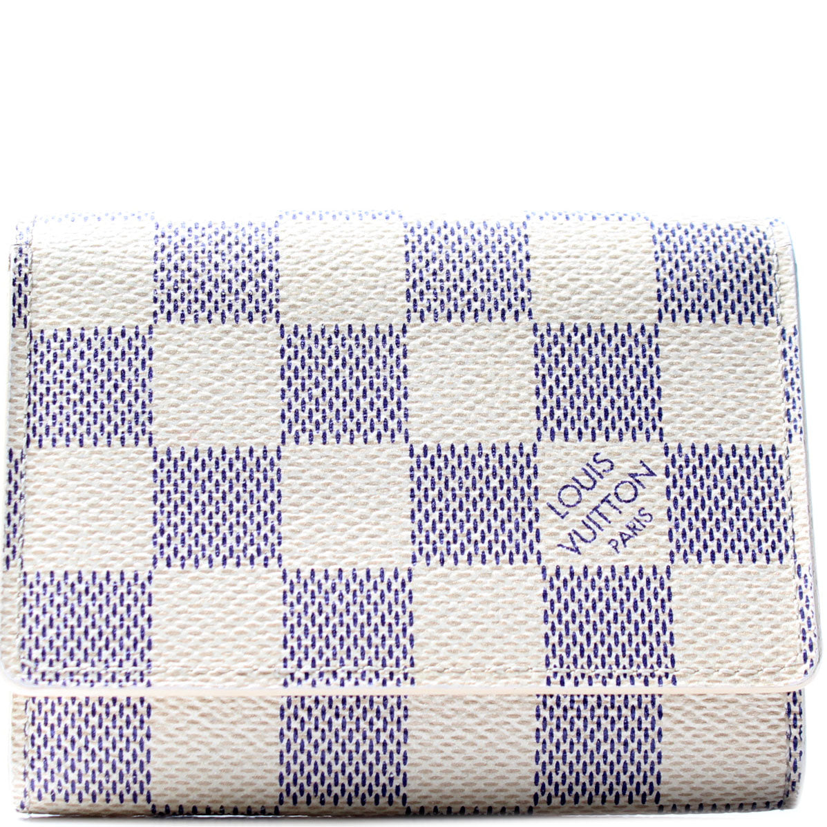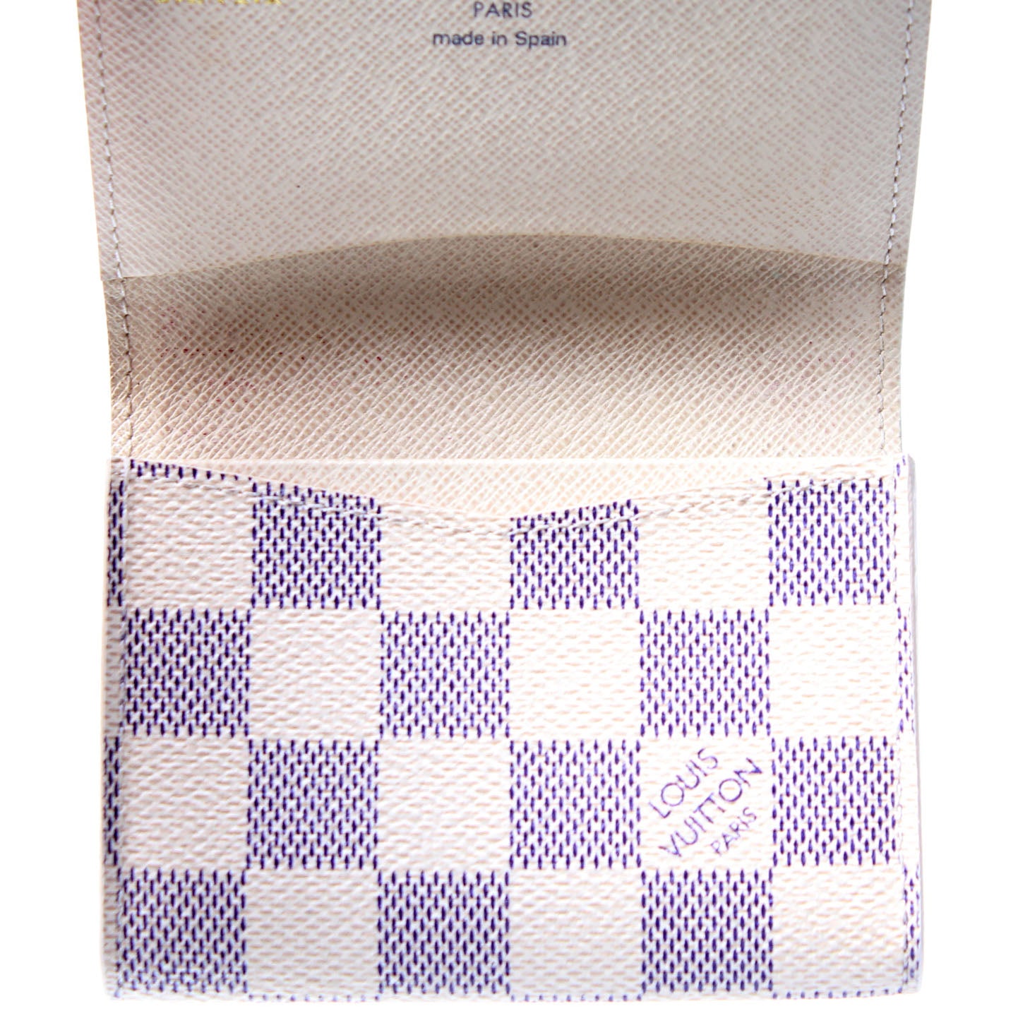 This pre-owned Louis Vuitton Enveloppe Cartes is guaranteed 100% authentic. The exterior is in the classic Louis Vuitton Damier Azur coated canvas.