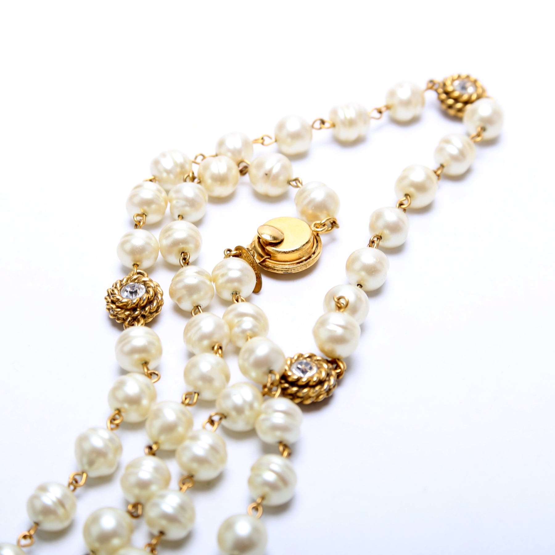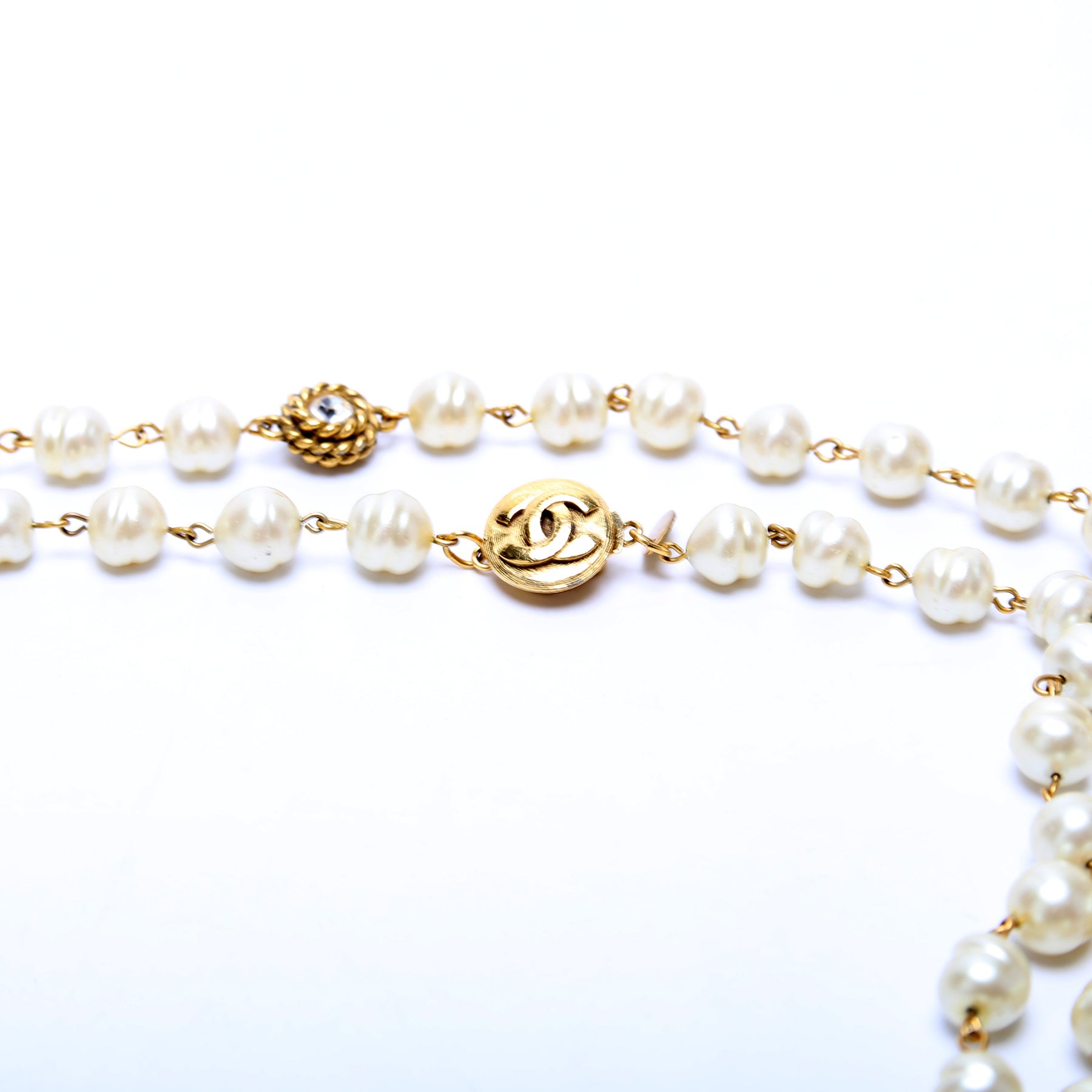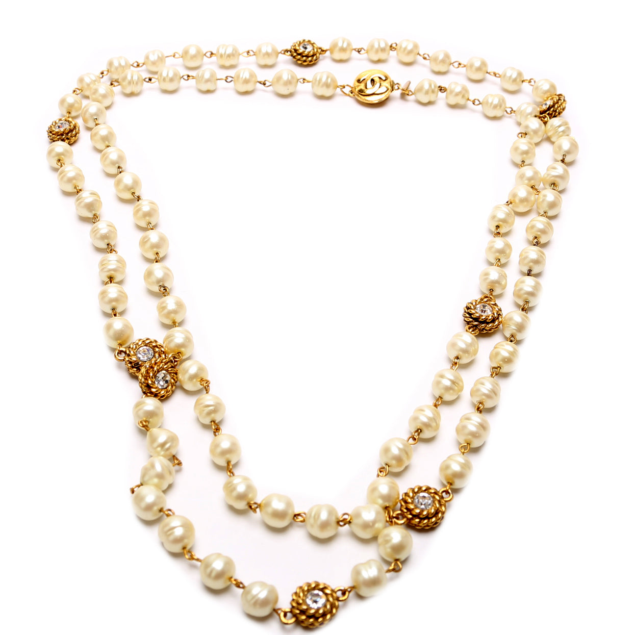 This pre-owned Chanel Faux Pearl And Crystal Long Wrap Necklace Vintage is guaranteed 100% authentic.