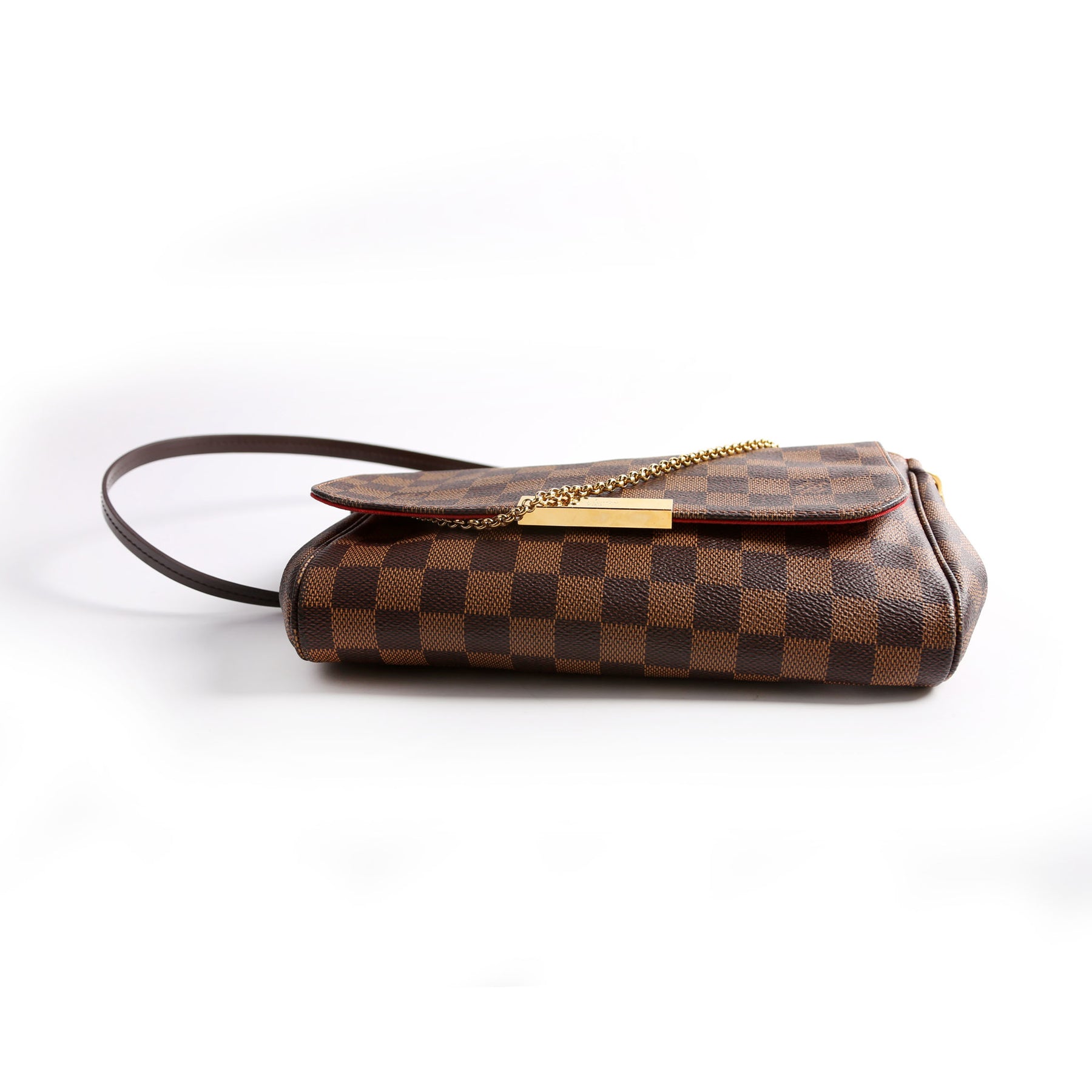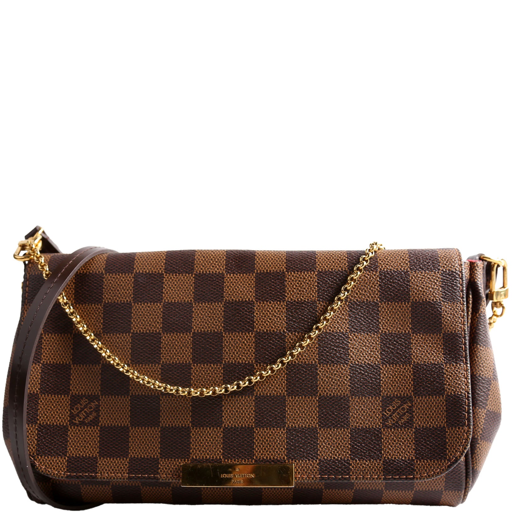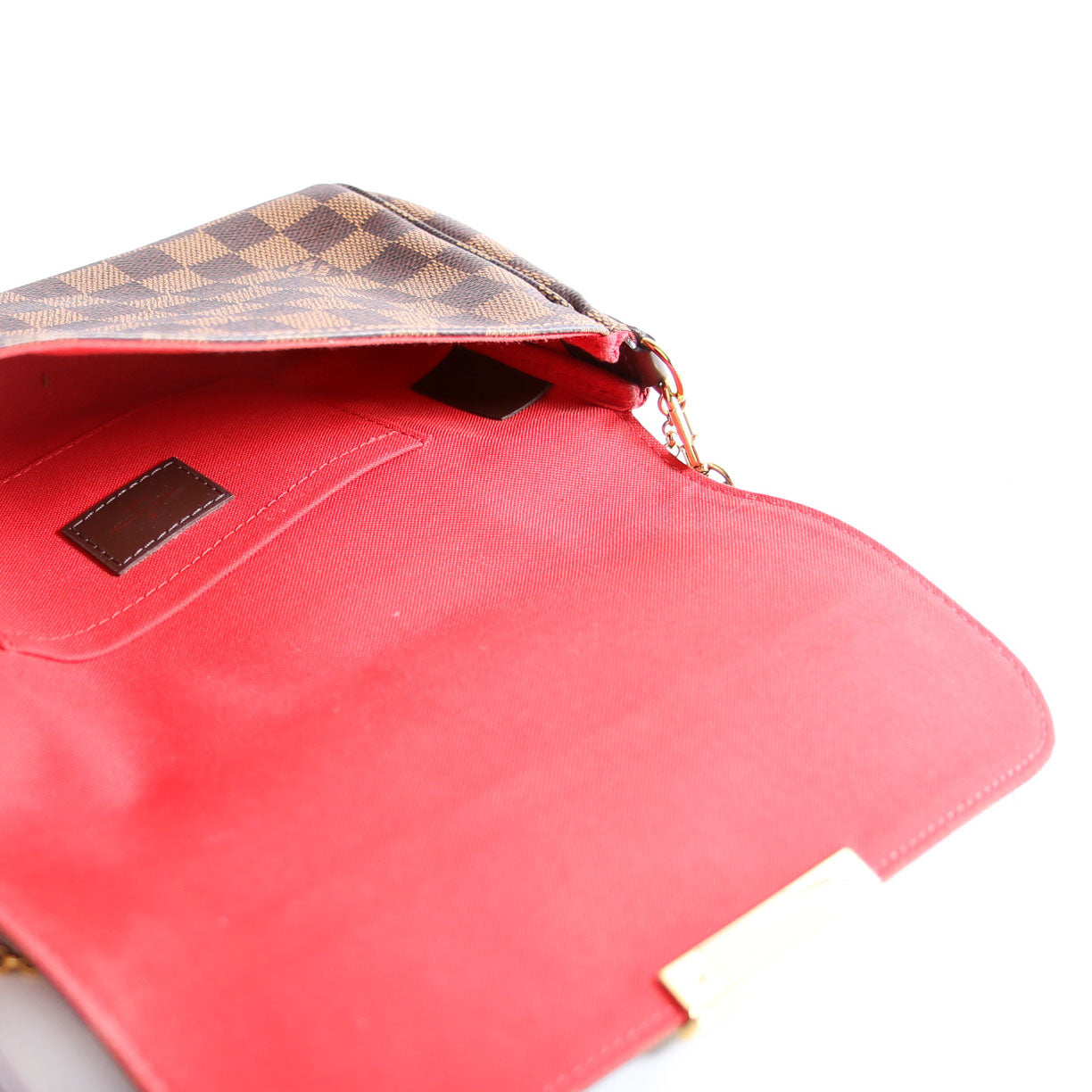 This pre-owned Louis Vuitton Favorite PM is guaranteed 100% authentic. The exterior is in the classic Damier Ebene coated canvas.