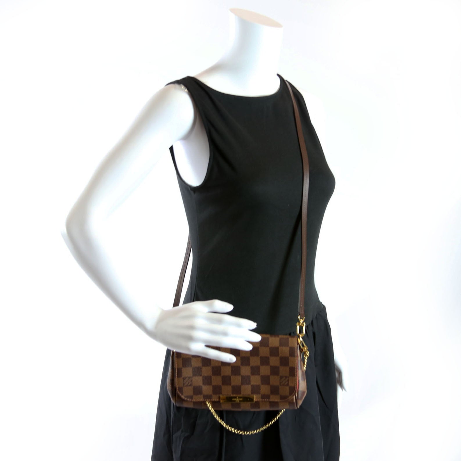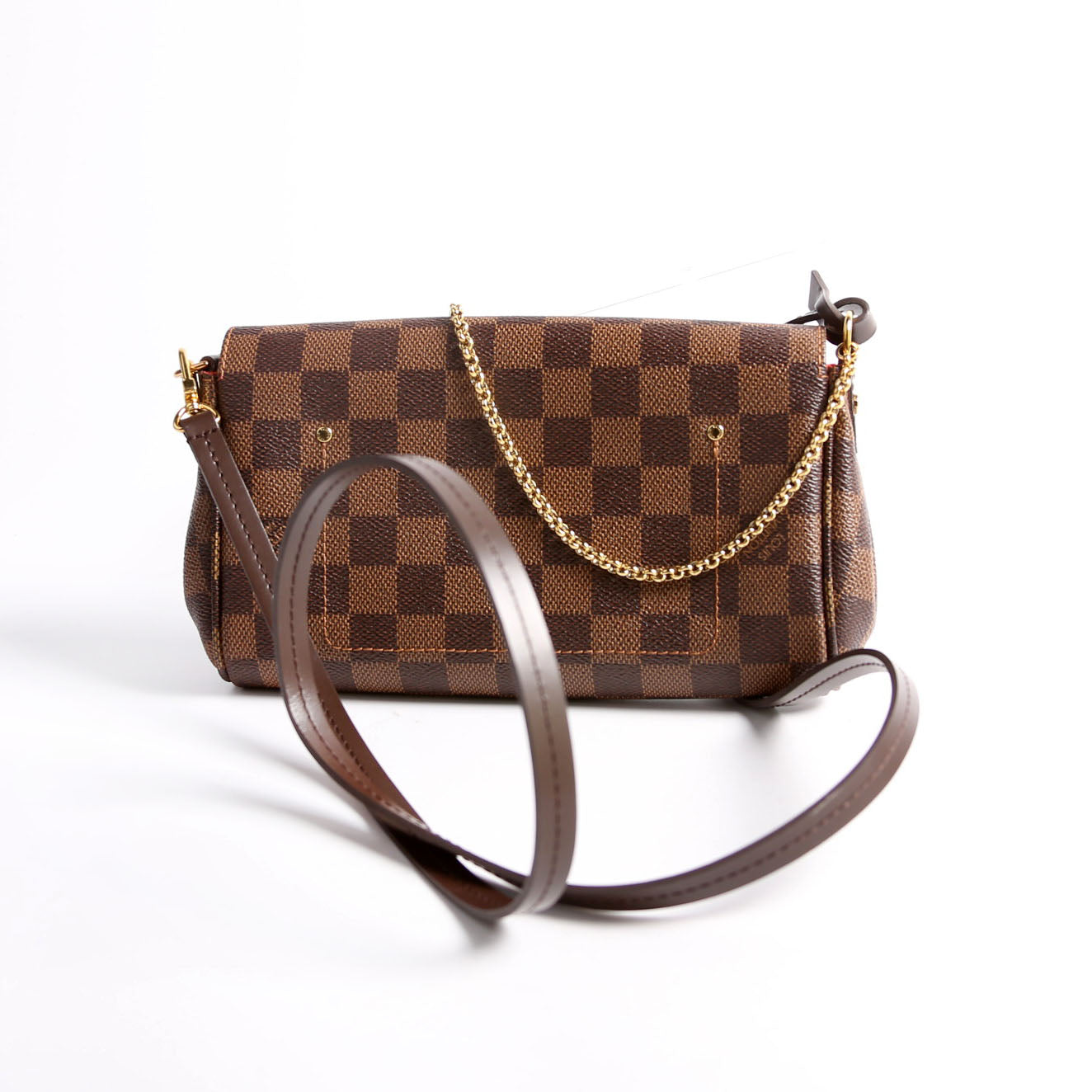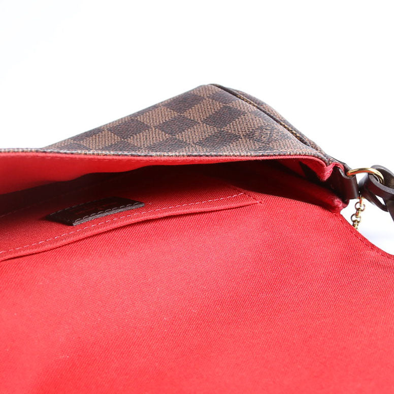 This pre-owned Louis Vuitton Favorite PM is guaranteed 100% authentic. The exterior is in the classic Louis Vuitton Damier Ebene coated canvas.