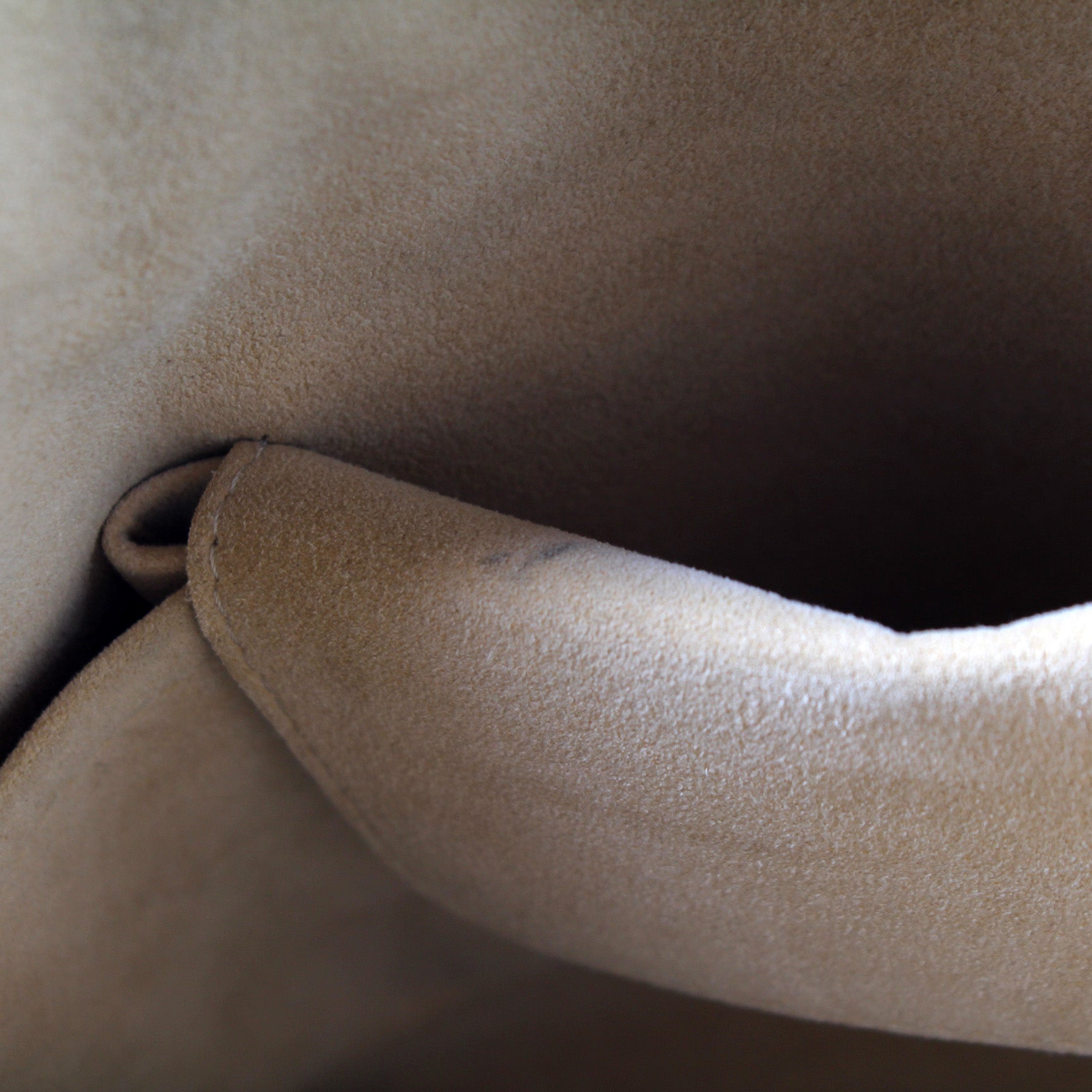 Interior: The interior shows is free of rips or tears. The interior features two open pockets and one snap closure pocket. The interior fabric has minor discoloration and pen marks.