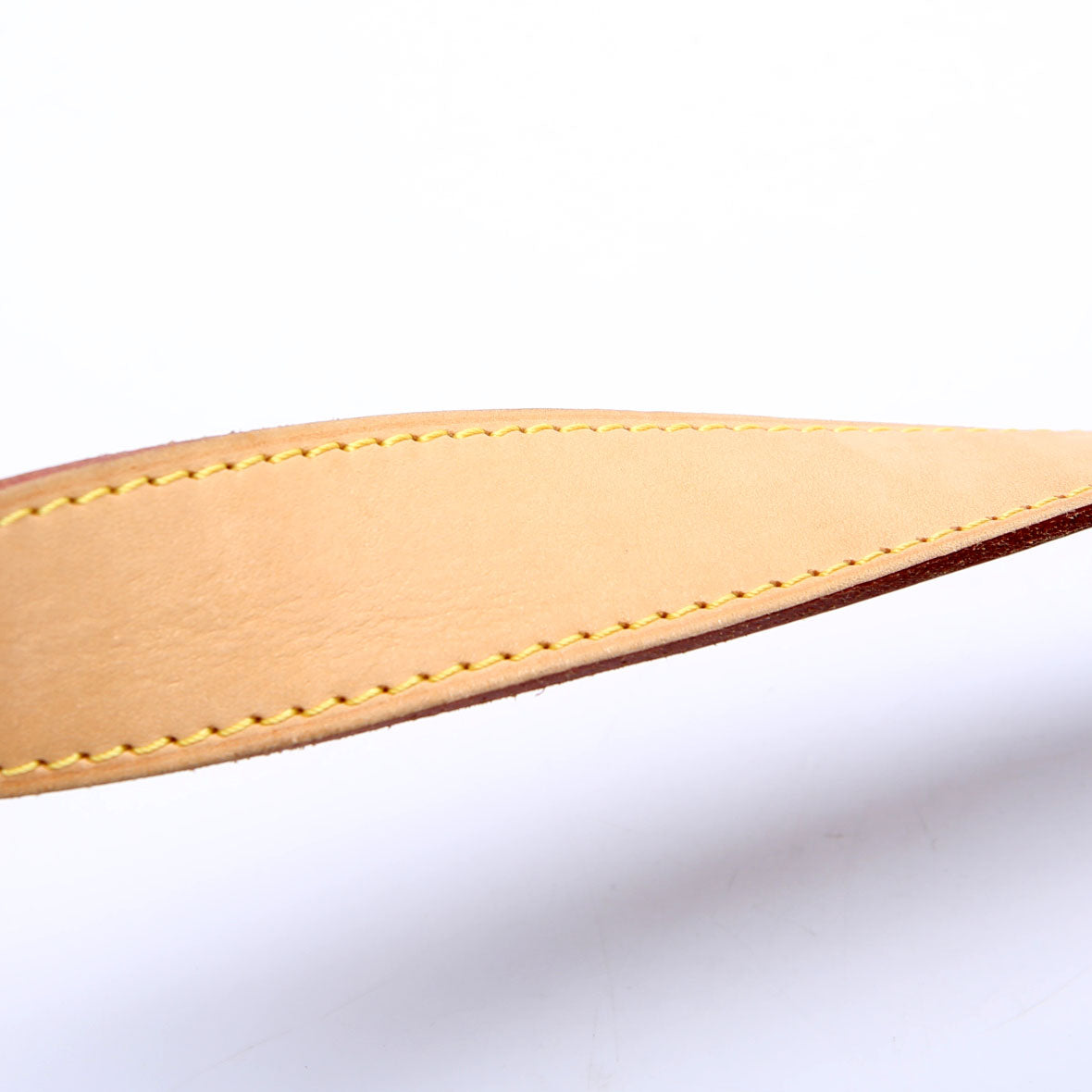 Handle: The leather handle shows discoloration and wear. There is heavy discoloration by the hardware.