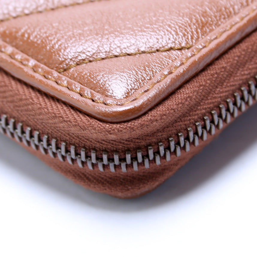 Interior: The interior is clean and free of rips or tears. The interior features twelve card slots, three bill slots, and one zip closure coin pouch.