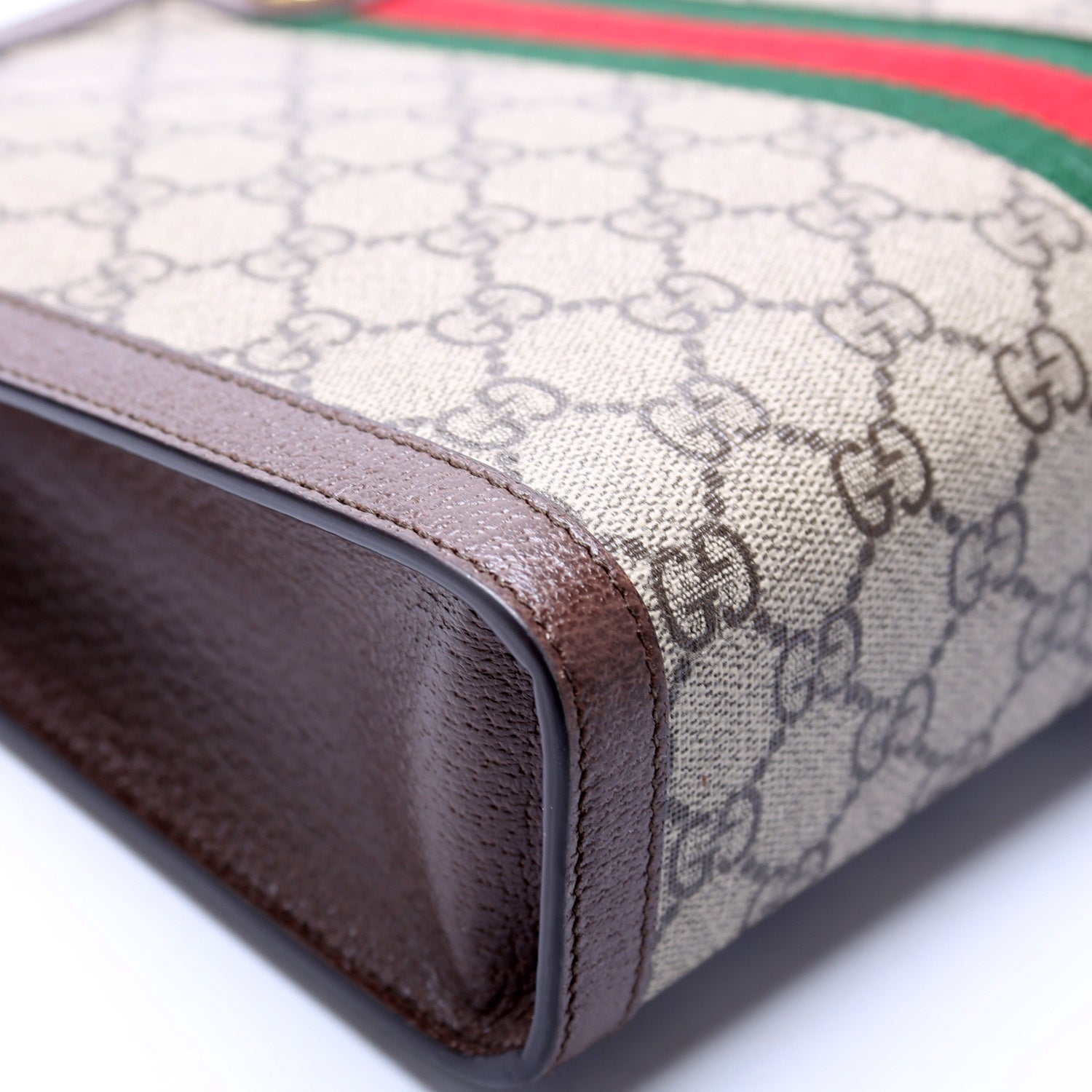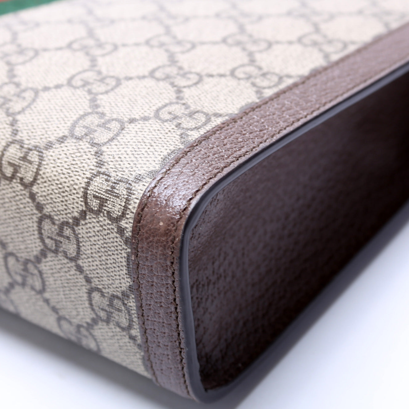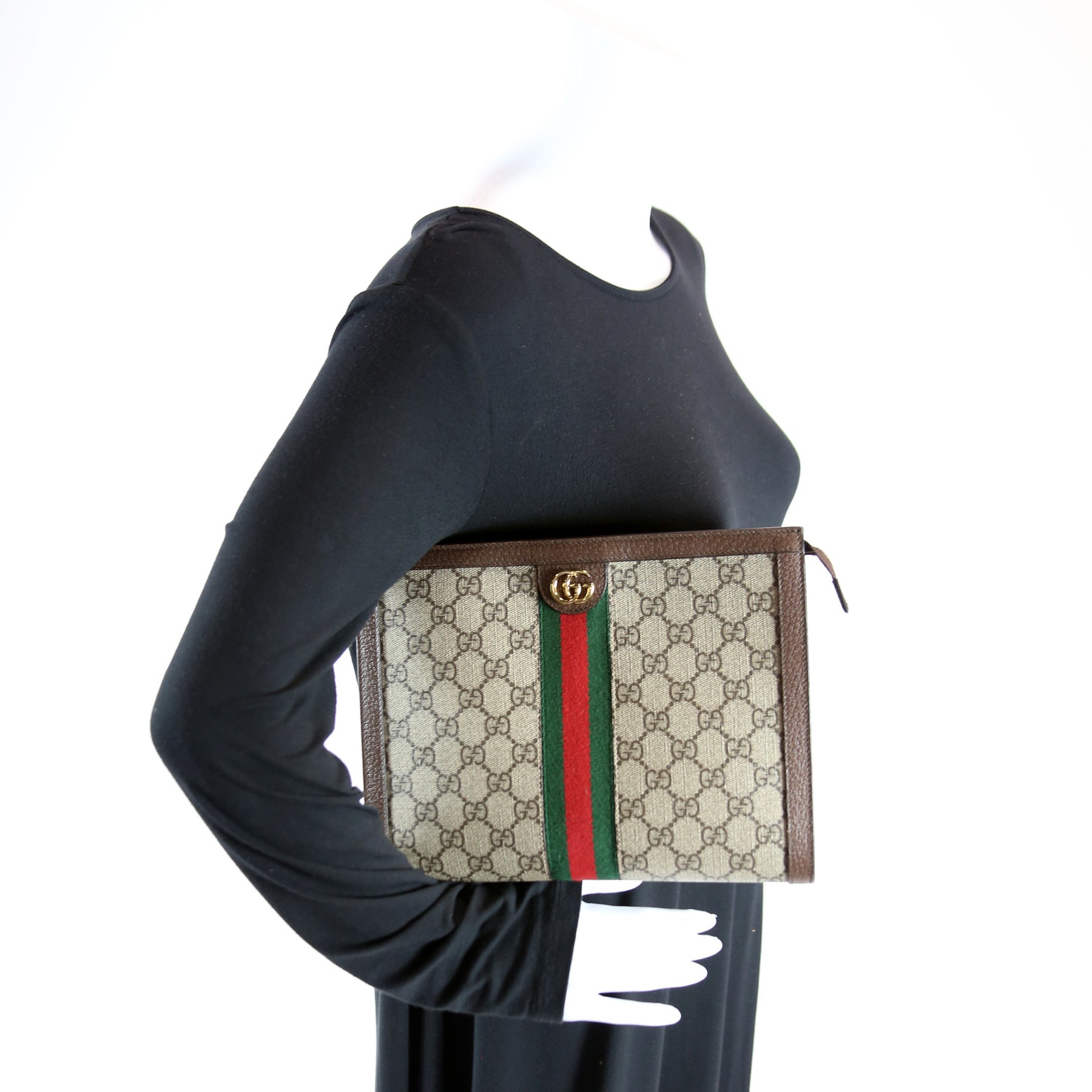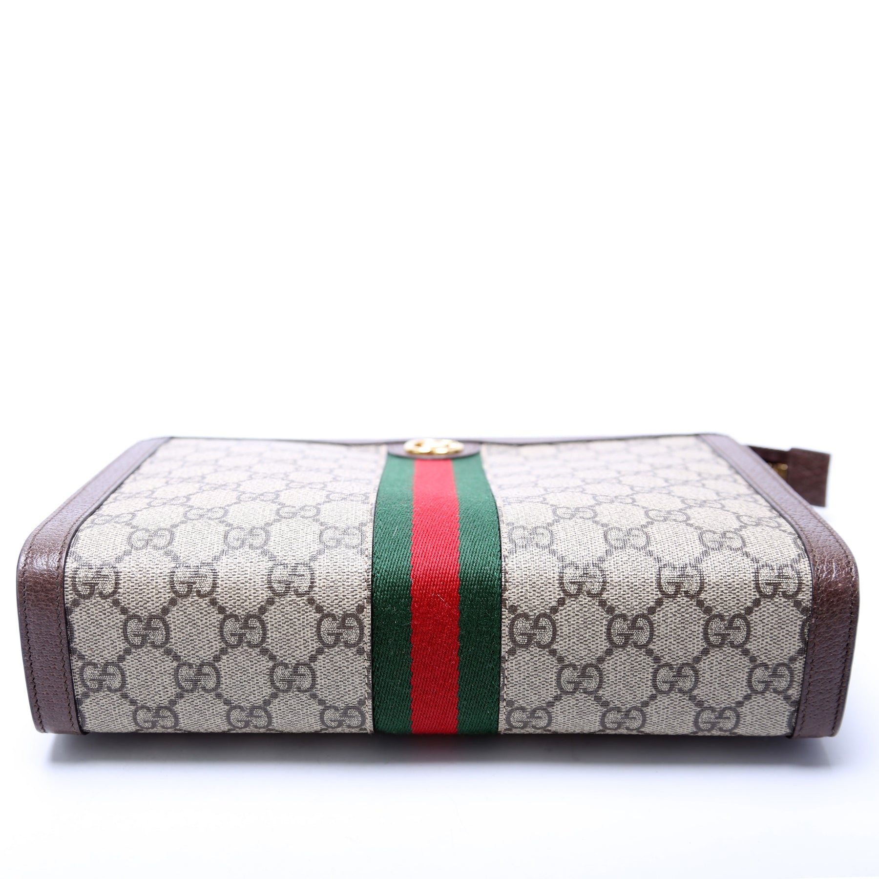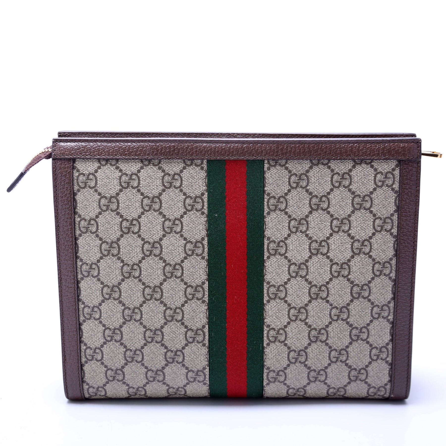 This pre-owned Gucci GG Supreme Ophidia Zip Pouch is guaranteed 100% authentic. The exterior is in the classic GG Supreme coated canvas.