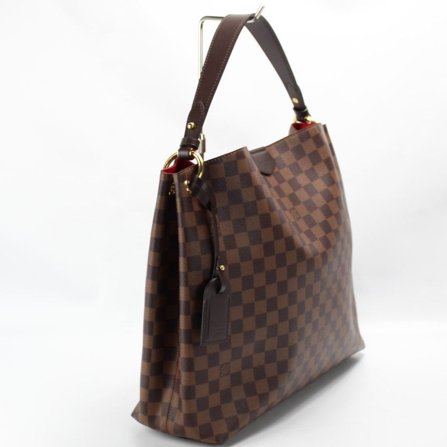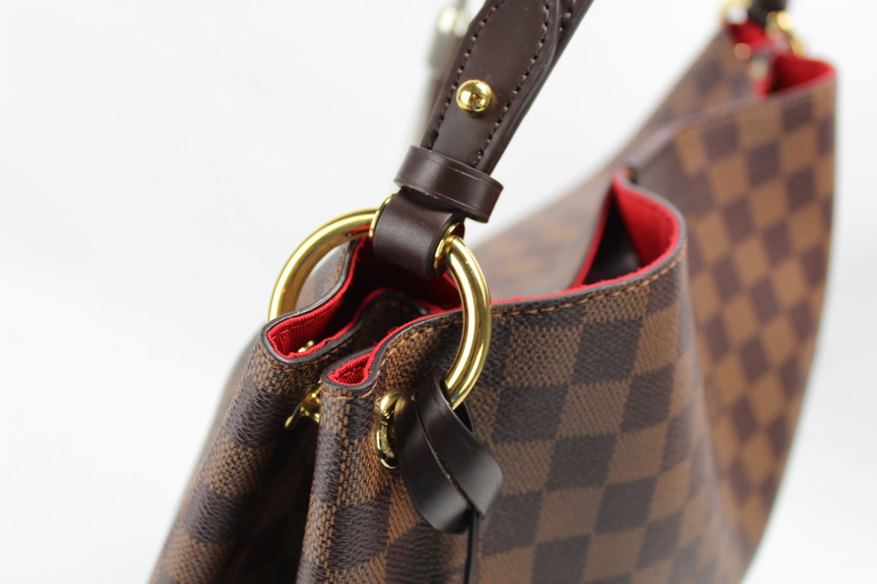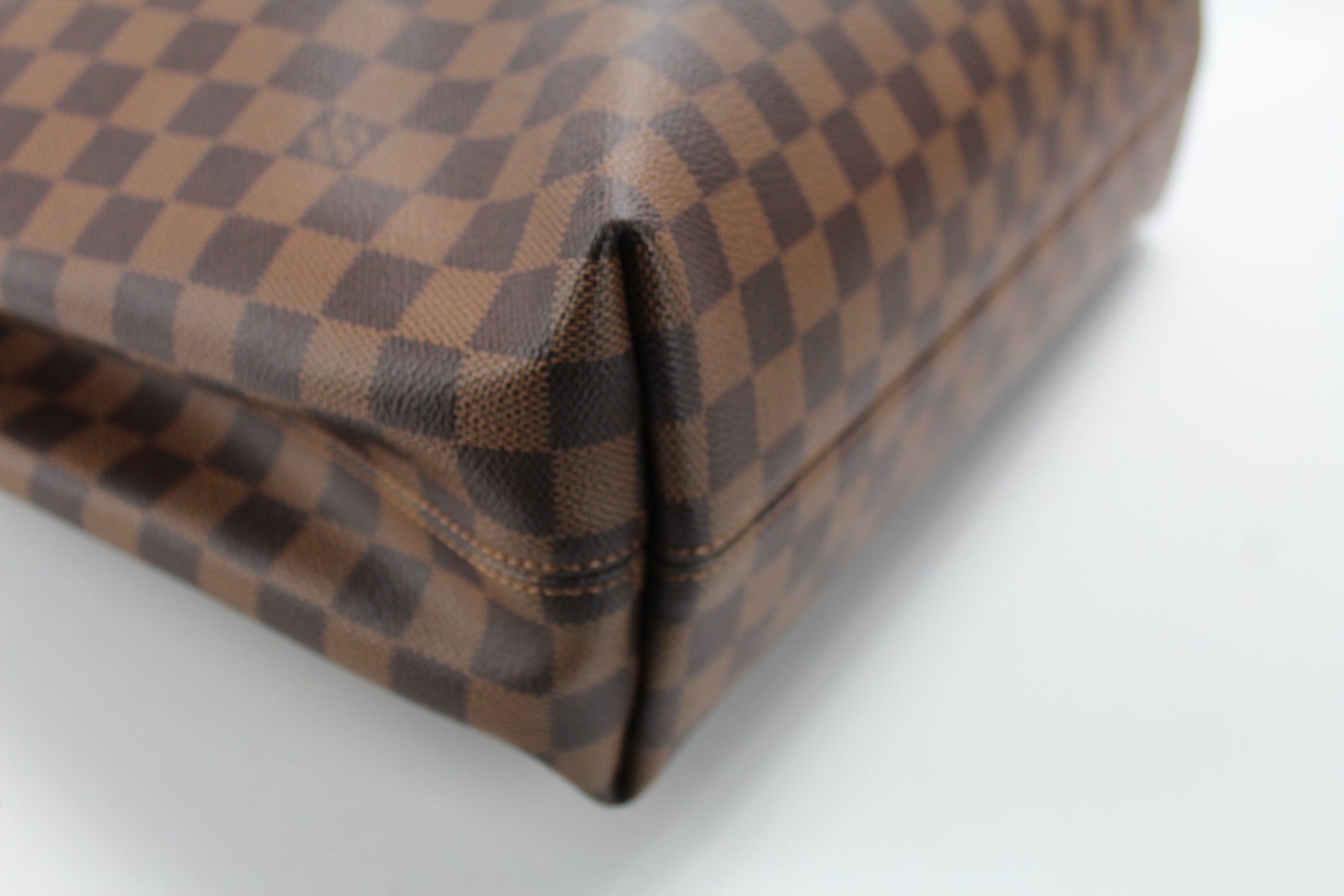 This pre-owned Louis Vuitton Gracefull MM is guaranteed 100% authentic. The exterior is in the classic Damier Ebene coated canvas.