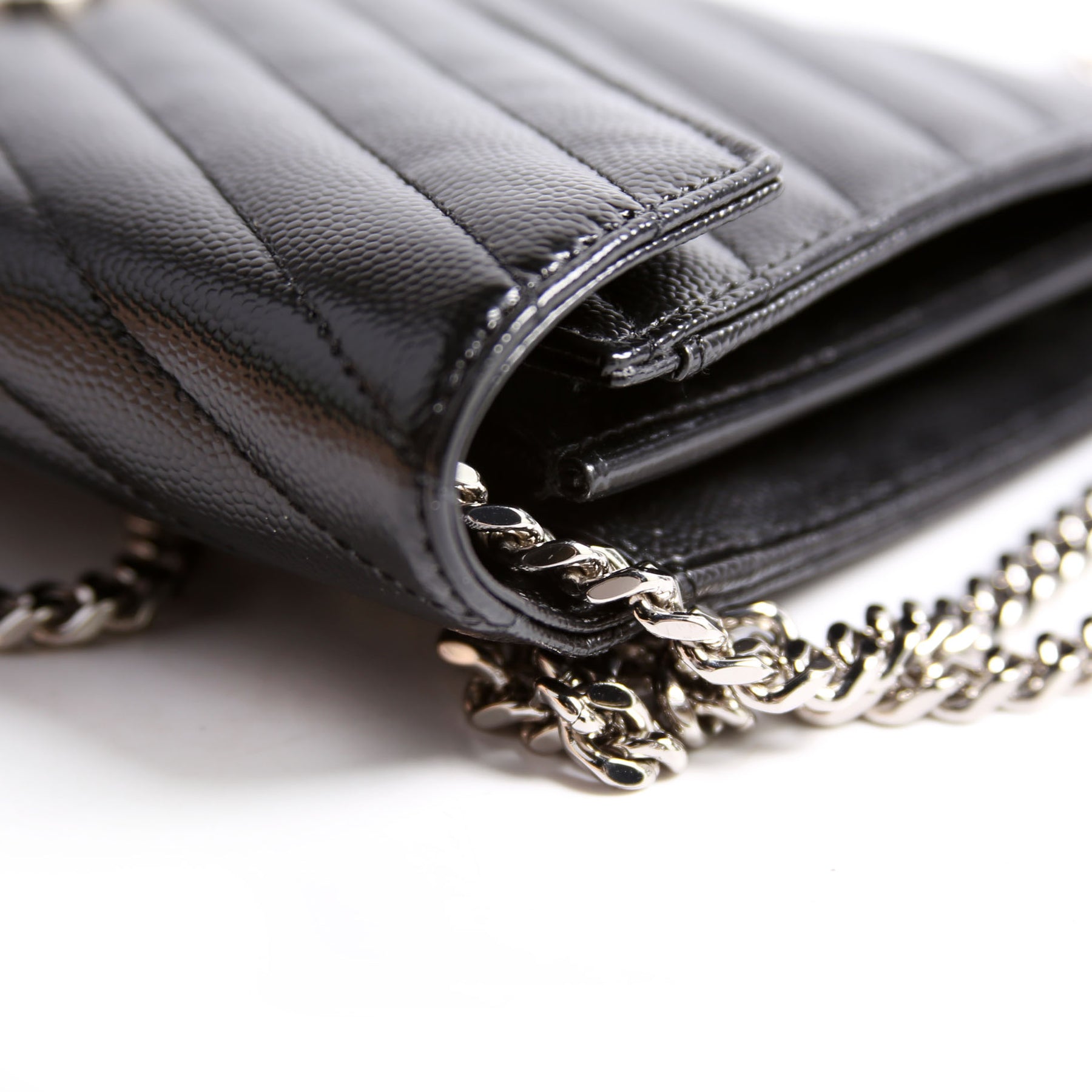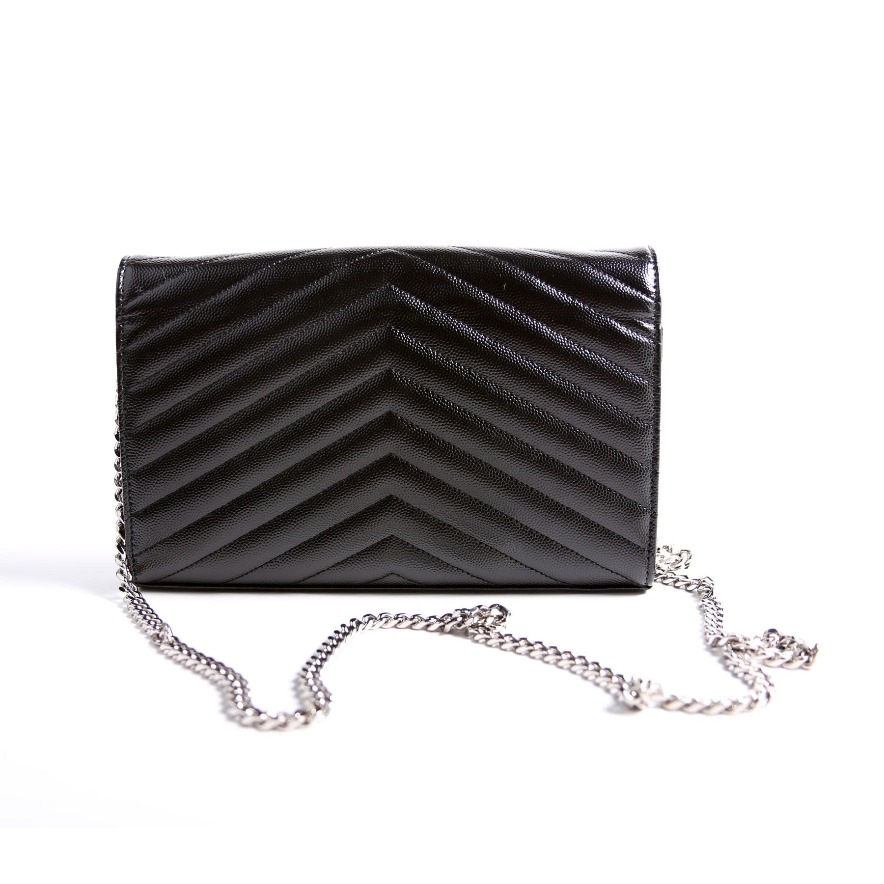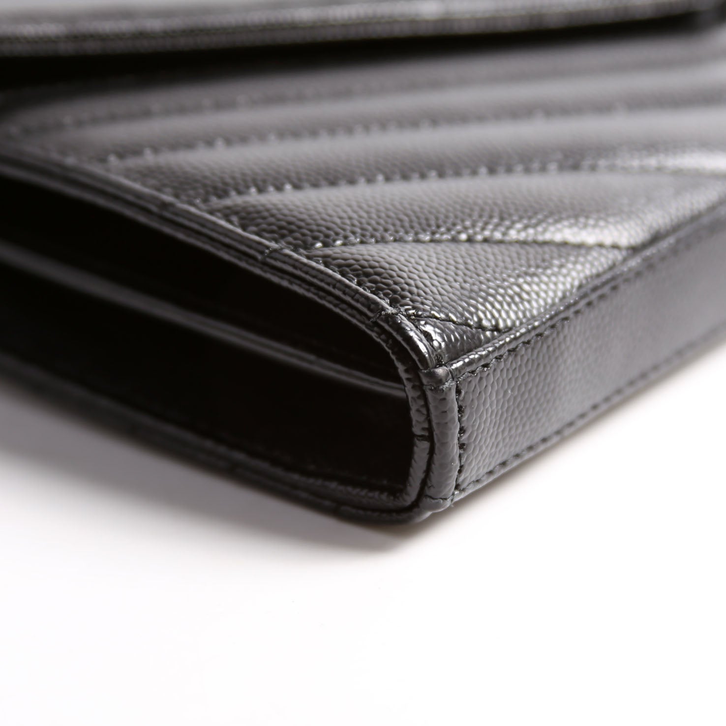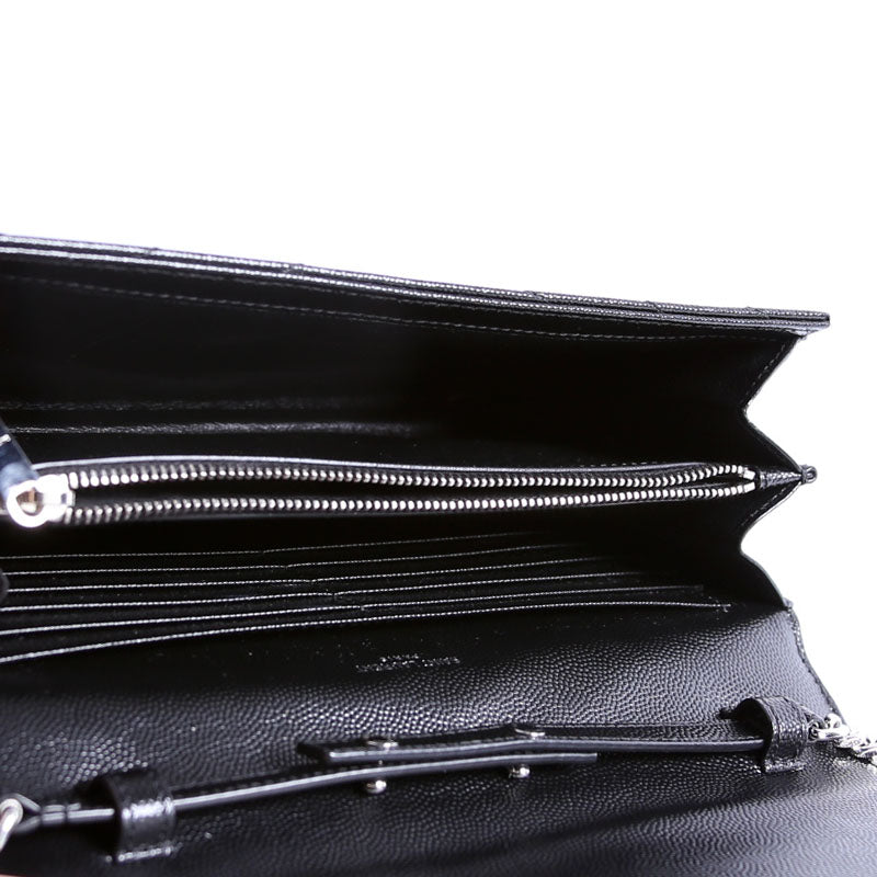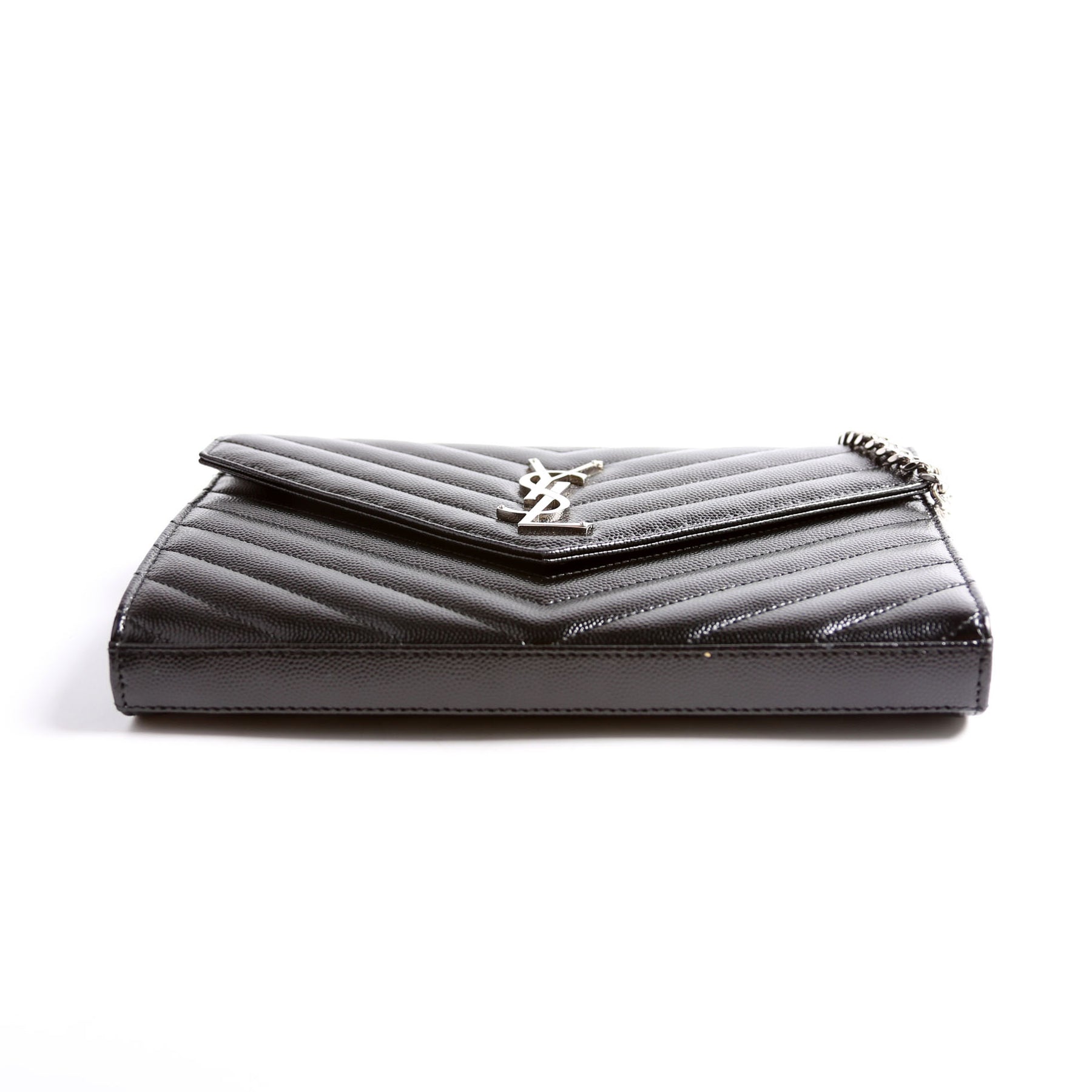 This pre-owned Saint Laurent Grain De Chain Wallet is guaranteed 100% authentic. The exterior is in the classic Saint Laurent Grain De Poudre leather.
