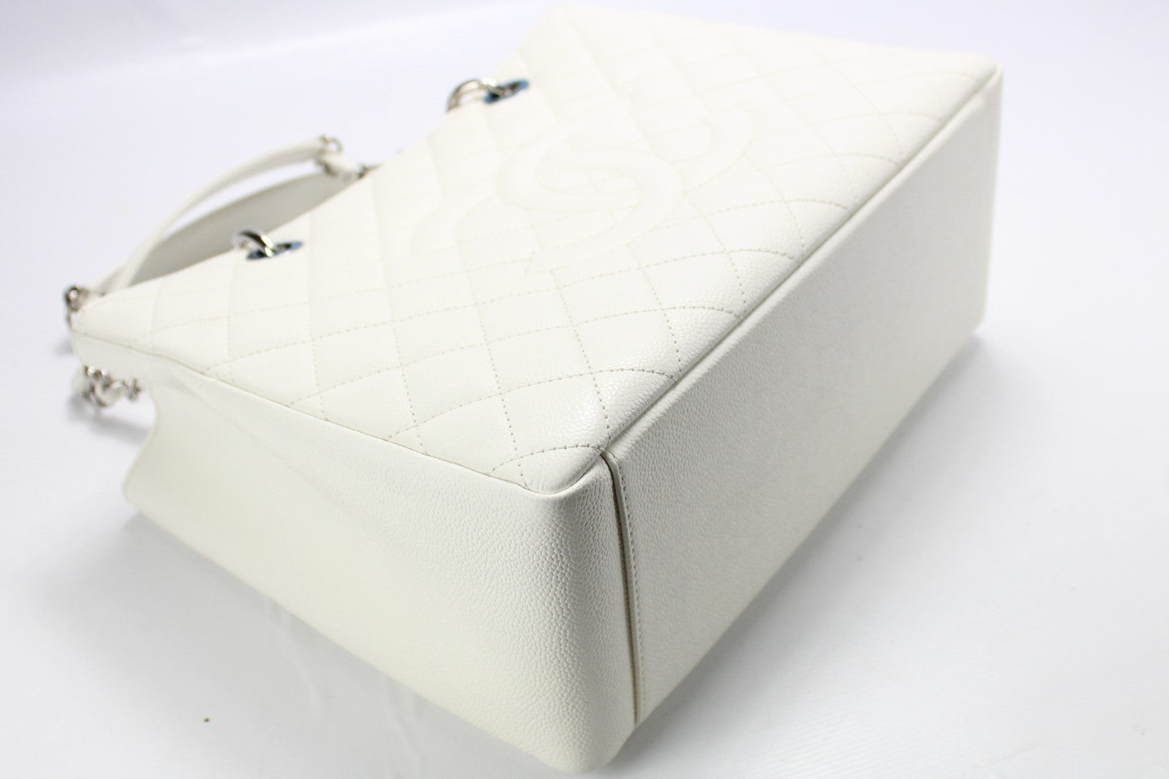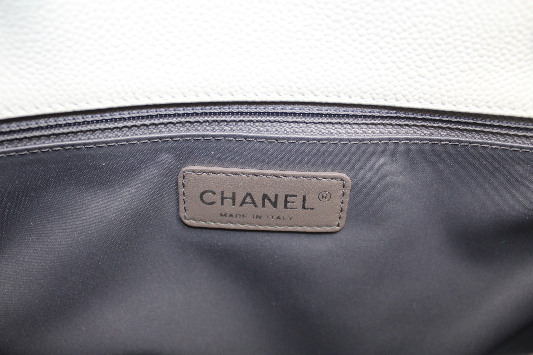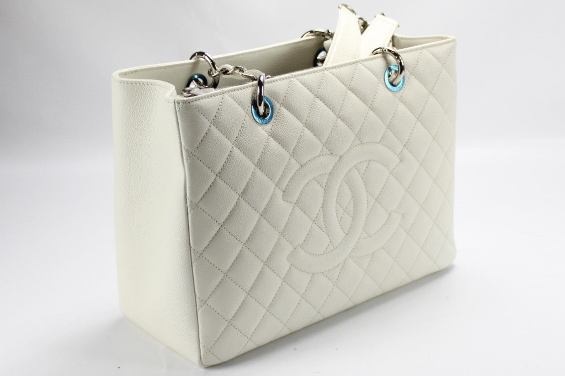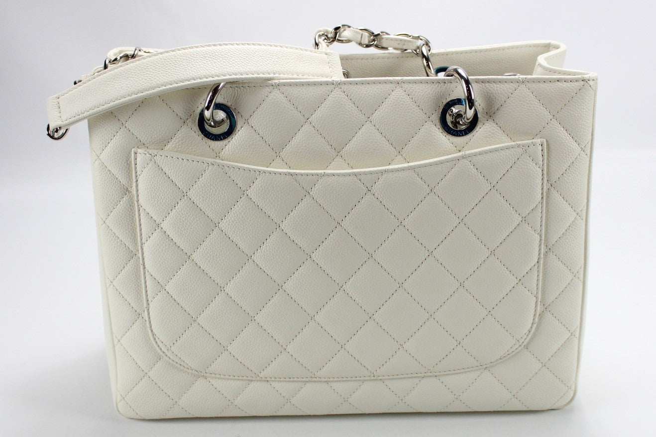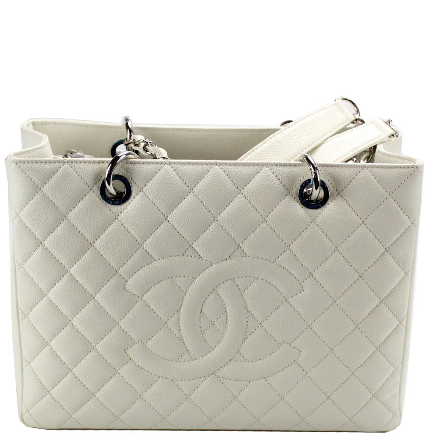 This pre-owned Chanel Grand Shopping Tote is guaranteed 100% authentic. The exterior is in the classic Chanel Caviar leather.
