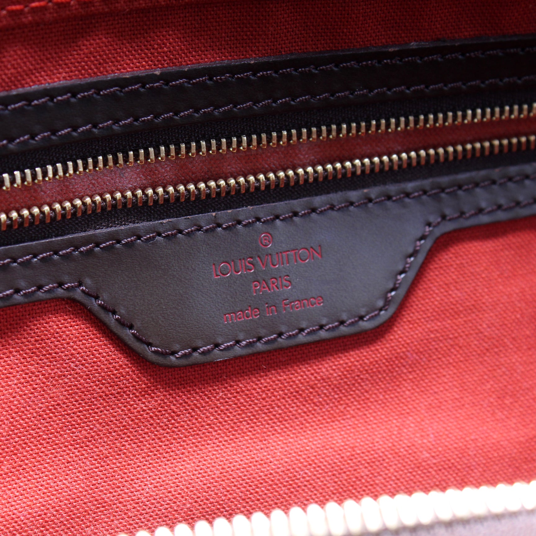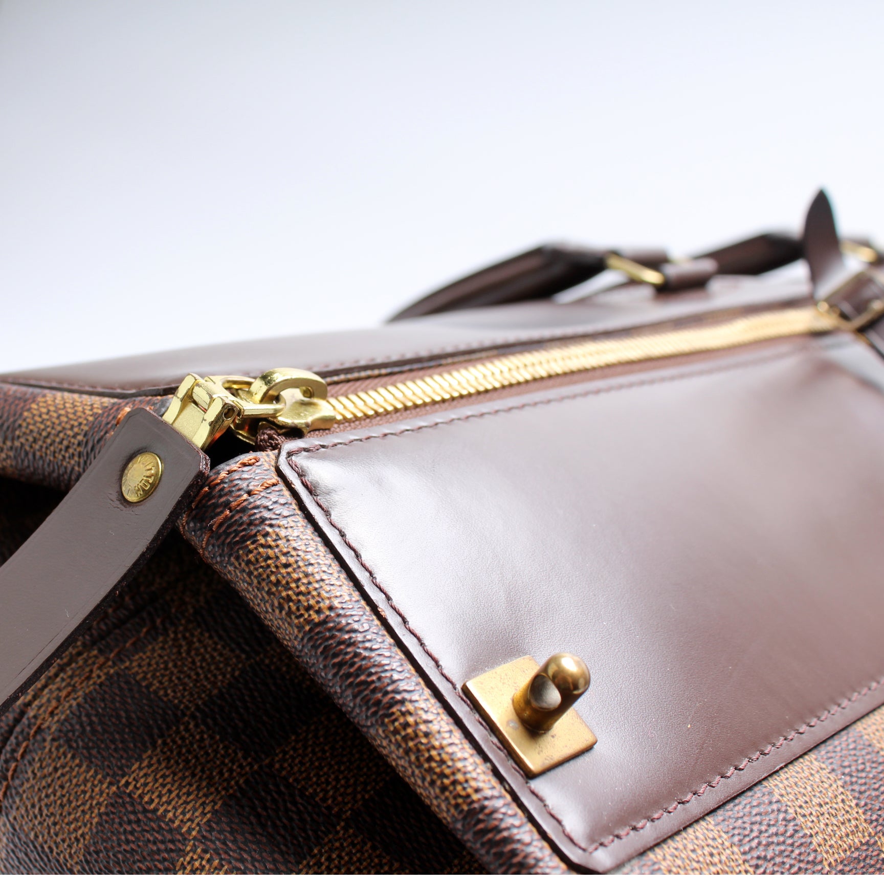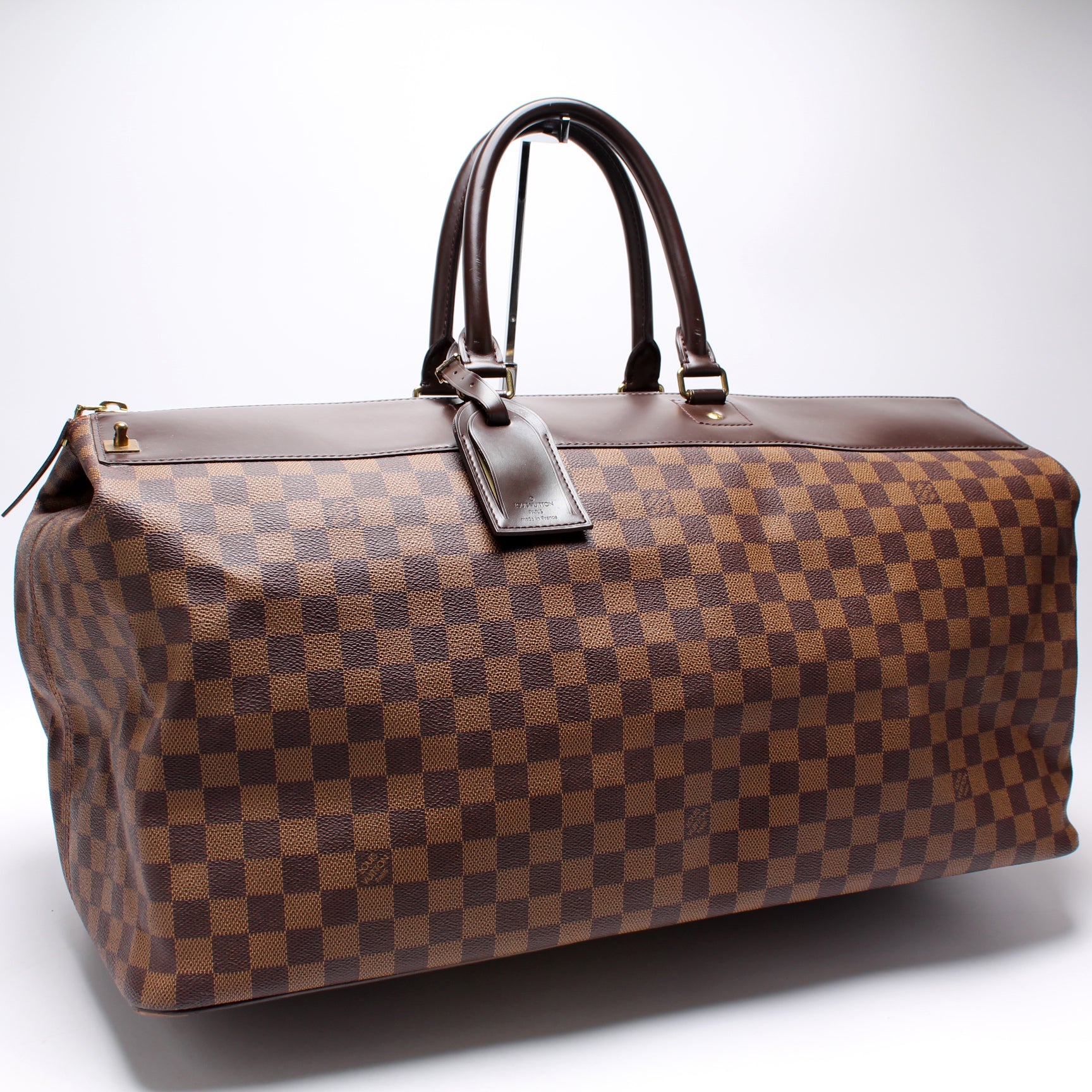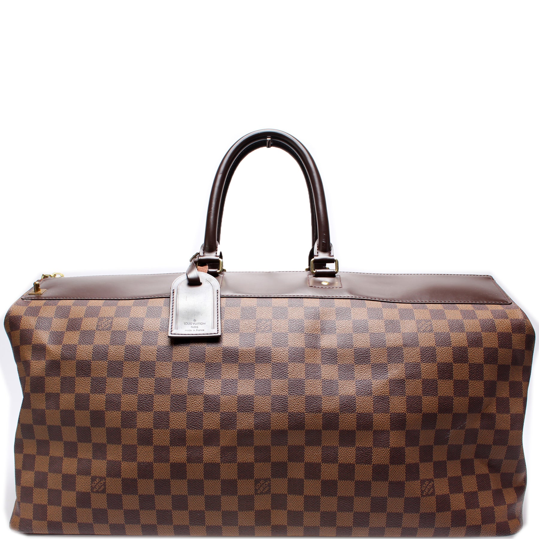 This pre-owned Louis Vuitton Greenwich GM is guaranteed 100% authentic. The exterior is in the classic Louis Vuitton Damier Ebene coated canvas.