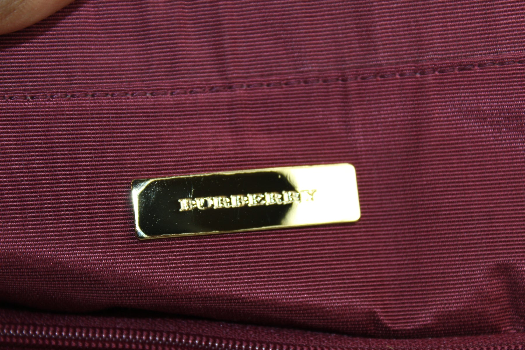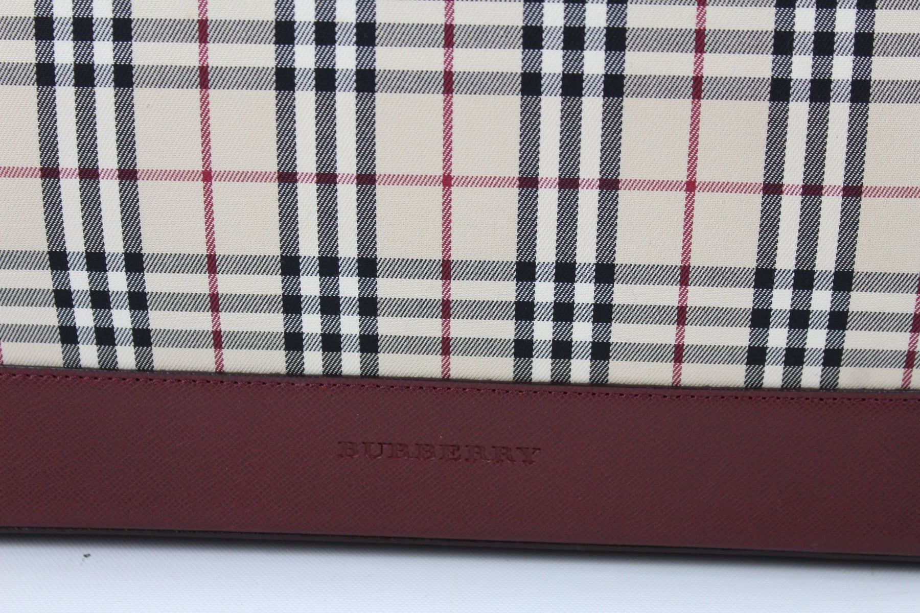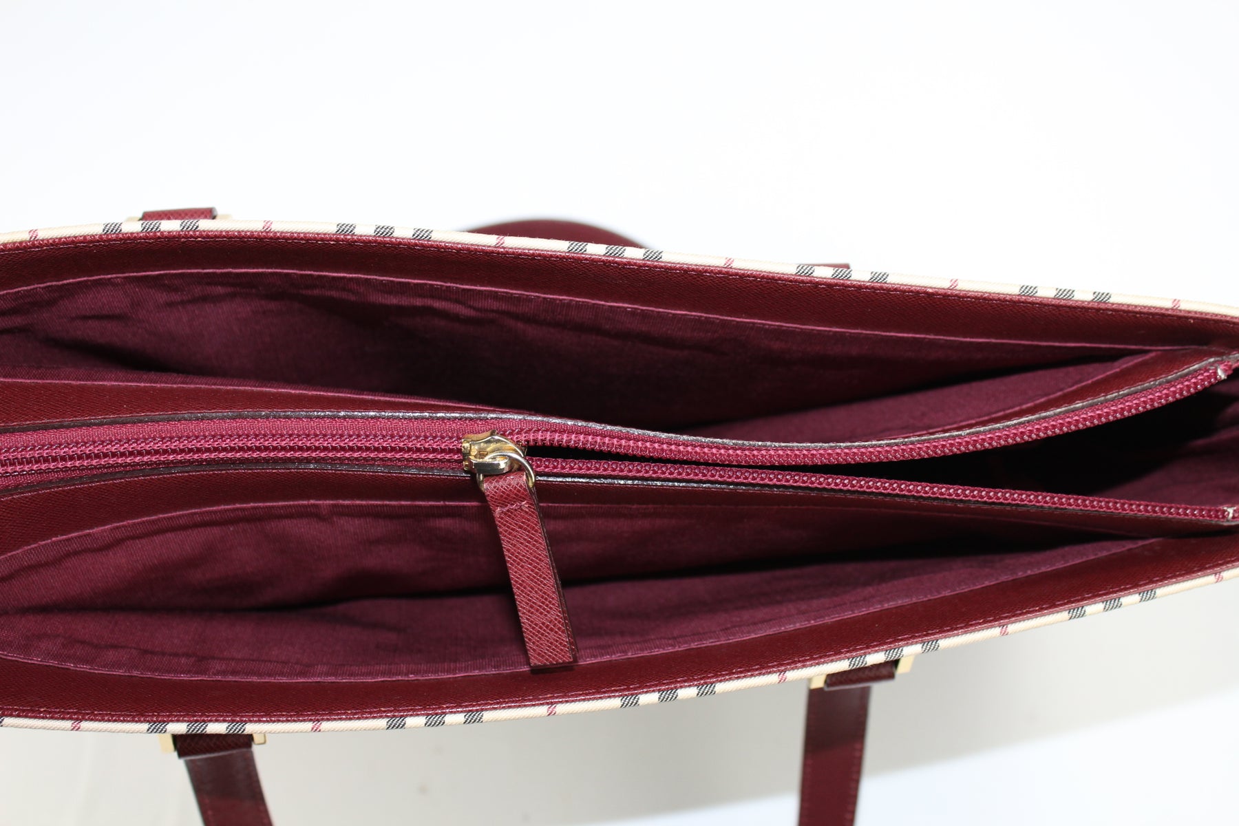 This pre-owned Burberry Hay-market Tote is guaranteed 100% authentic. The exterior is in the classic Burberry signature canvas.