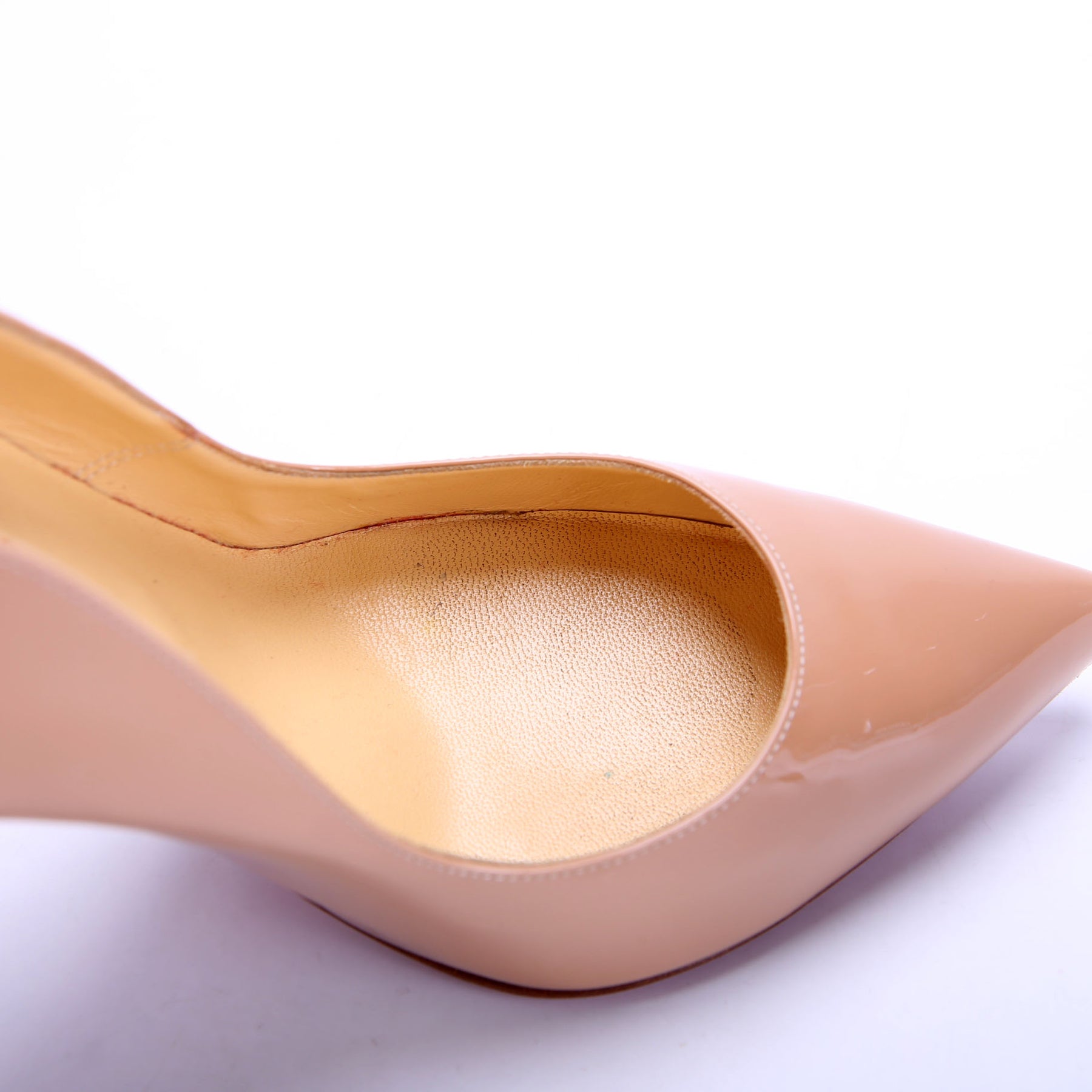 Interior: The interior has light to moderate wear and discoloration near the toe of the shoe.