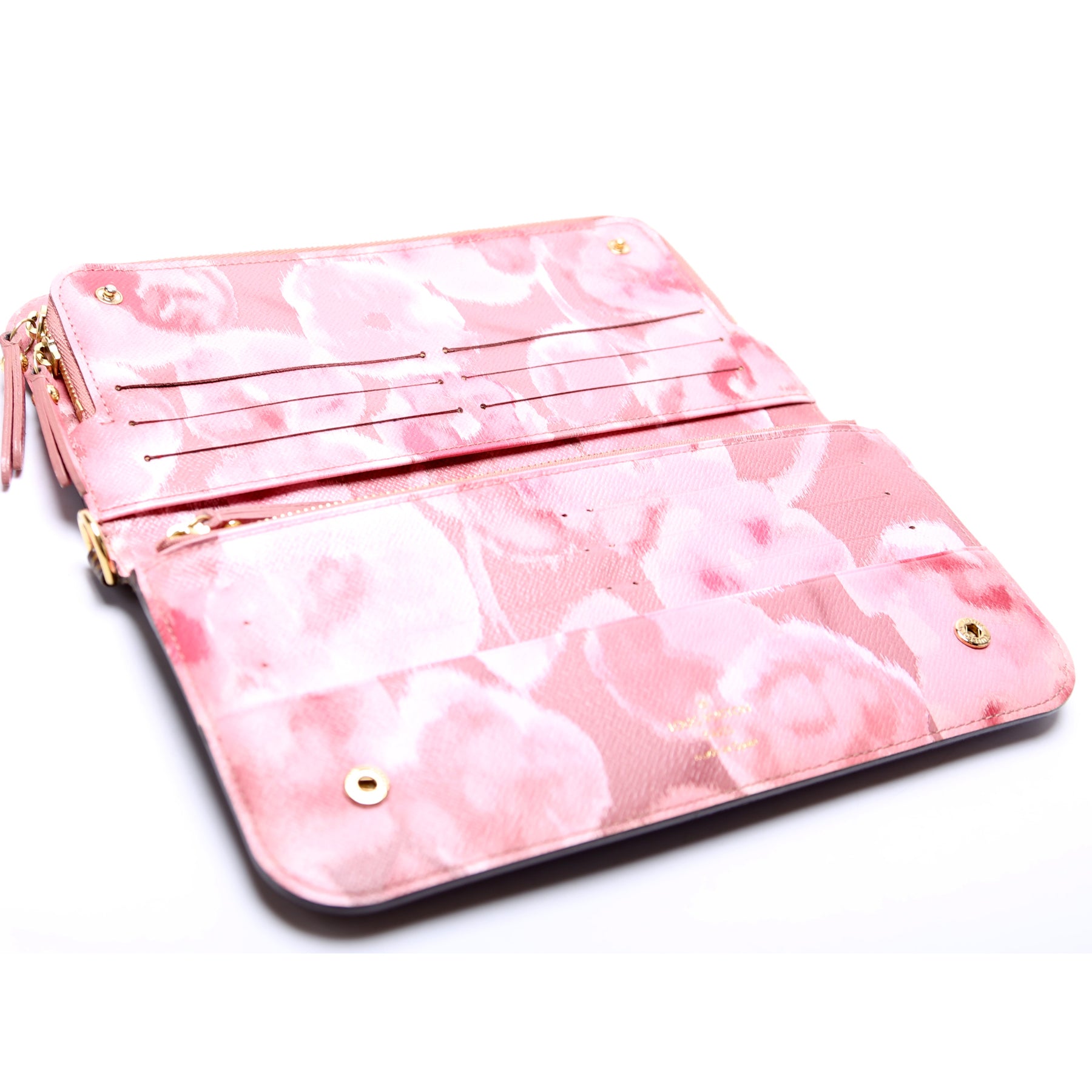 Interior: The interior is clean. The interior features twelve card slots, two zip closure coin pouches, two bill slots, and one additional open pocket.