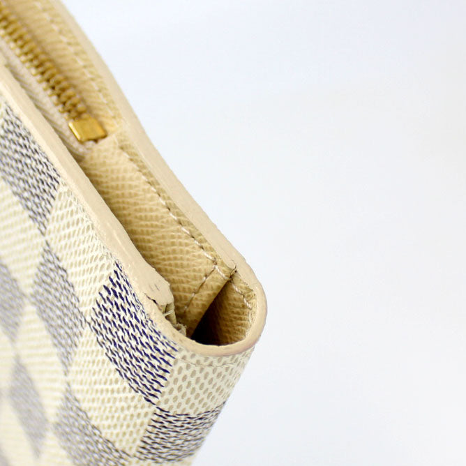 This pre-owned Louis Vuitton Melie is guaranteed 100% authentic. The exterior is in the classic Louis Vuitton Damier Azur coated canvas.