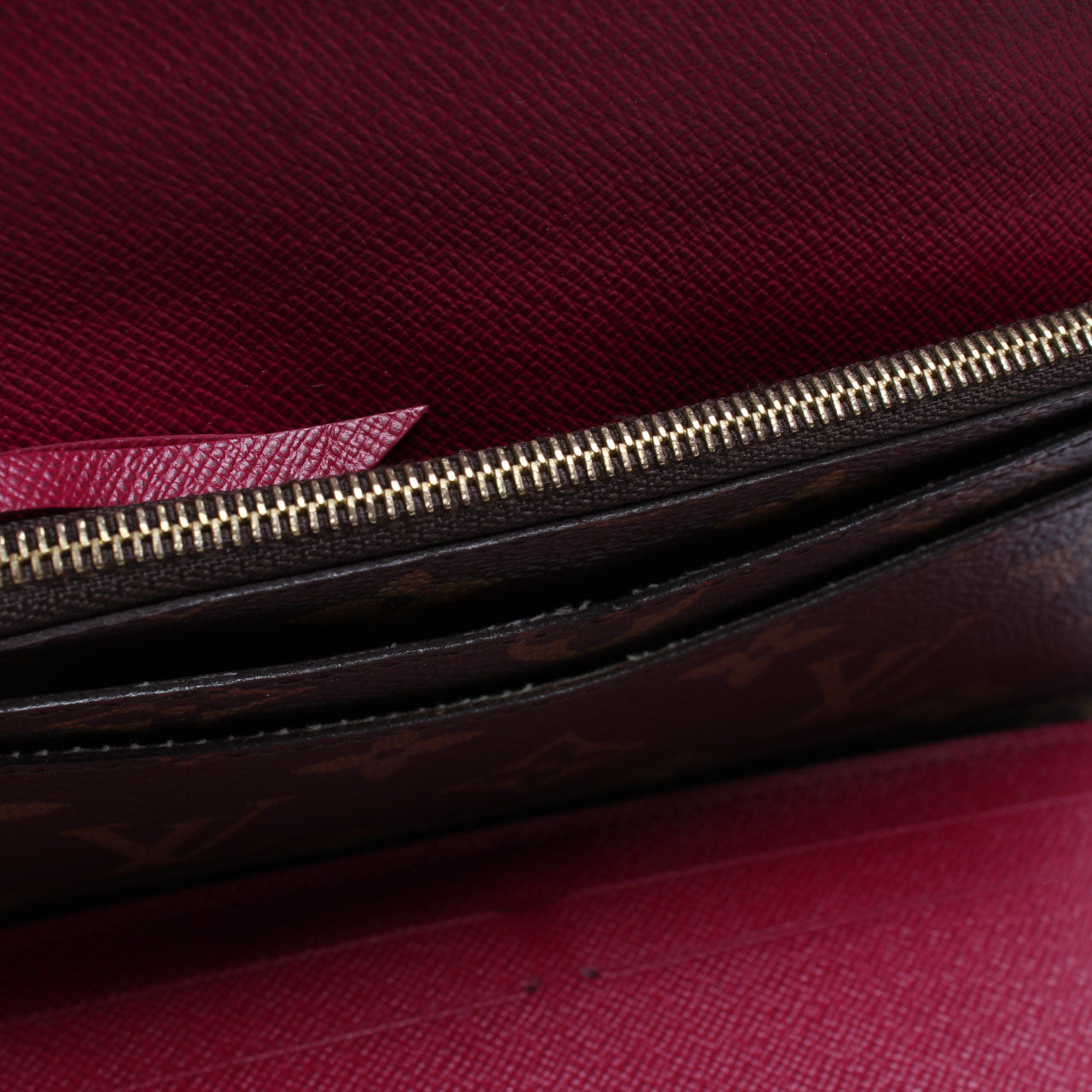 Interior: The interior is clean and free of rips or tears. The interior features four card slots, one removable zip pouch, and three bill slots.