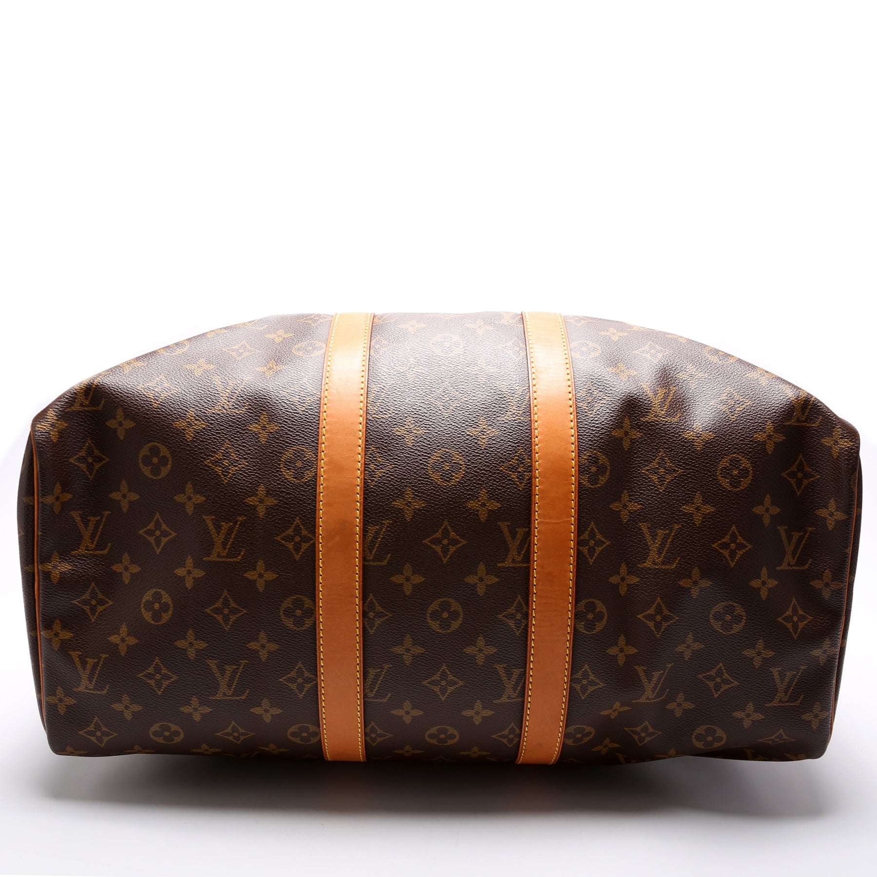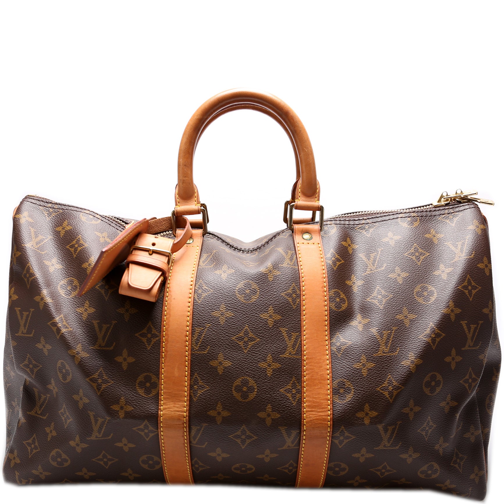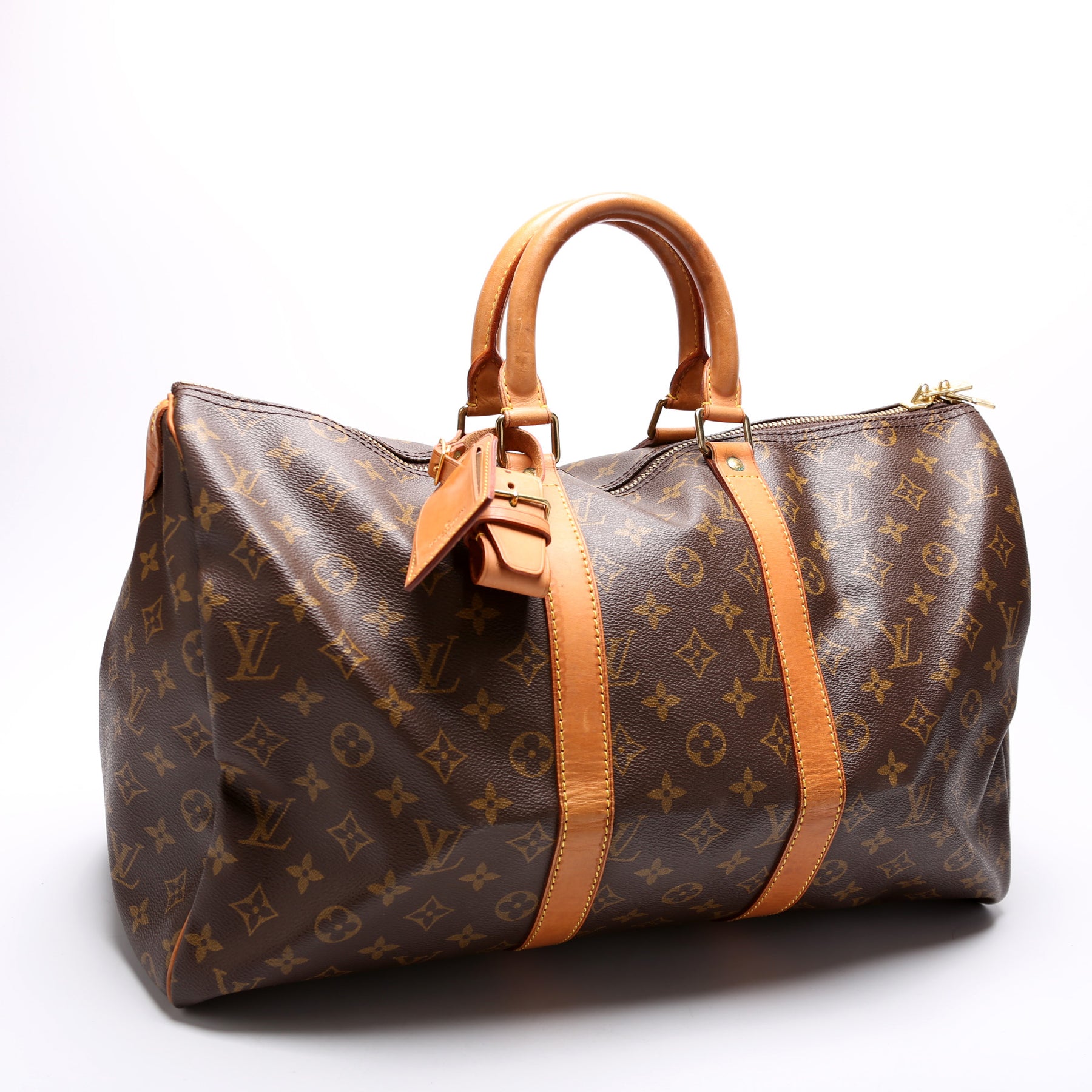 This pre-owned Louis Vuitton Keepall 45 is guaranteed 100% authentic. The exterior is in the classic Louis Vuitton Monogram coated canvas.