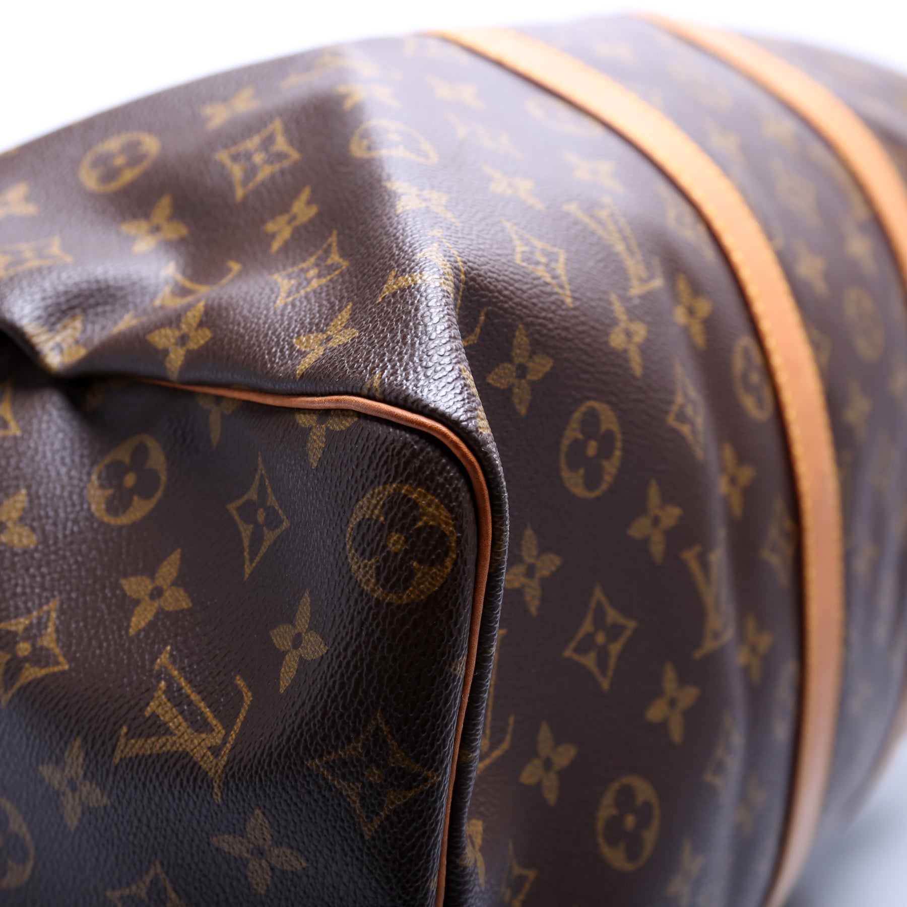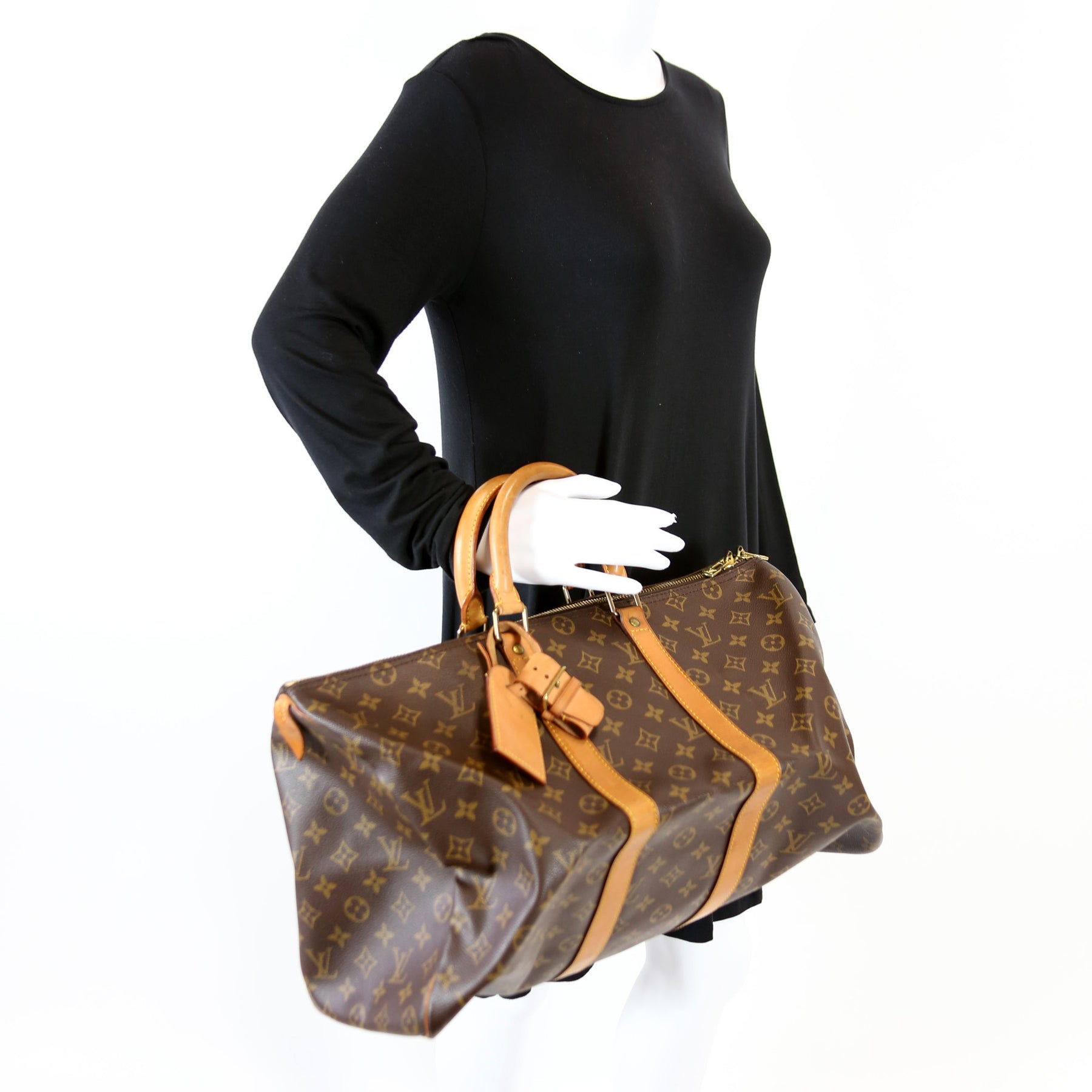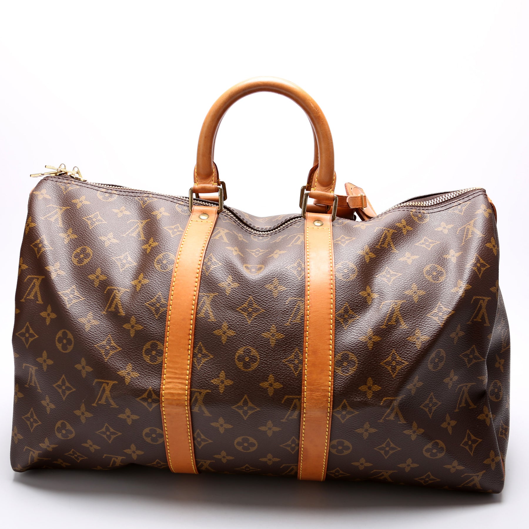 This pre-owned Louis Vuitton Keepall 45 is guaranteed 100% authentic. The exterior is in the classic Louis Vuitton Monogram coated canvas.