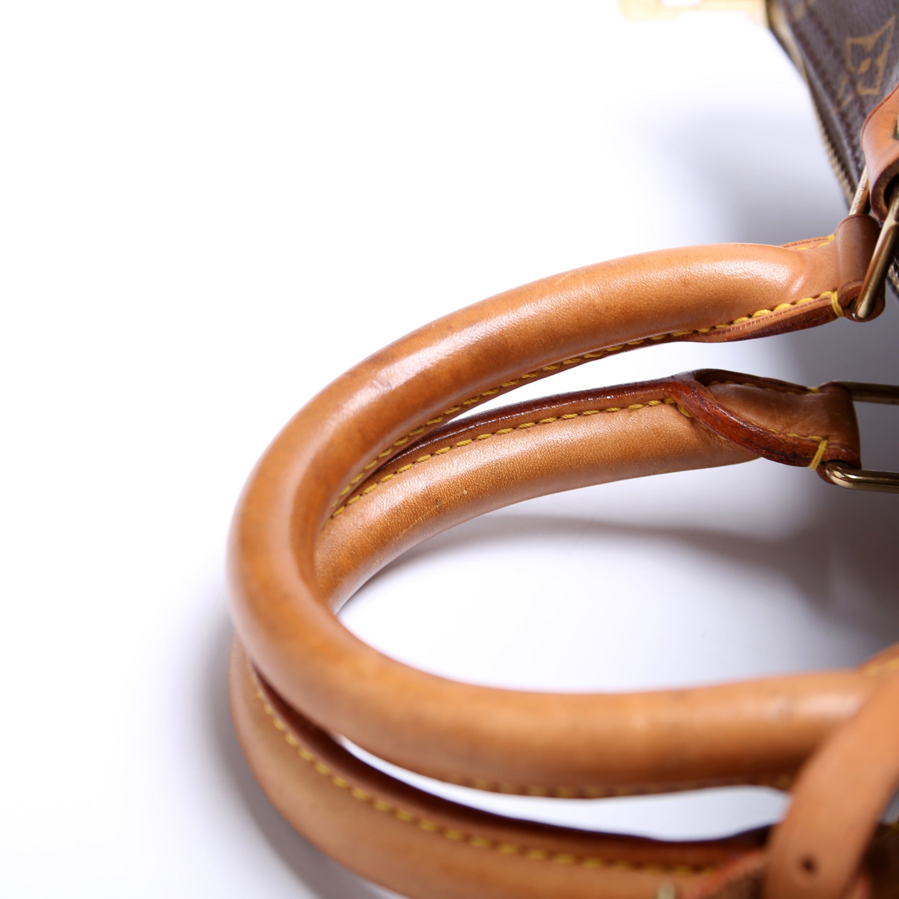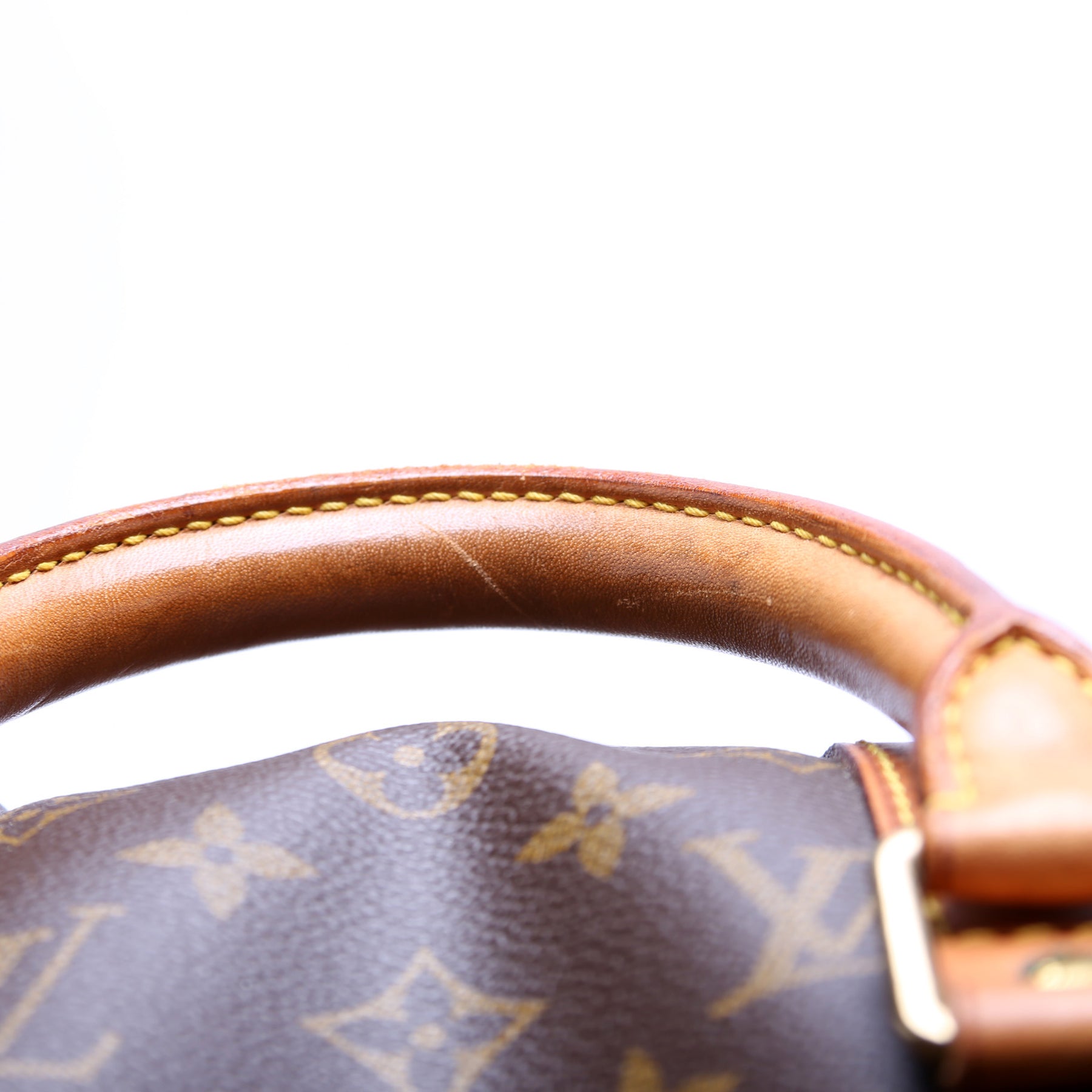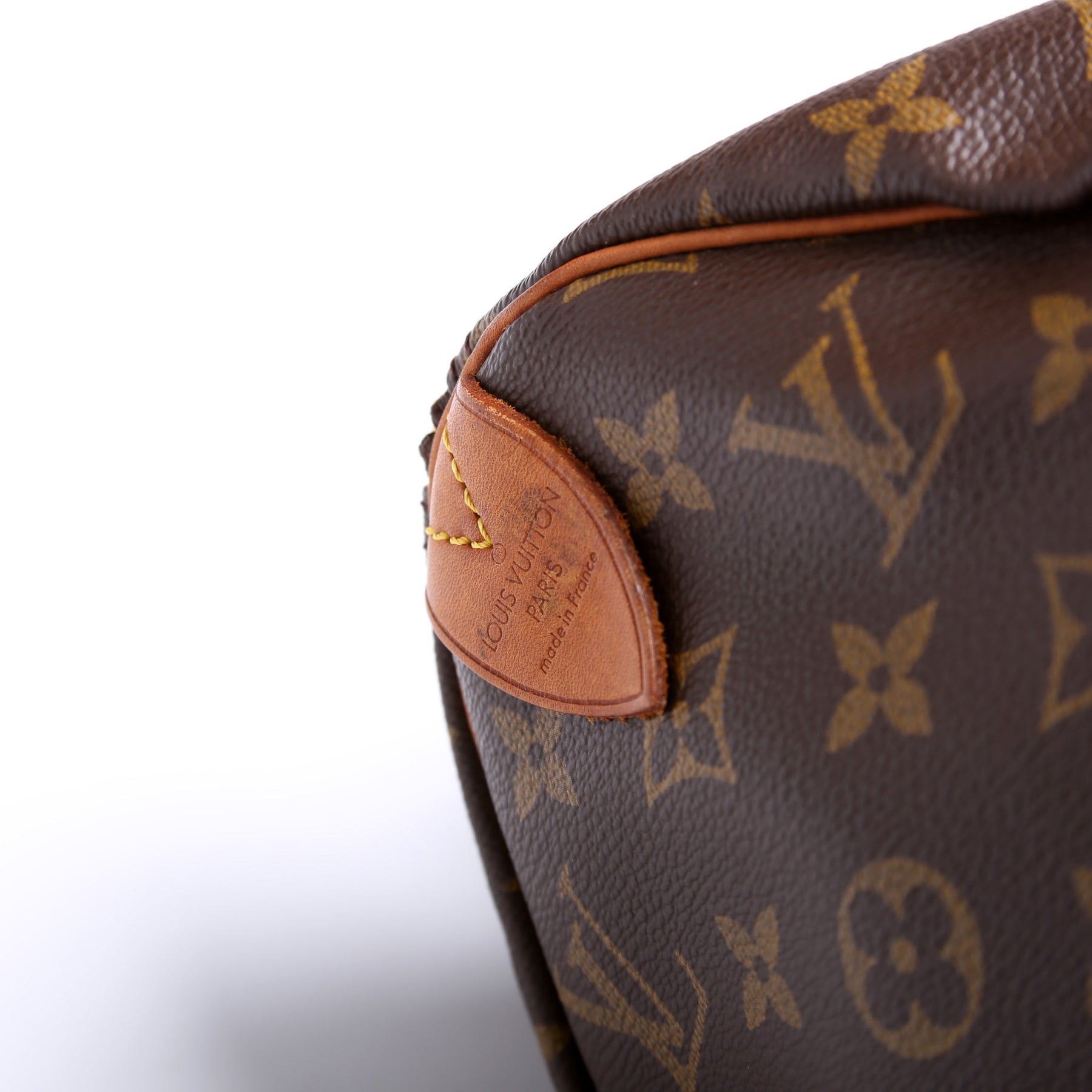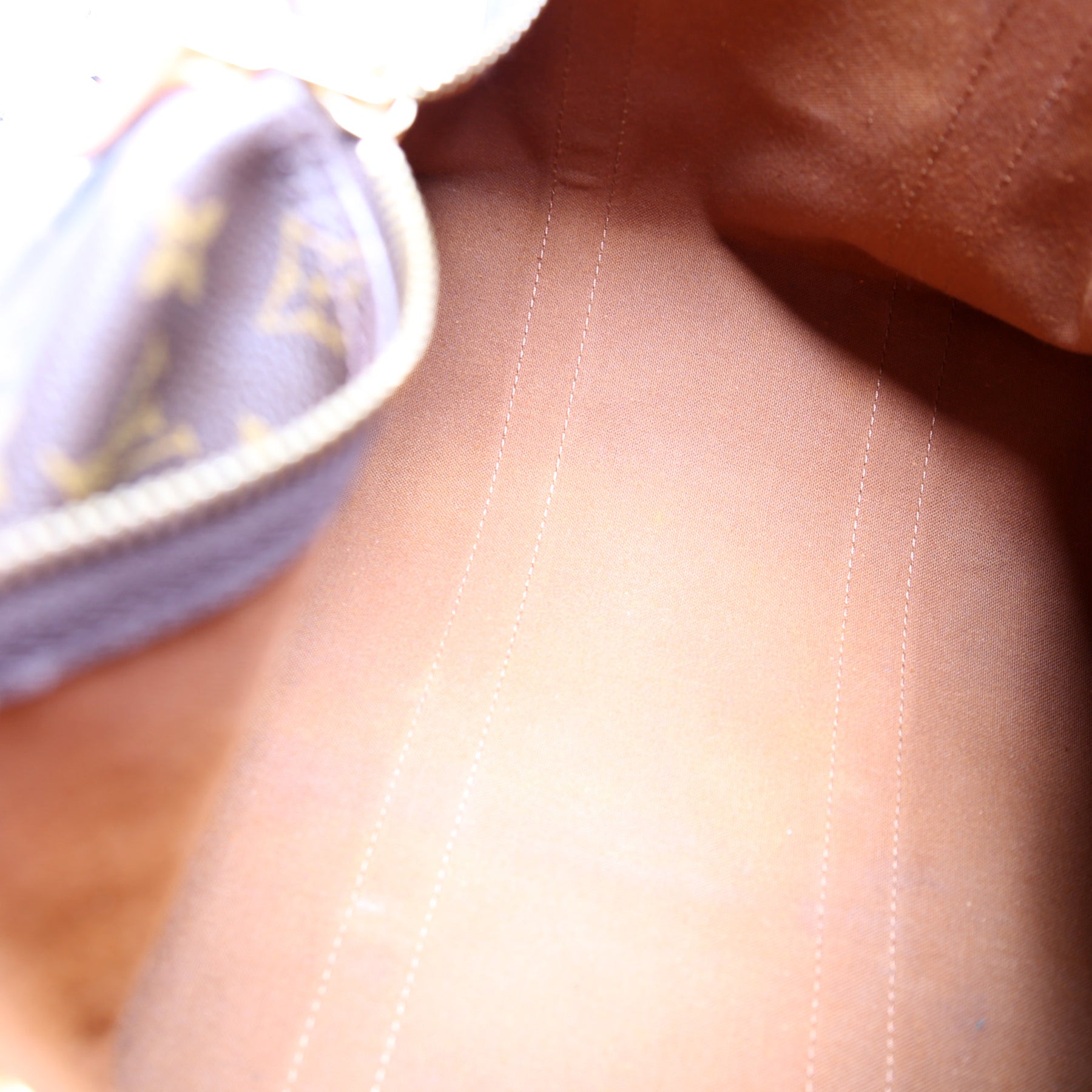 Exterior: The exterior coated canvas is free of any rips or cracks. The leather trim shows discoloration throughout.