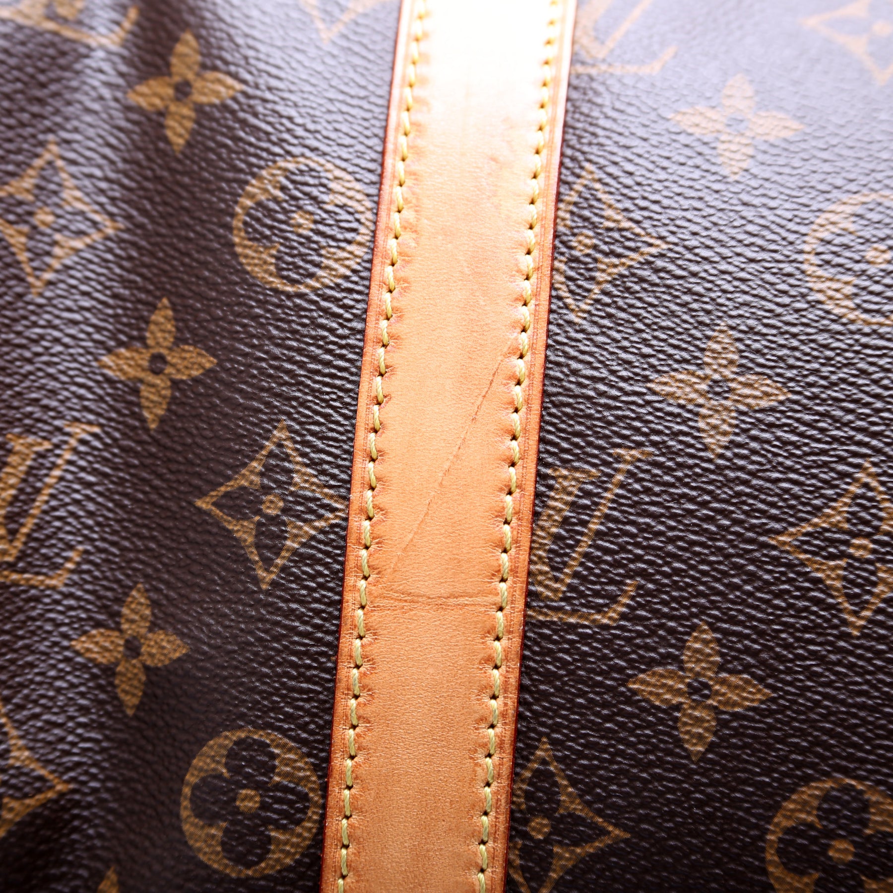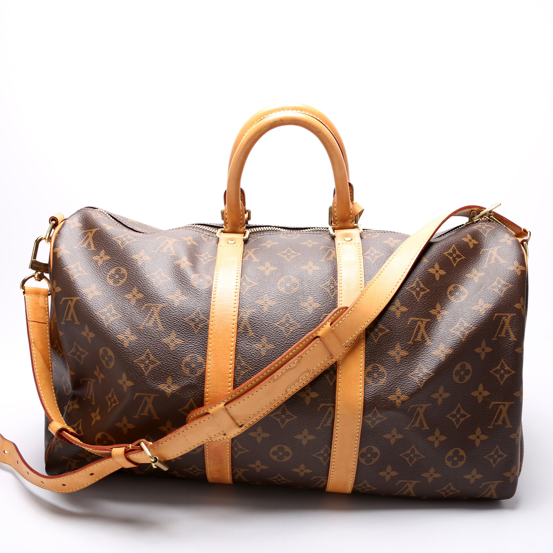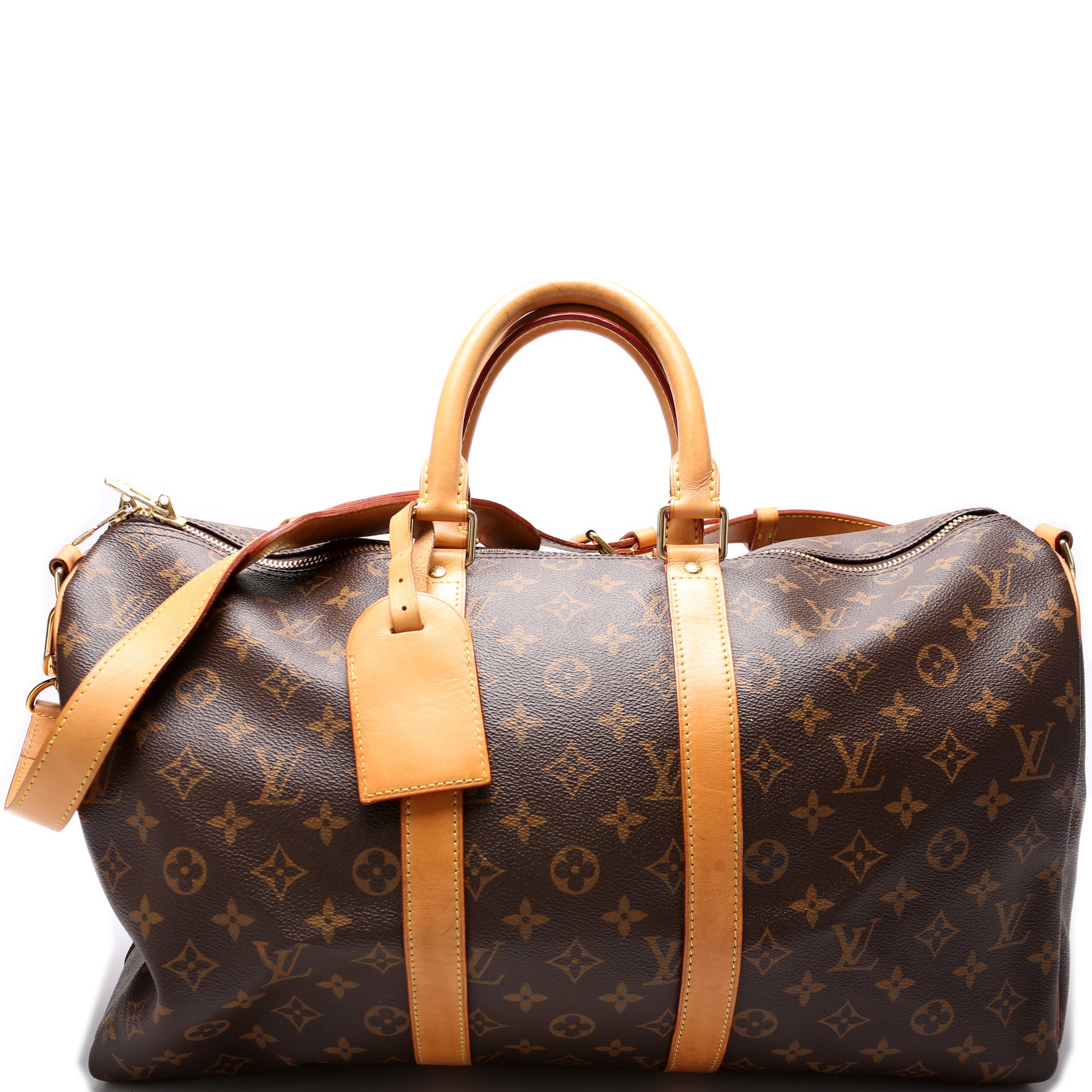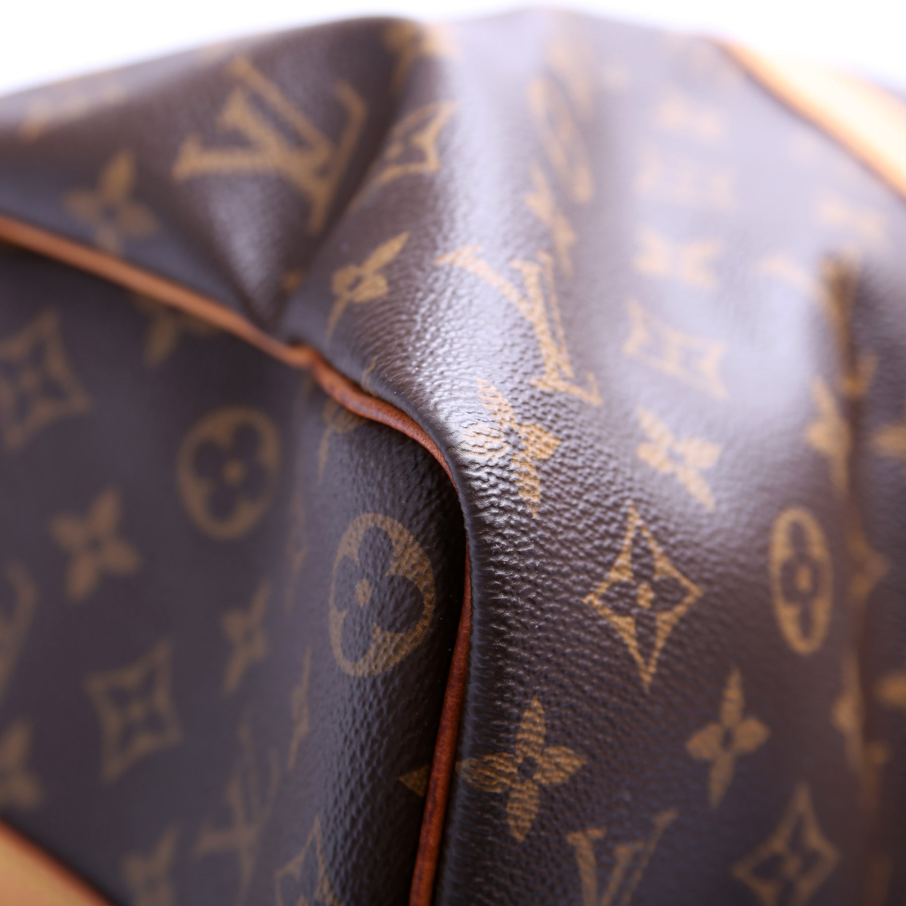 This pre-owned Louis Vuitton Keepall 45 is guaranteed 100% authentic. The exterior is in the classic Louis Vuitton Monogram coated canvas.