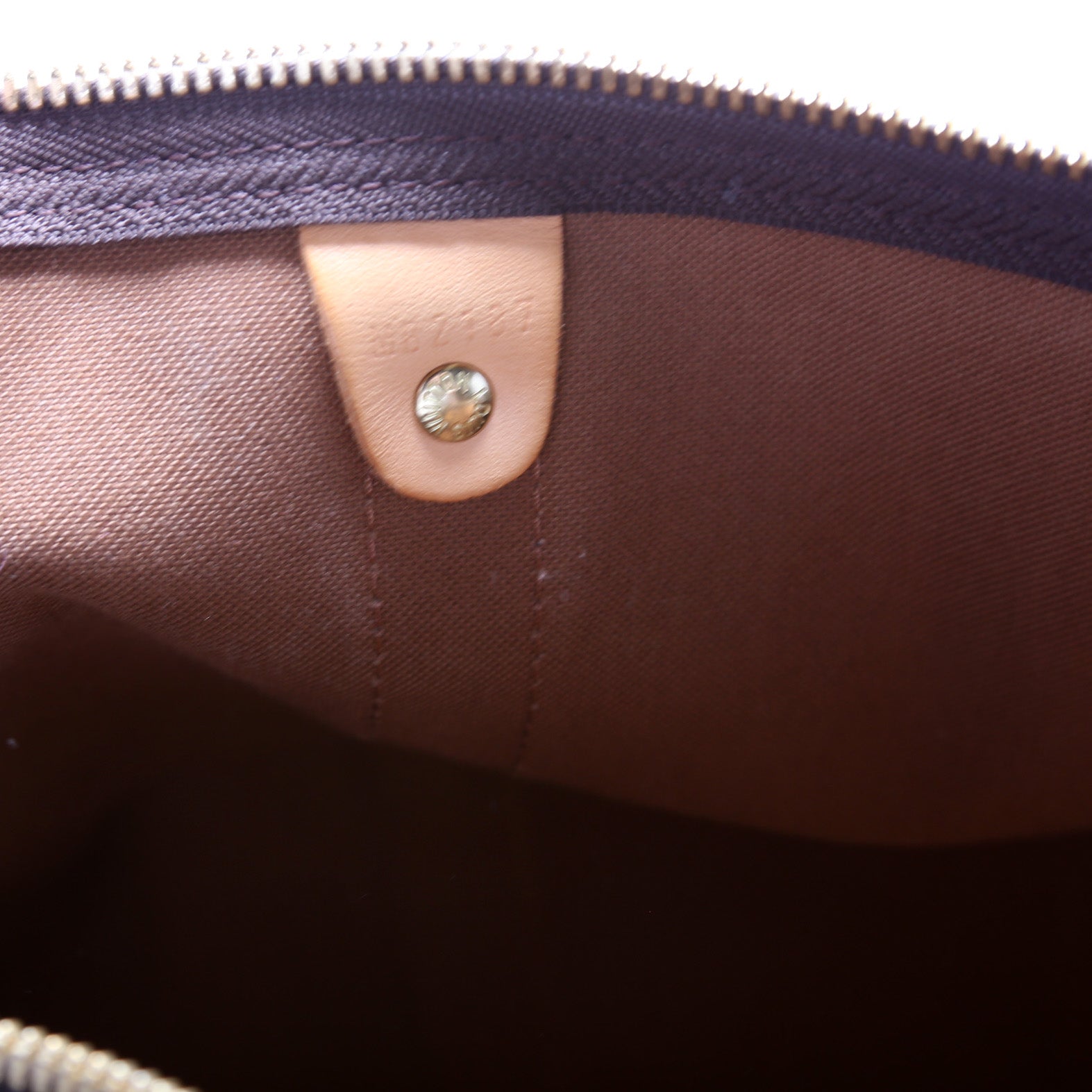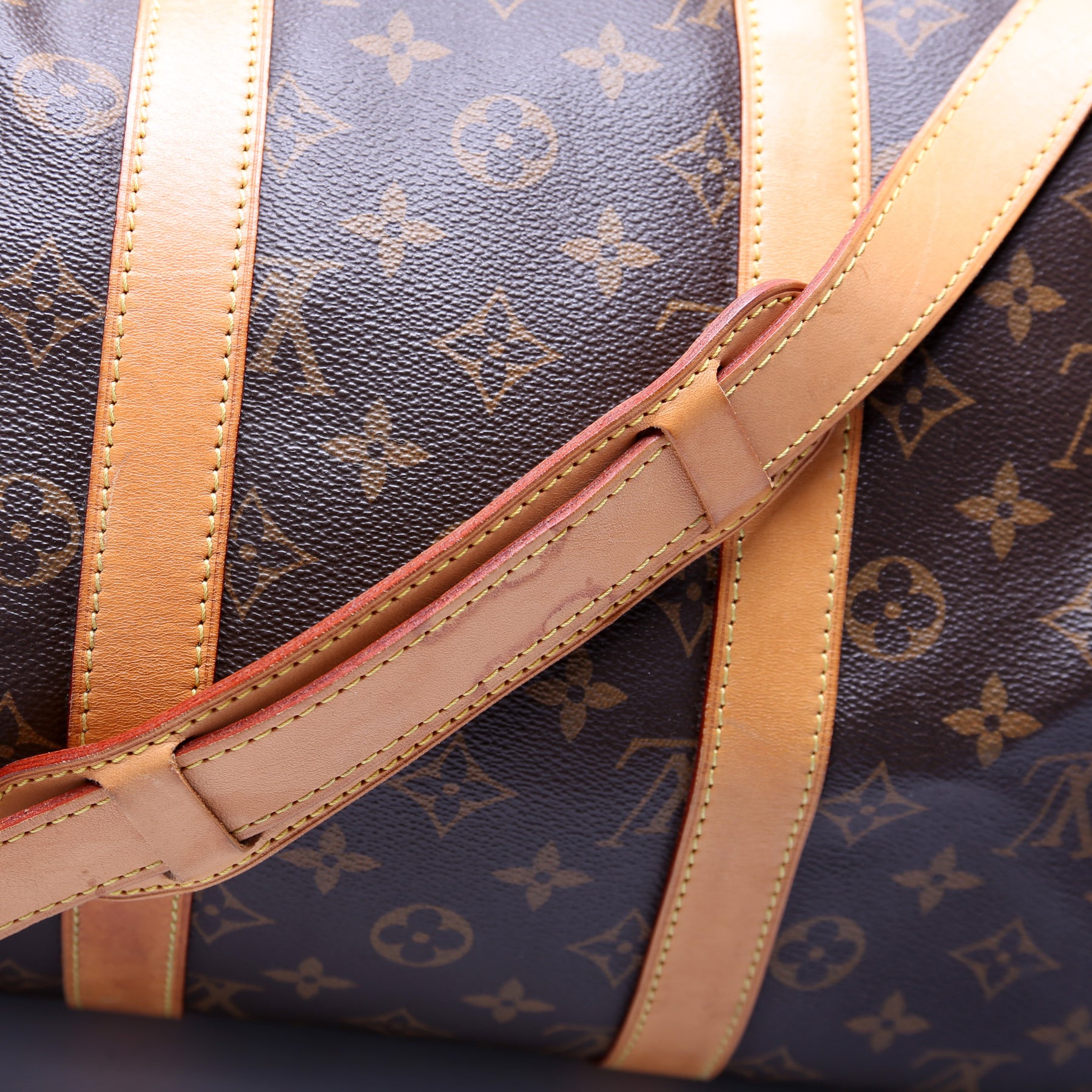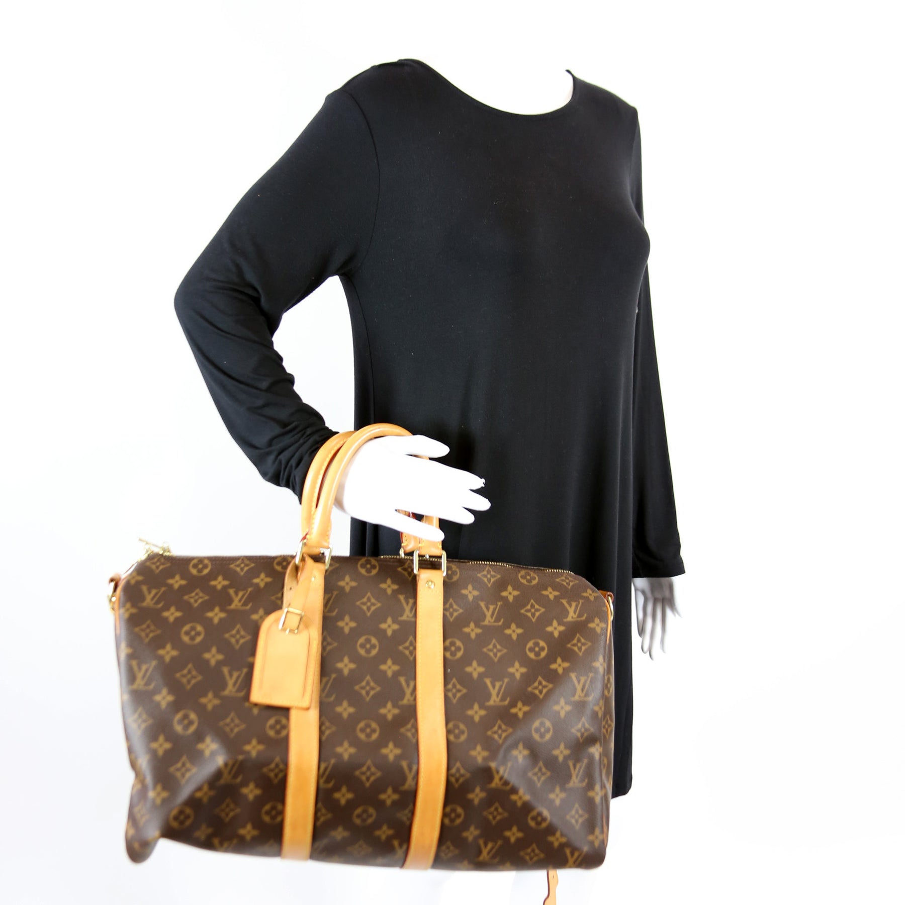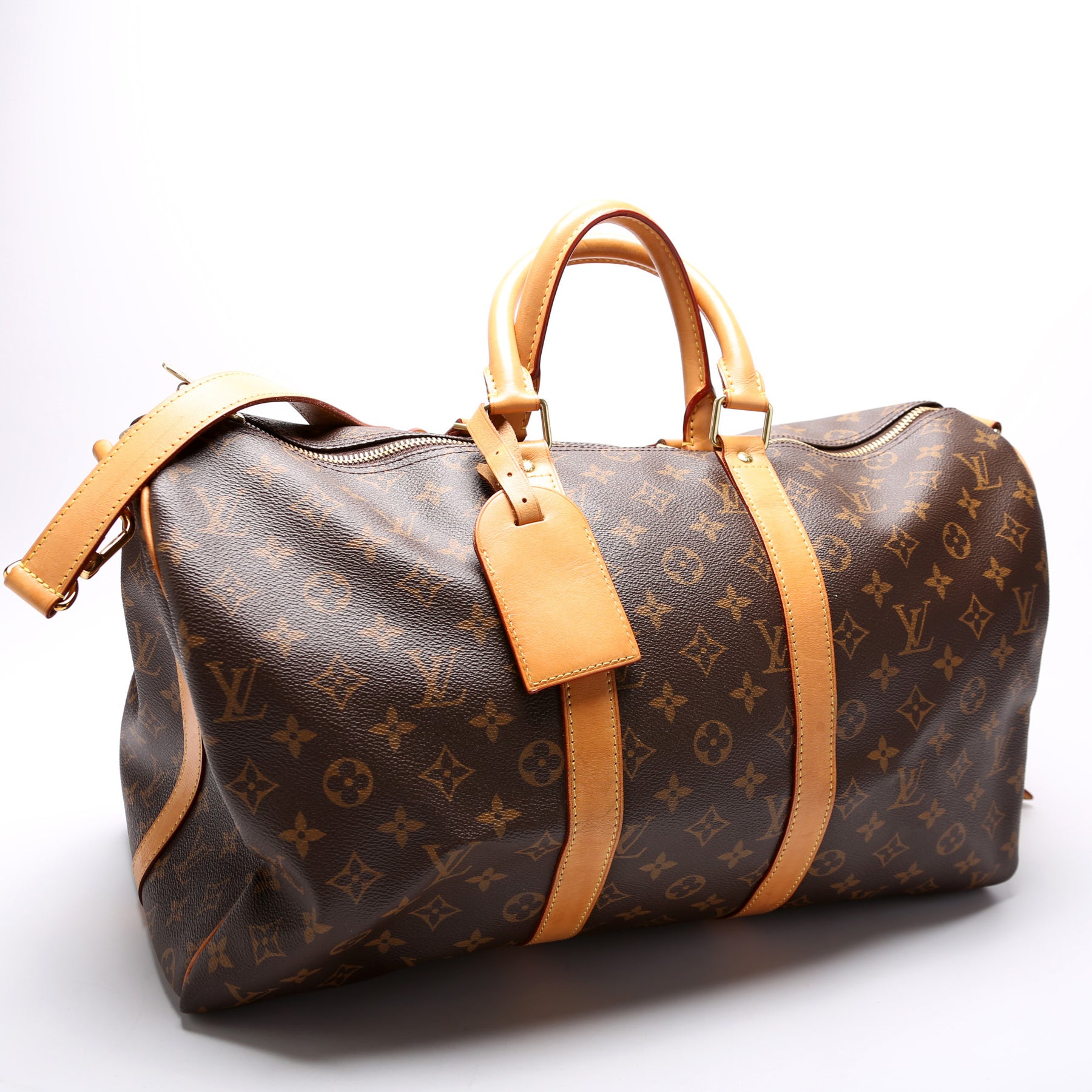 This pre-owned Louis Vuitton Keepall 45 is guaranteed 100% authentic. The exterior is in the classic Louis Vuitton Monogram coated canvas.
