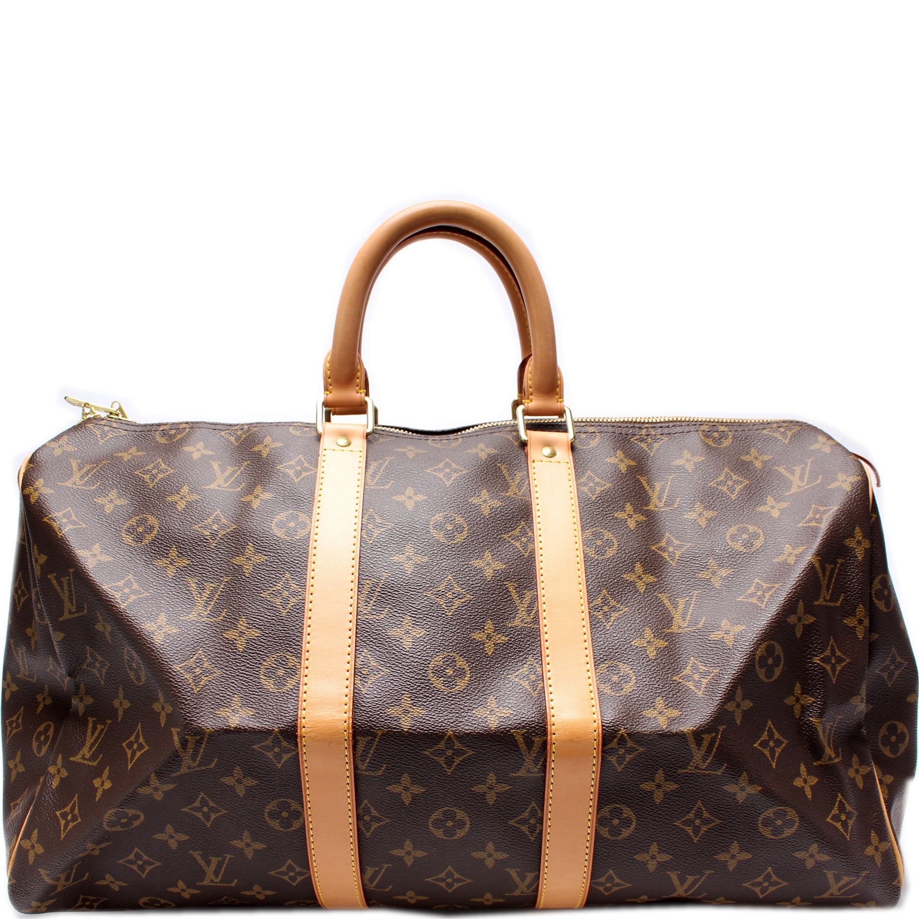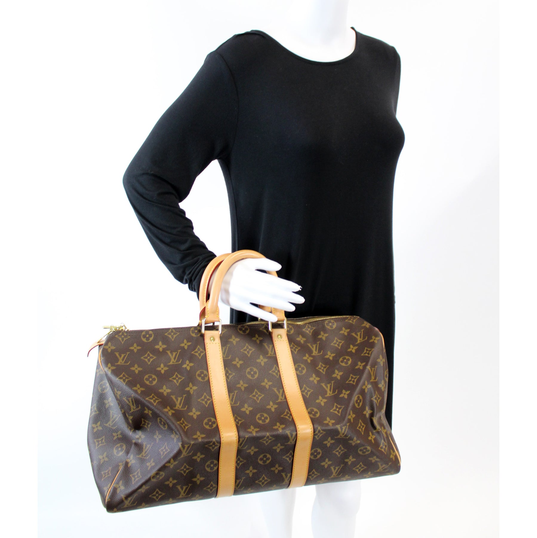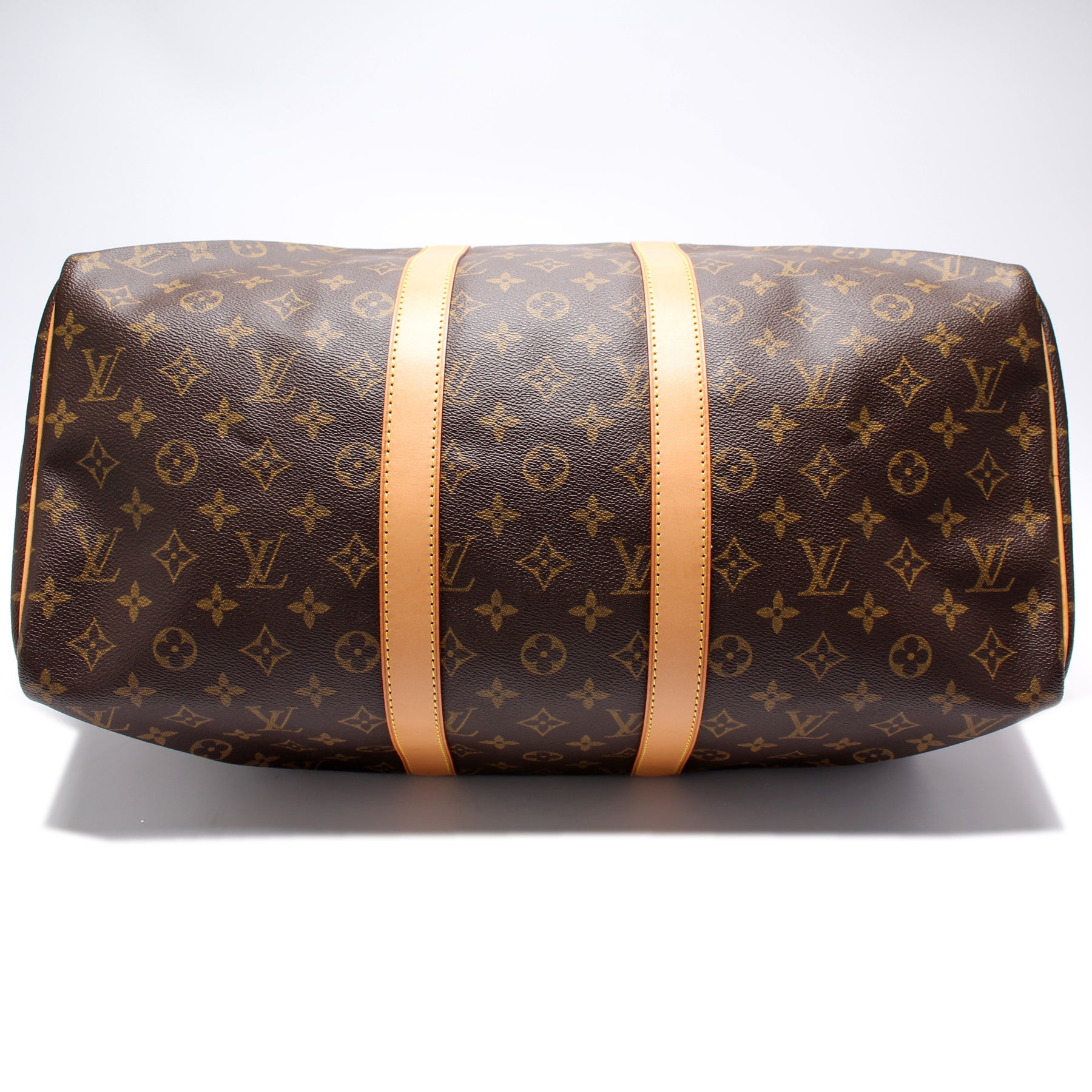 This pre-owned Louis Vuitton Keepall 45 is guaranteed 100% authentic. The exterior is in the classic Louis Vuitton Monogram coated canvas.
