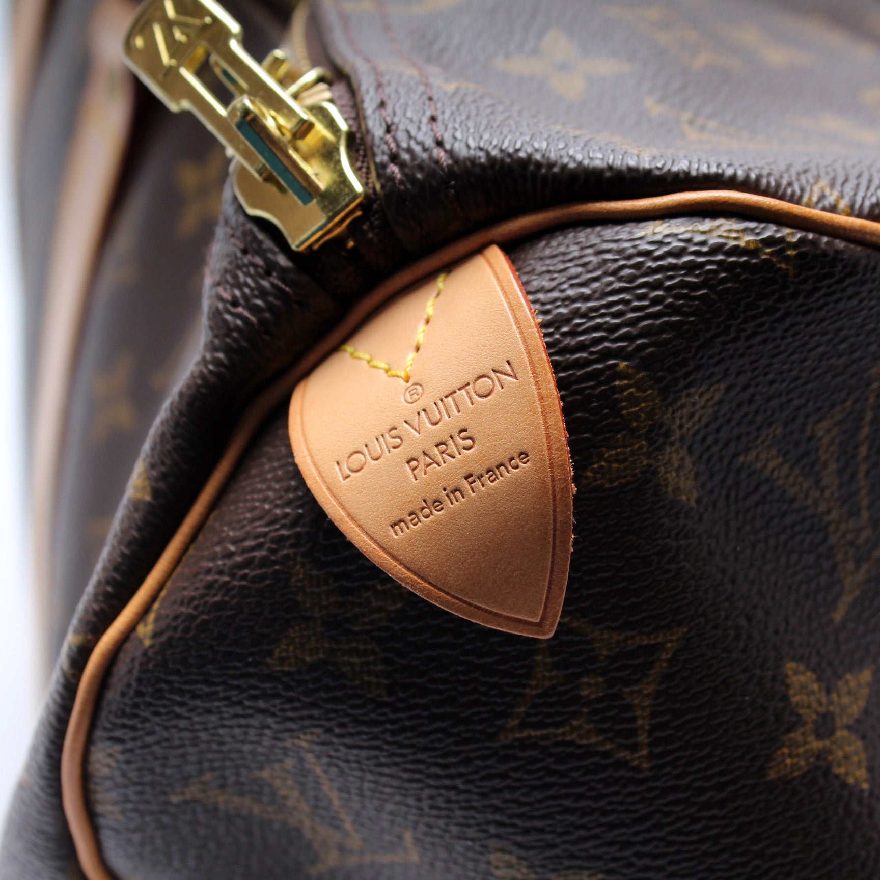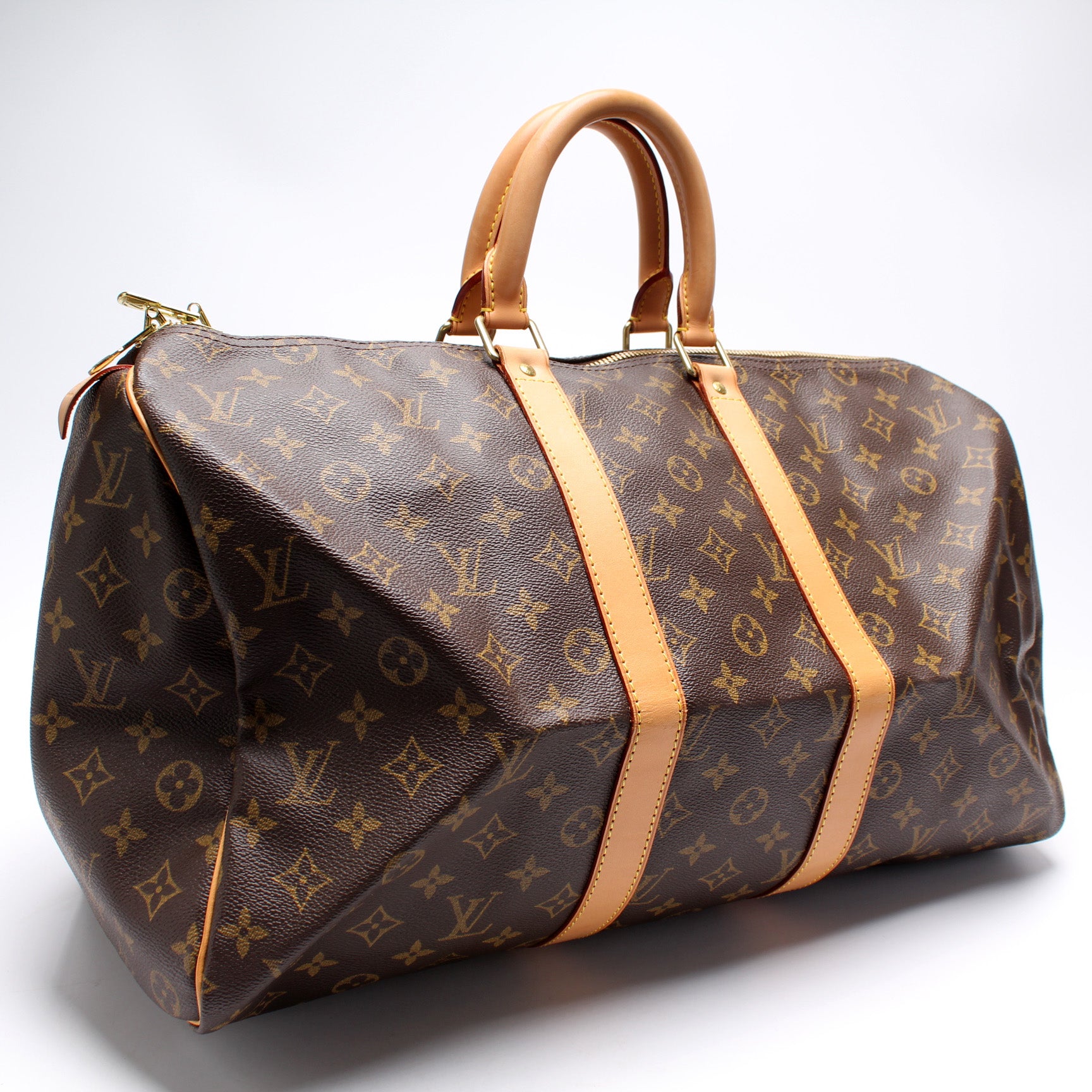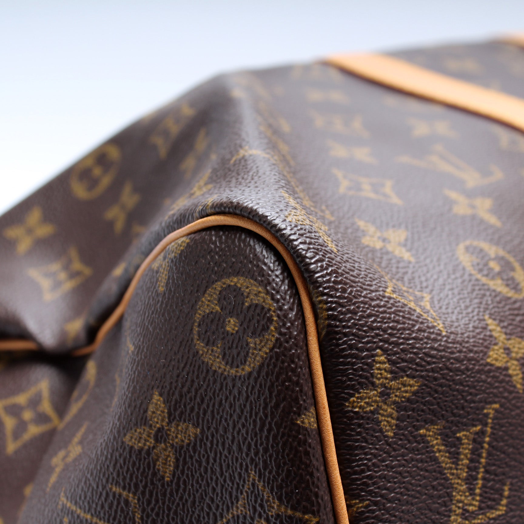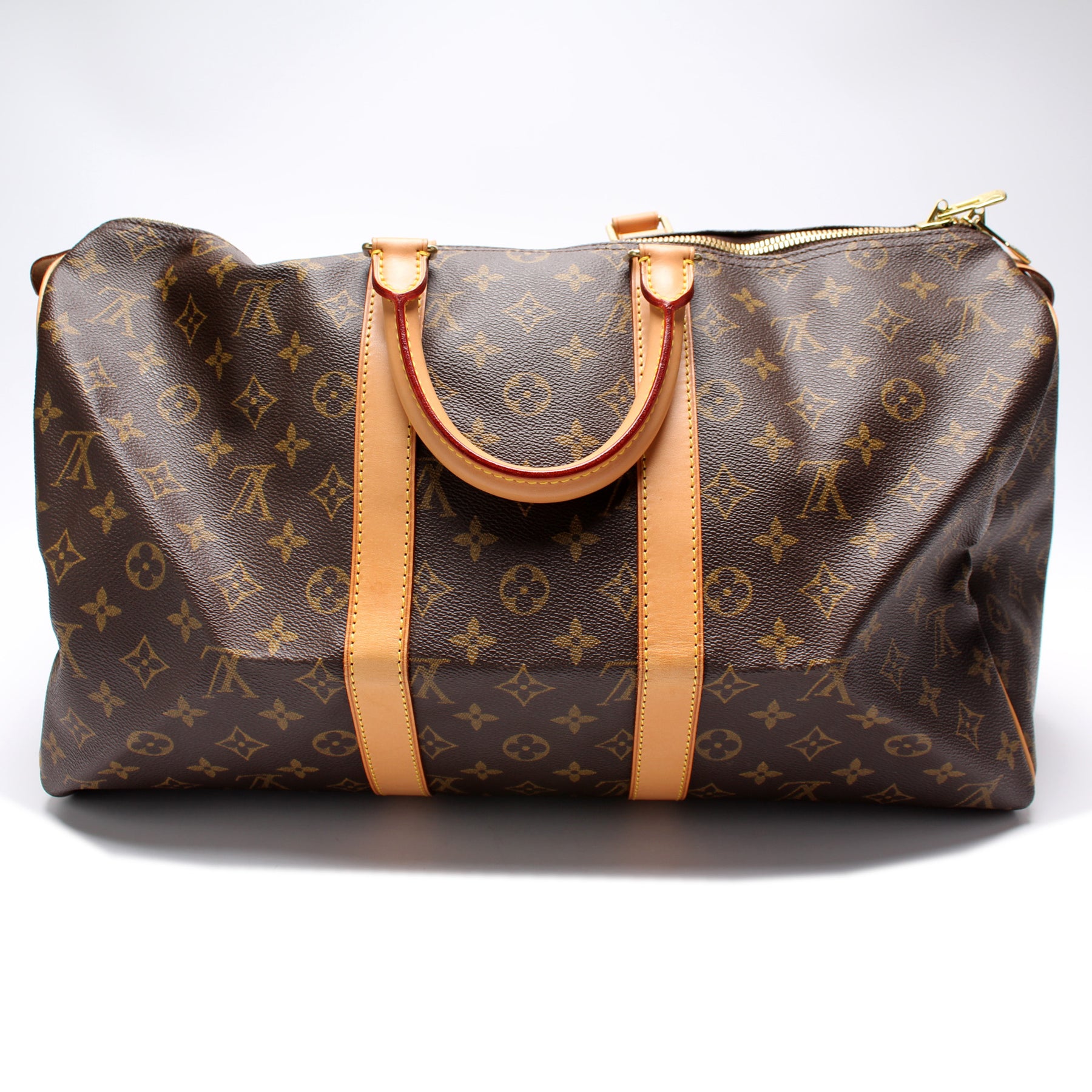 This pre-owned Louis Vuitton Keepall 45 is guaranteed 100% authentic. The exterior is in the classic Louis Vuitton Monogram coated canvas.