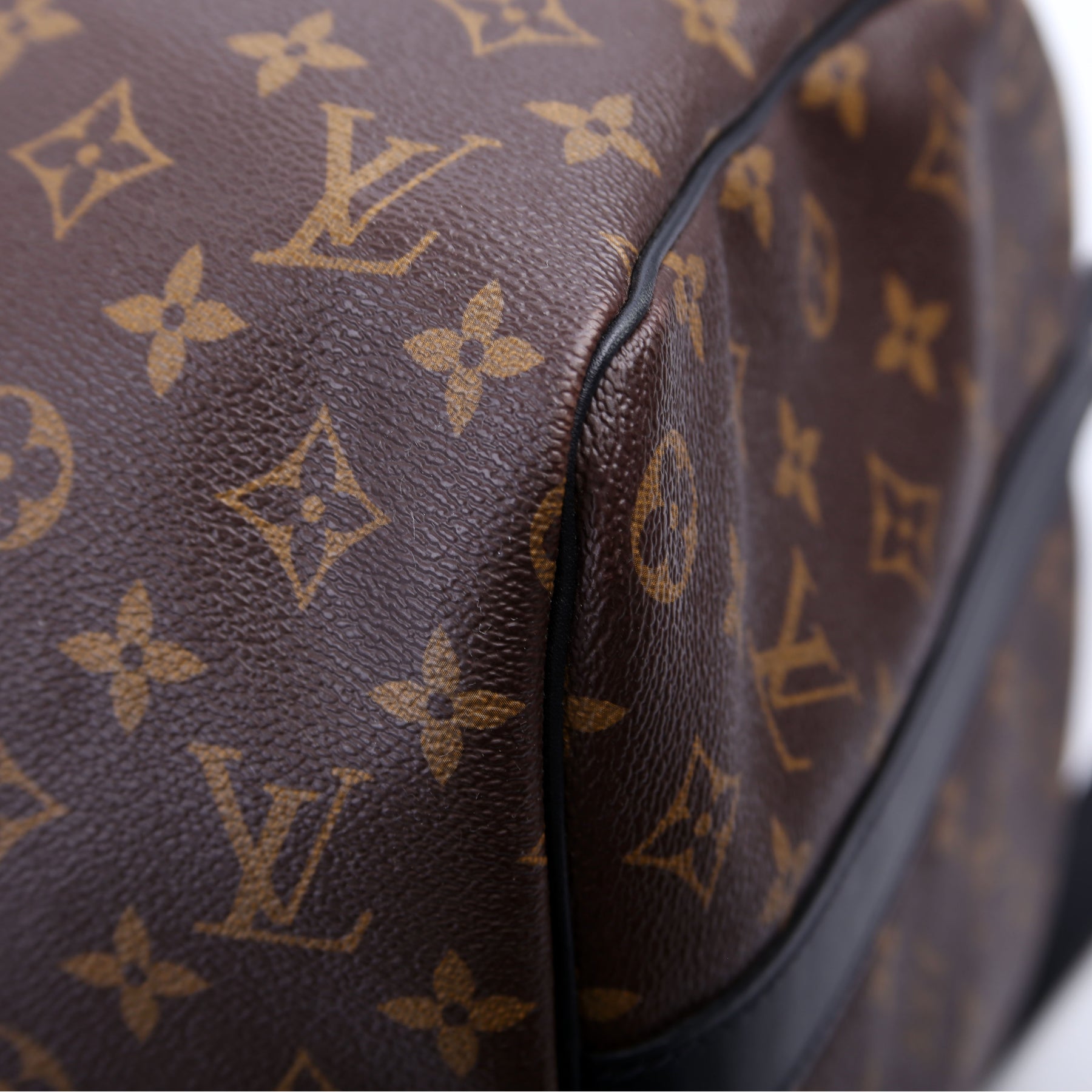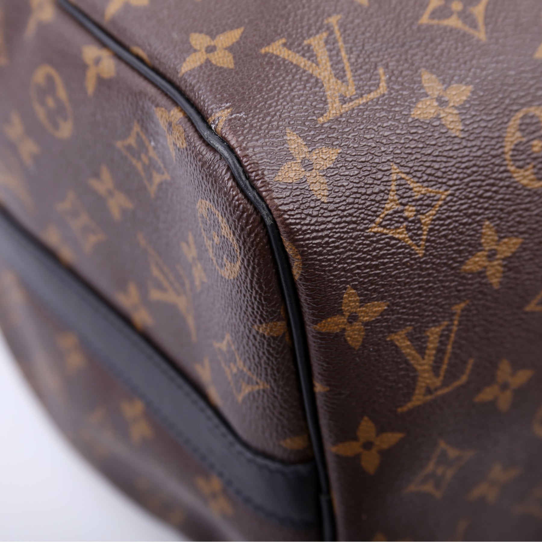Exterior: The exterior coated canvas is free of any rips or cracks. The leather trim shows minor rubbing and wear throughout. The leather details show slight wear and wrinkling.