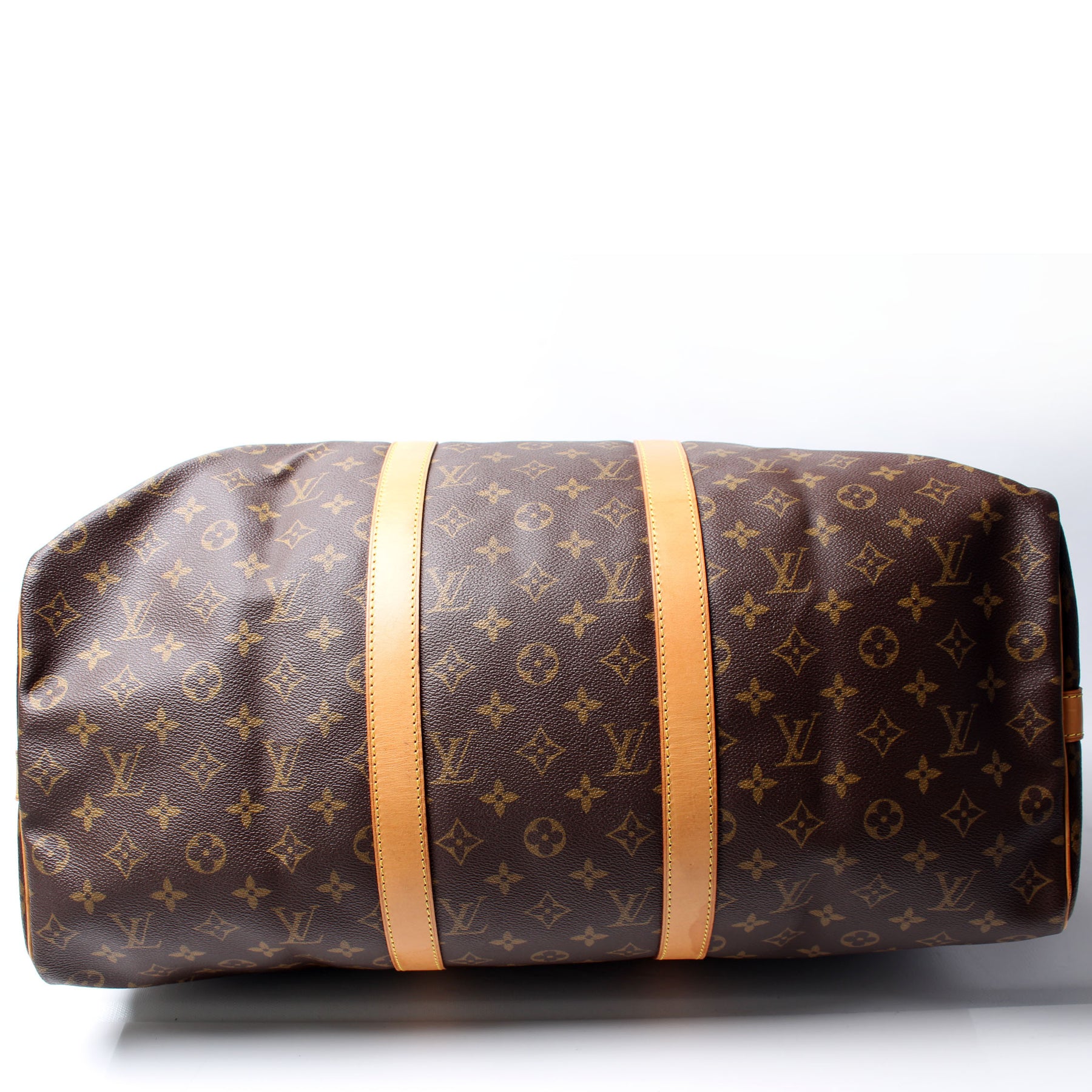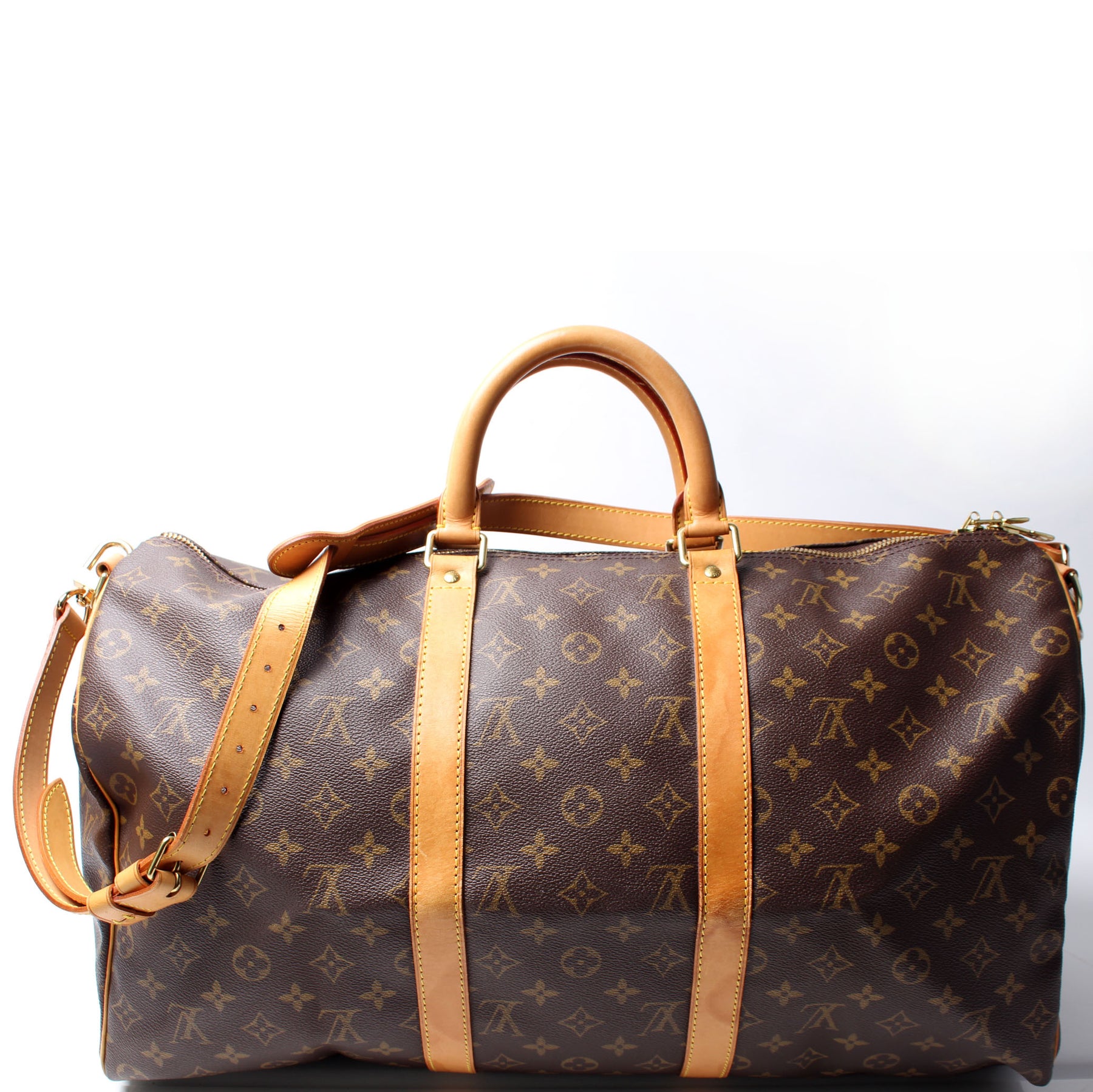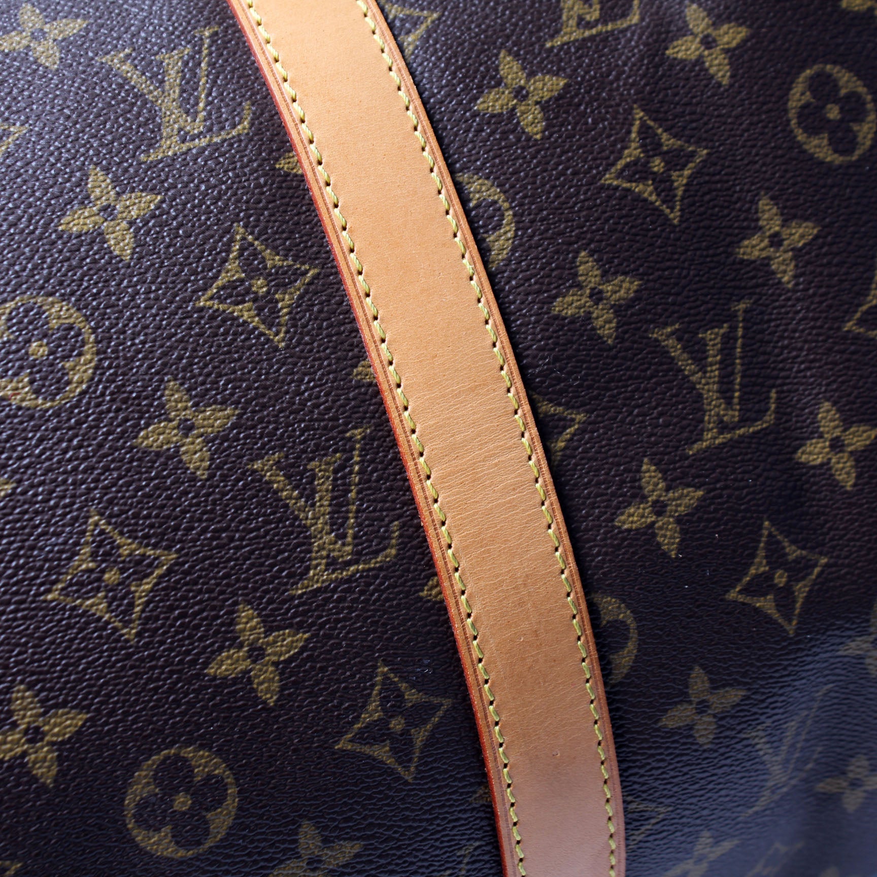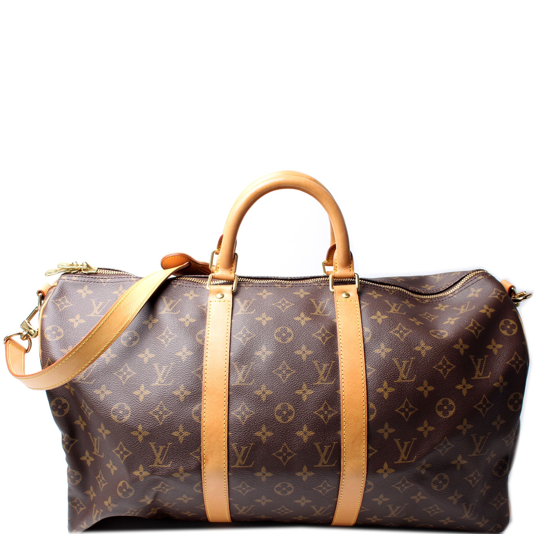 This pre-owned Louis Vuitton Keepall 50 Bandouliere is guaranteed 100% authentic. The exterior is in the classic Monogram coated canvas.