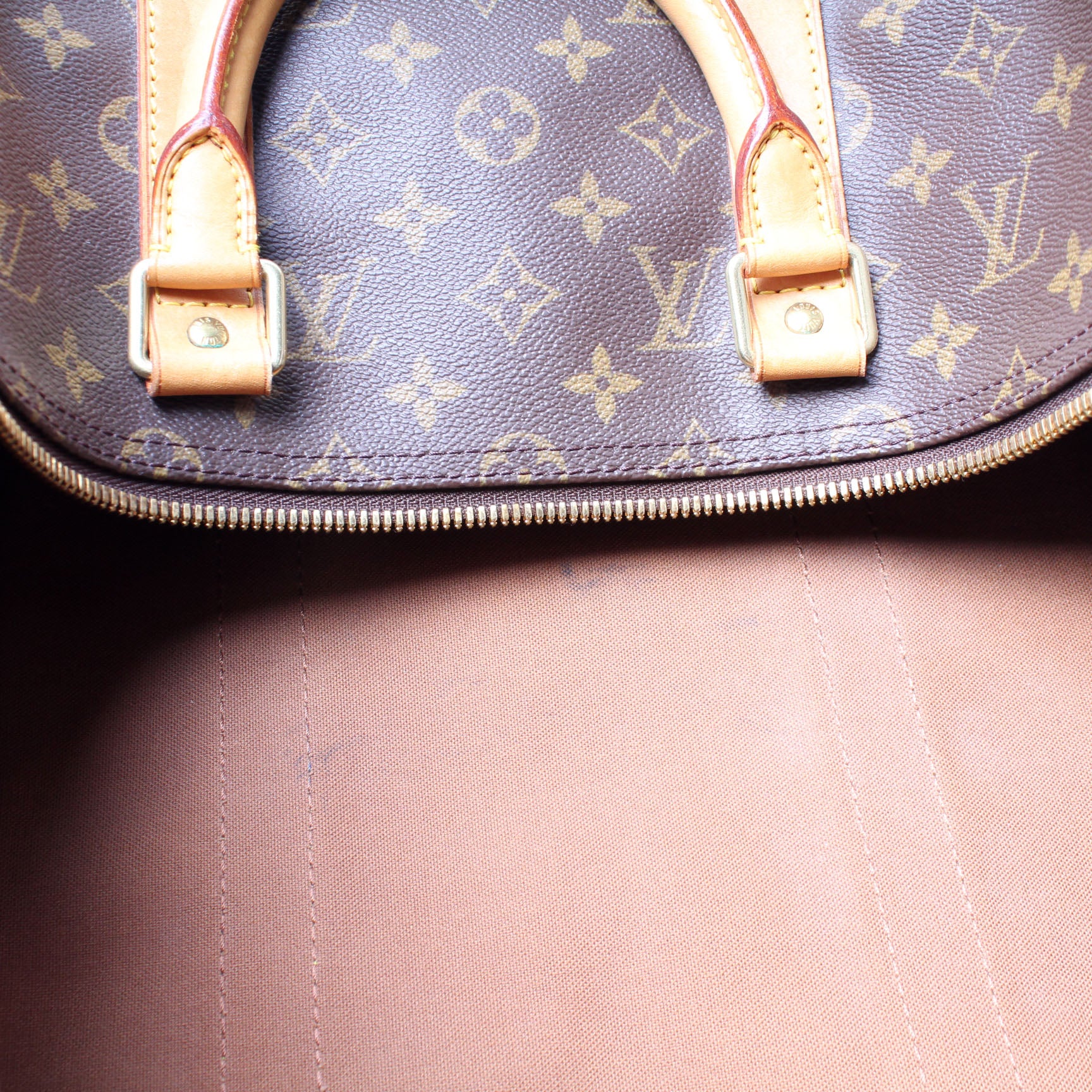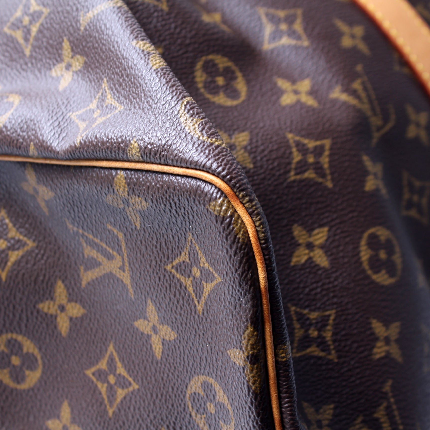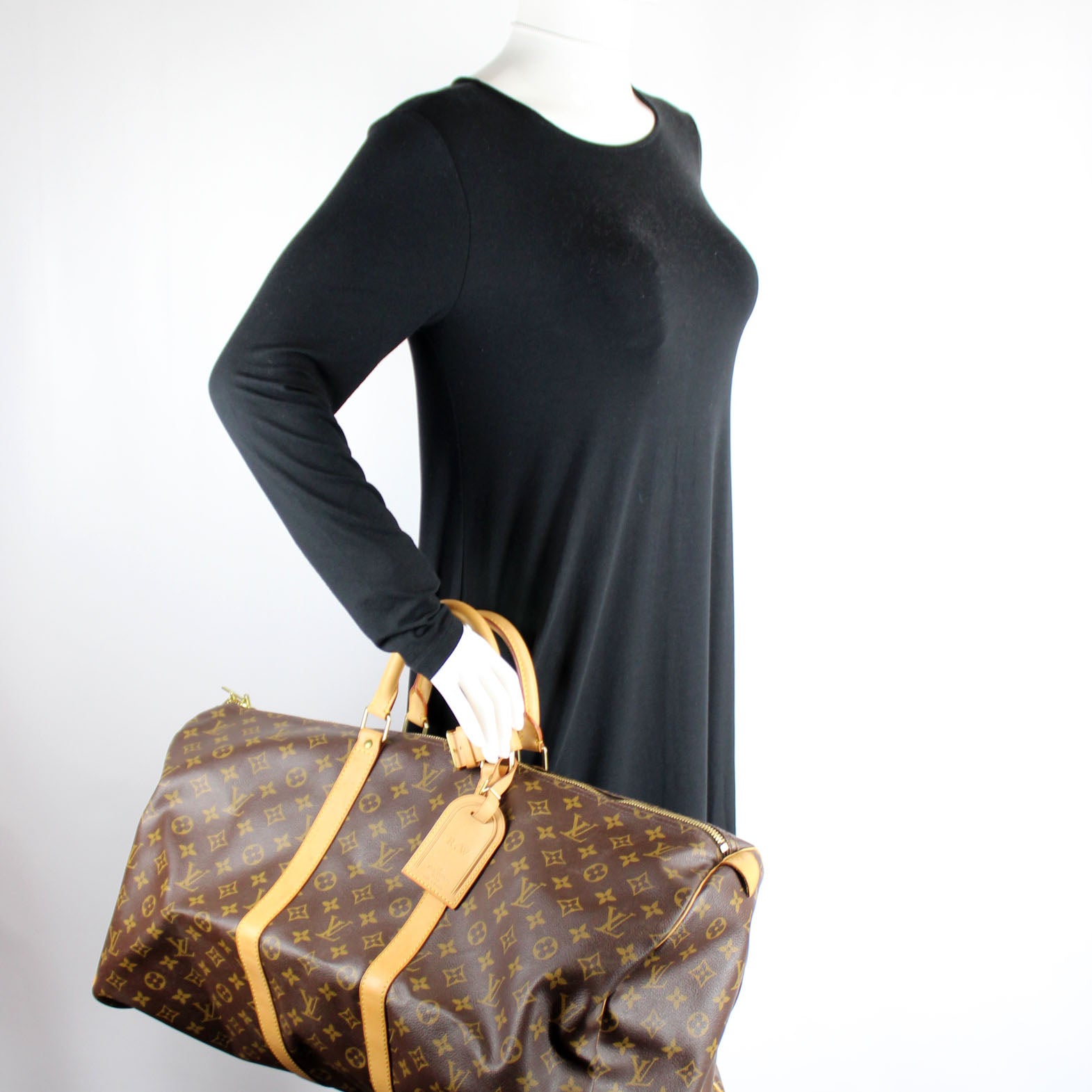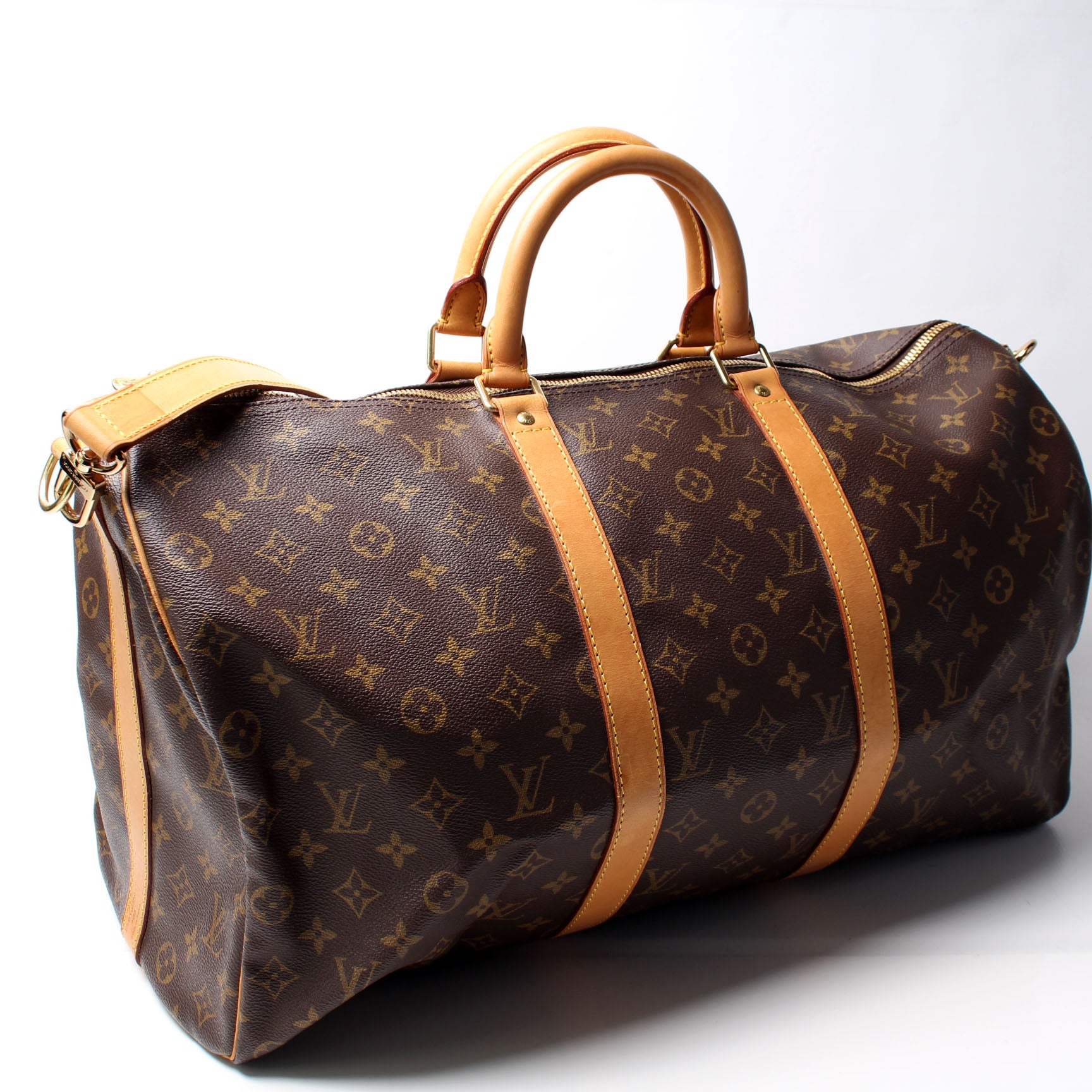 This pre-owned Louis Vuitton Keepall 50 Bandouliere is guaranteed 100% authentic. The exterior is in the classic Monogram coated canvas.