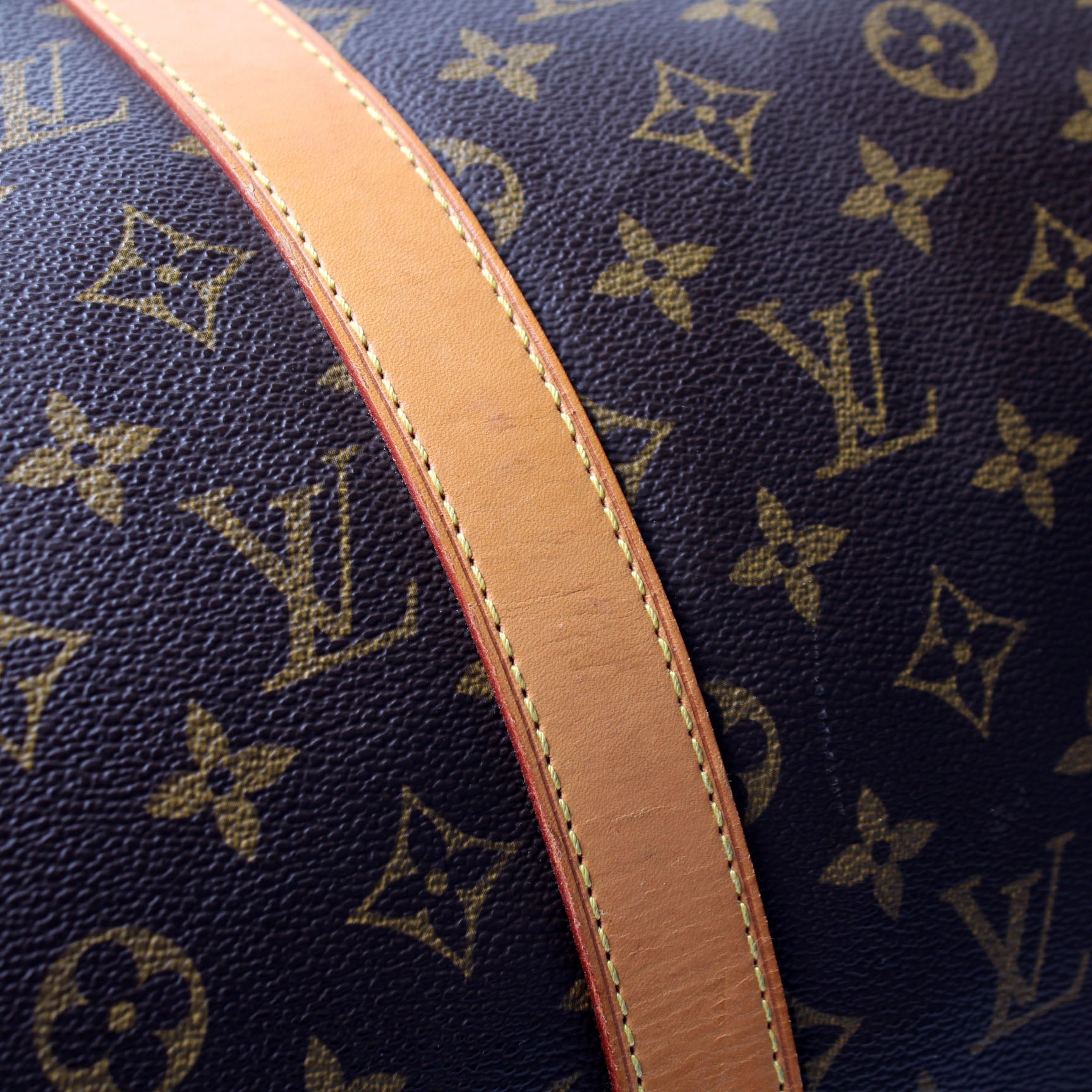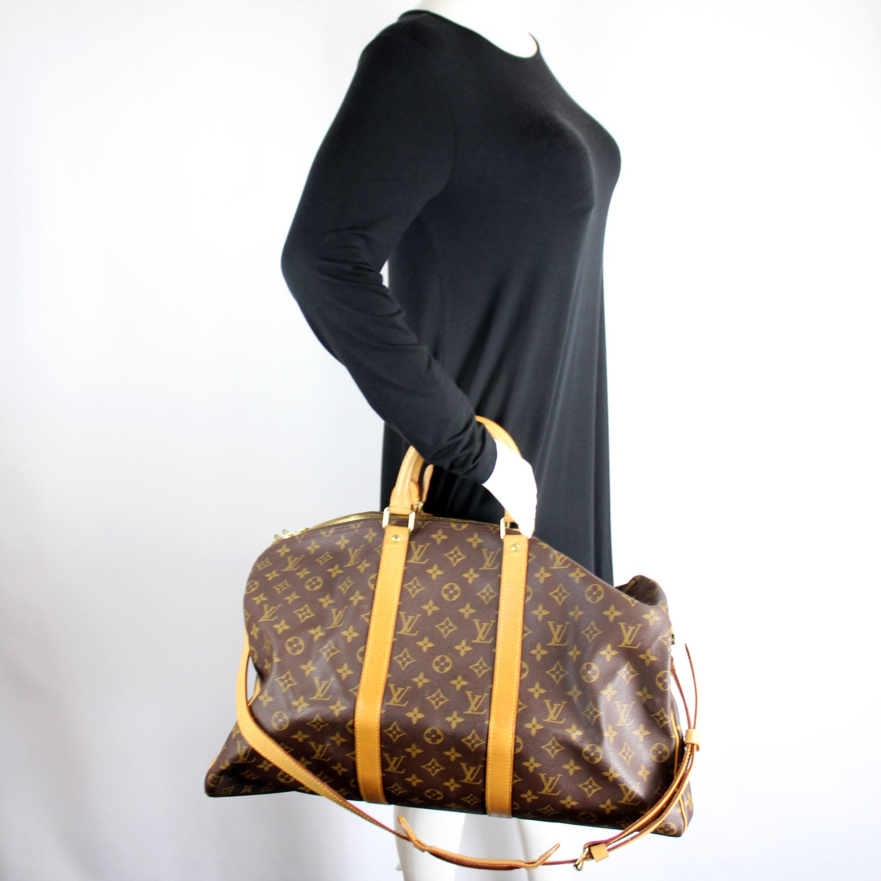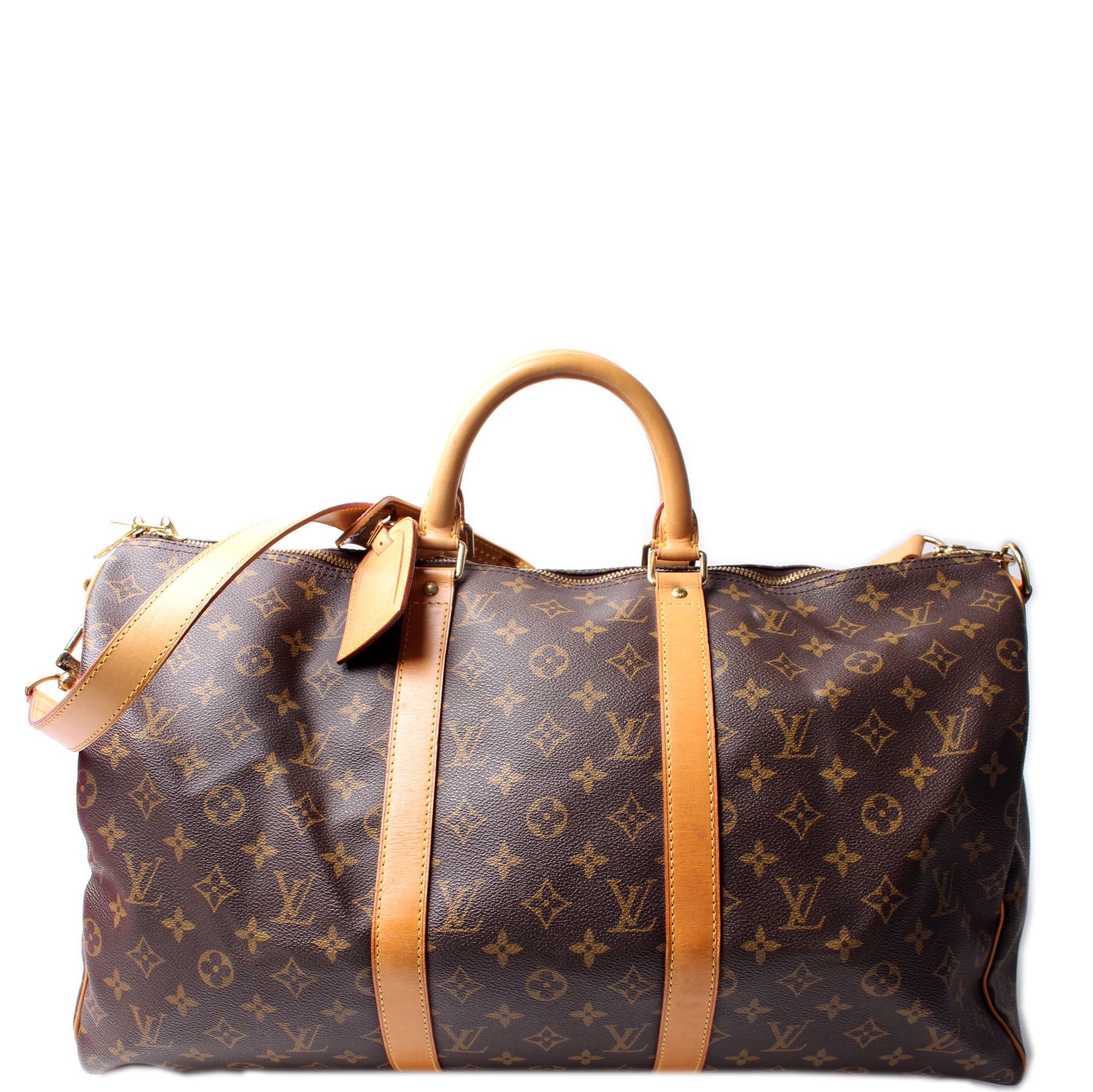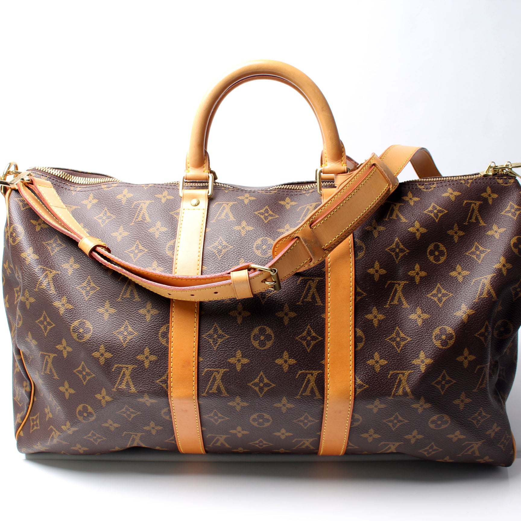 This pre-owned Louis Vuitton Keepall 50 Bandouliere is guaranteed 100% authentic. The exterior is in the classic Monogram coated canvas.