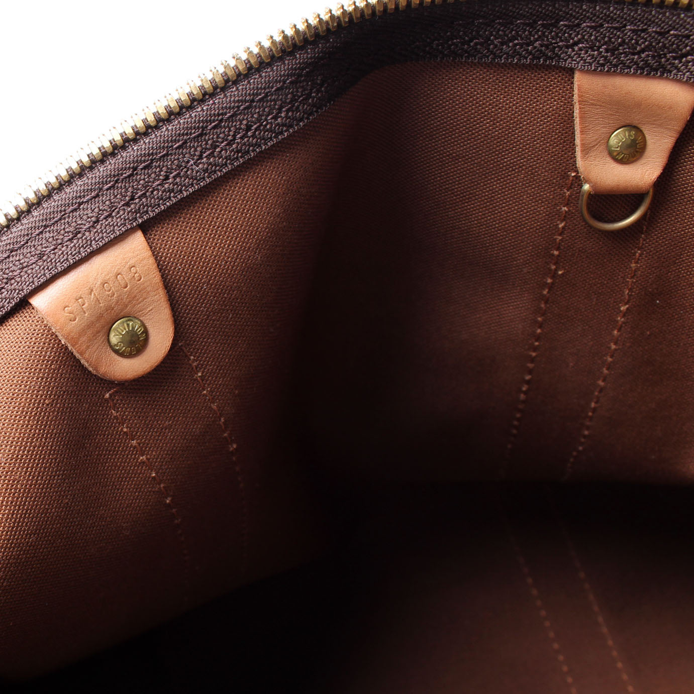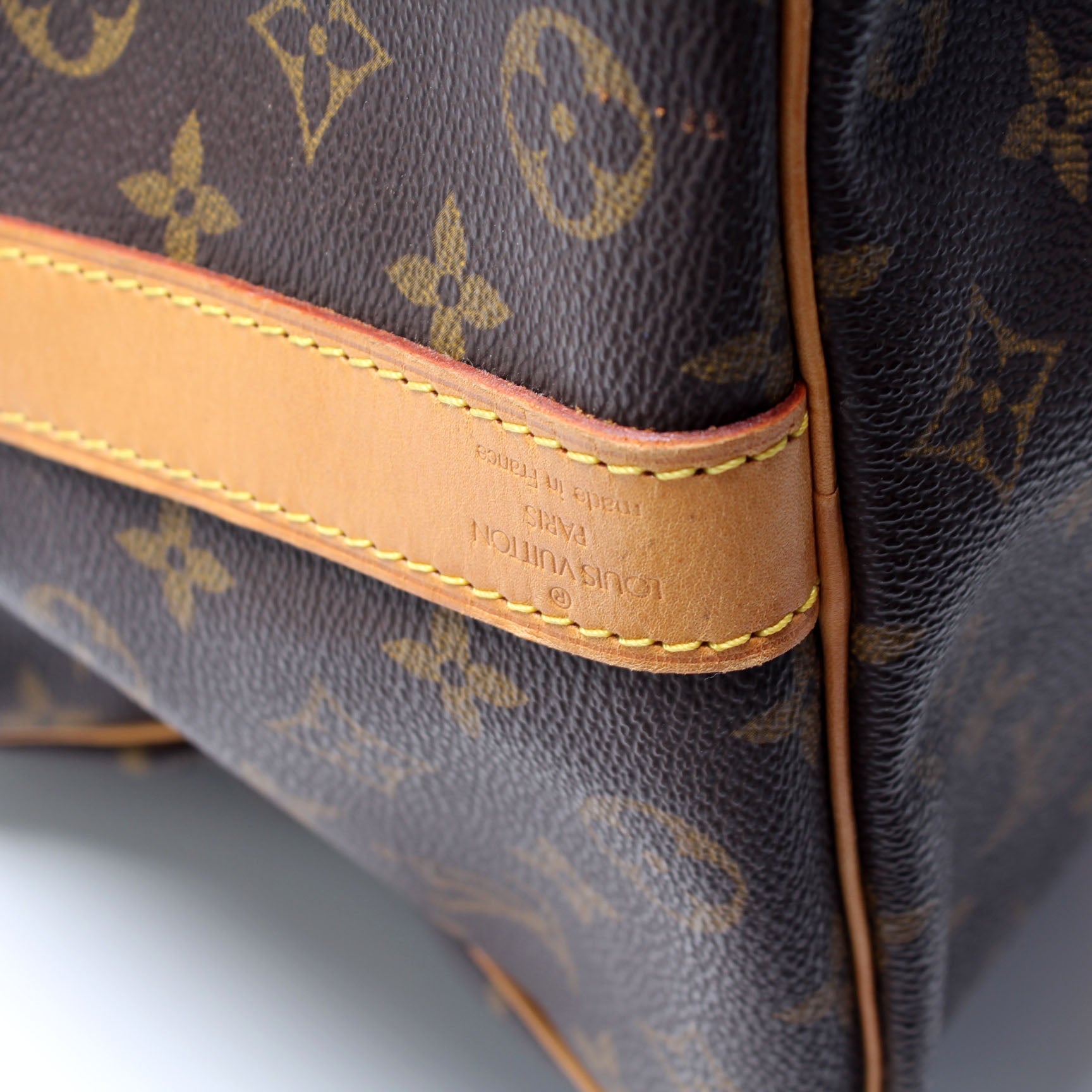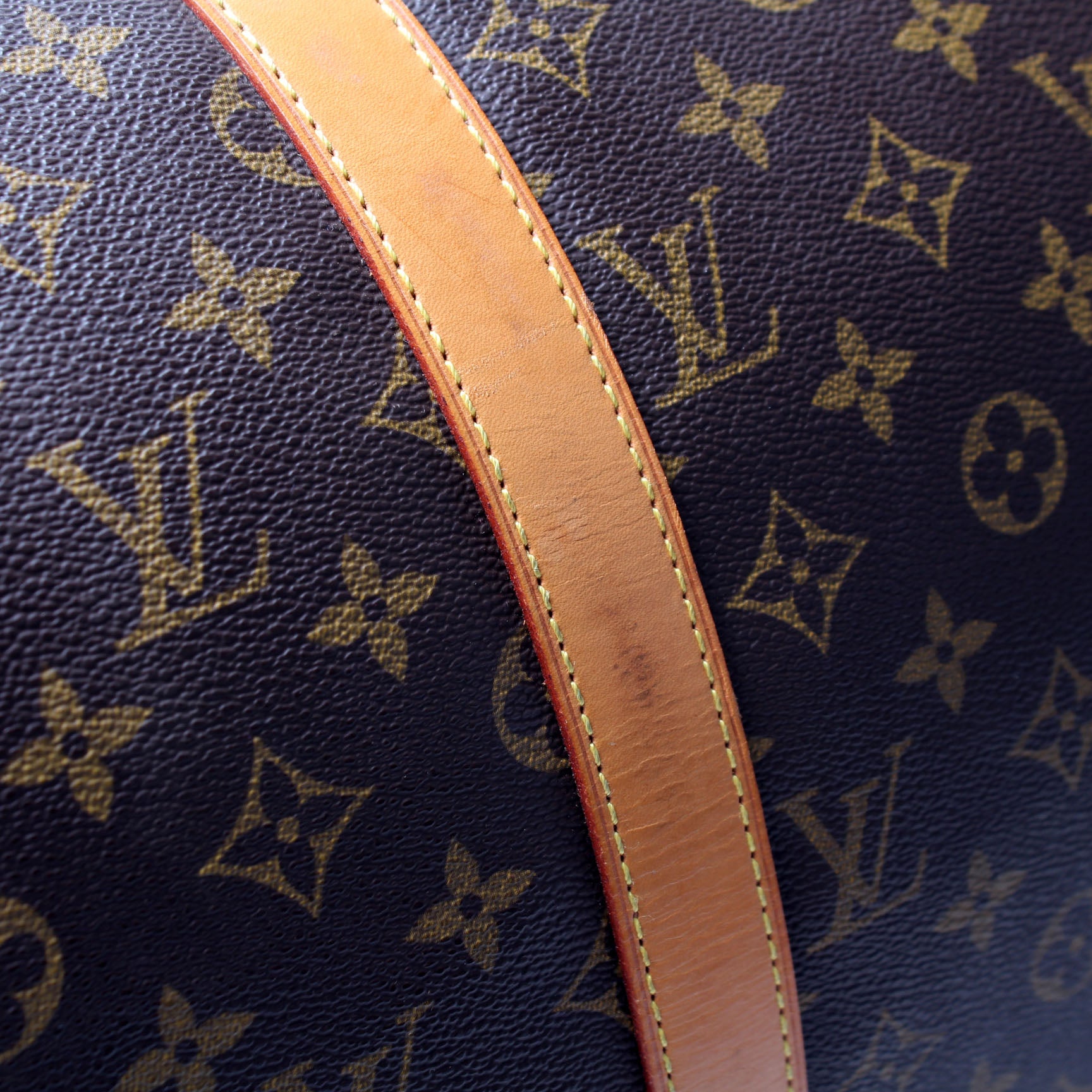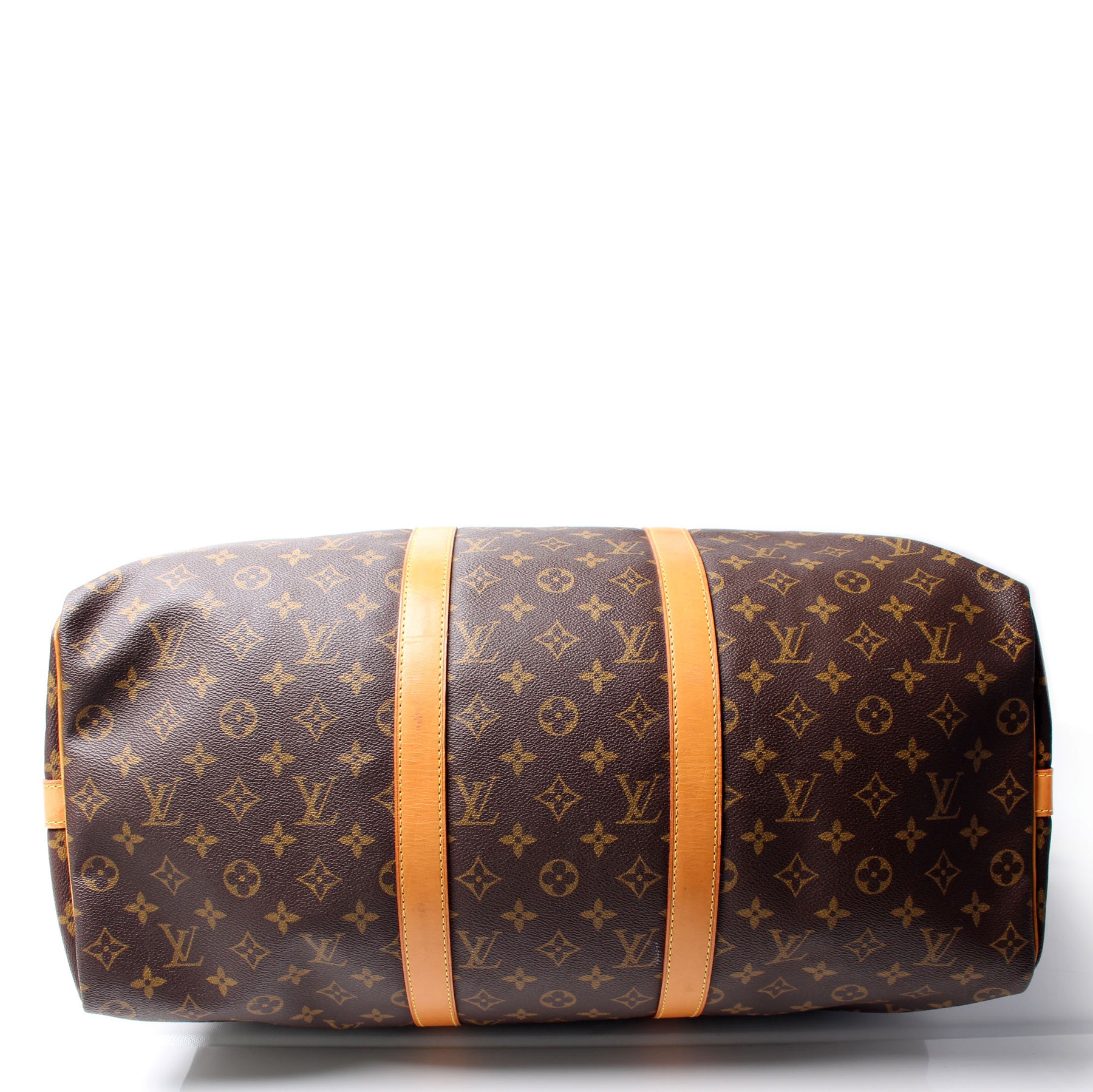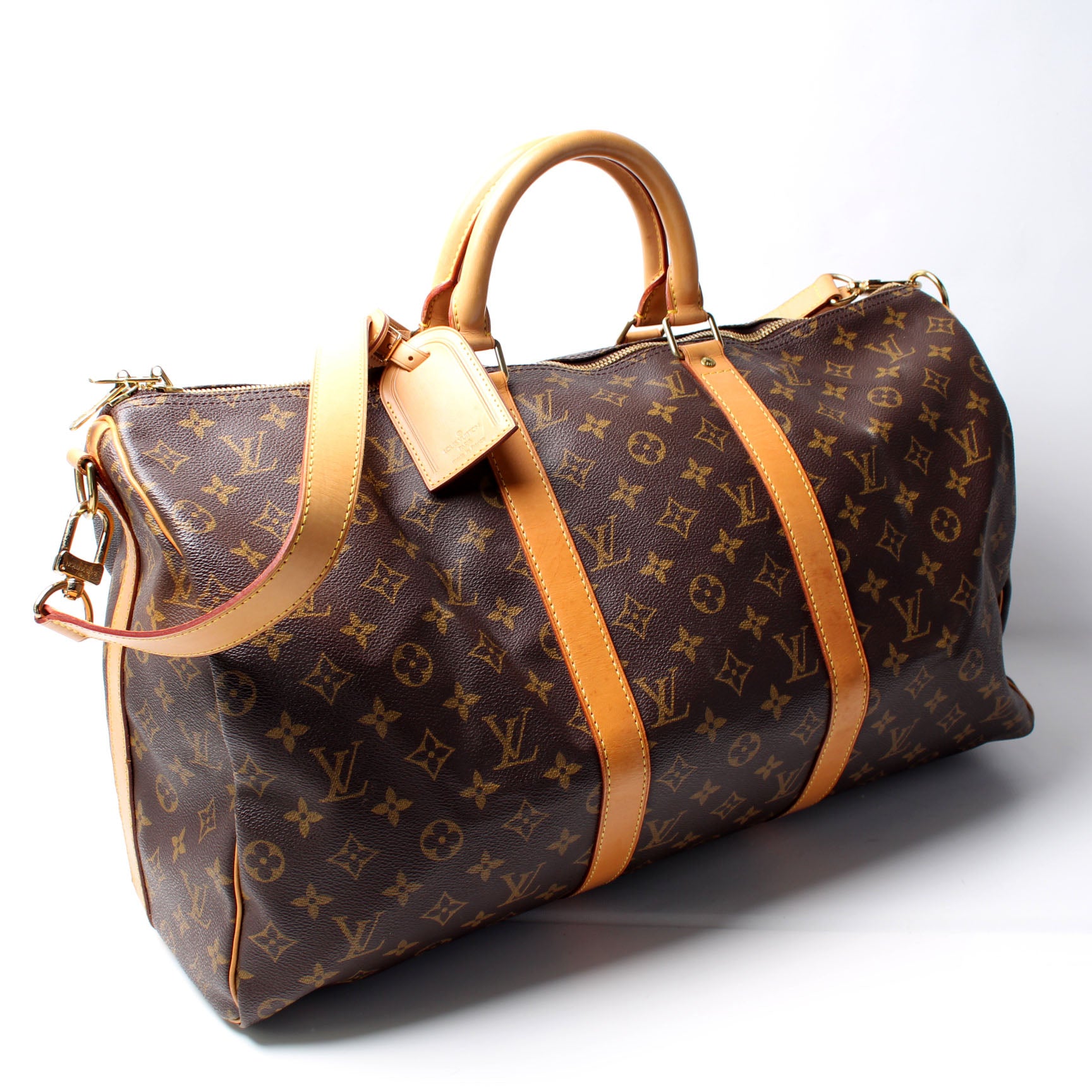 This pre-owned Louis Vuitton Keepall 50 Bandouliere is guaranteed 100% authentic. The exterior is in the classic Monogram coated canvas.