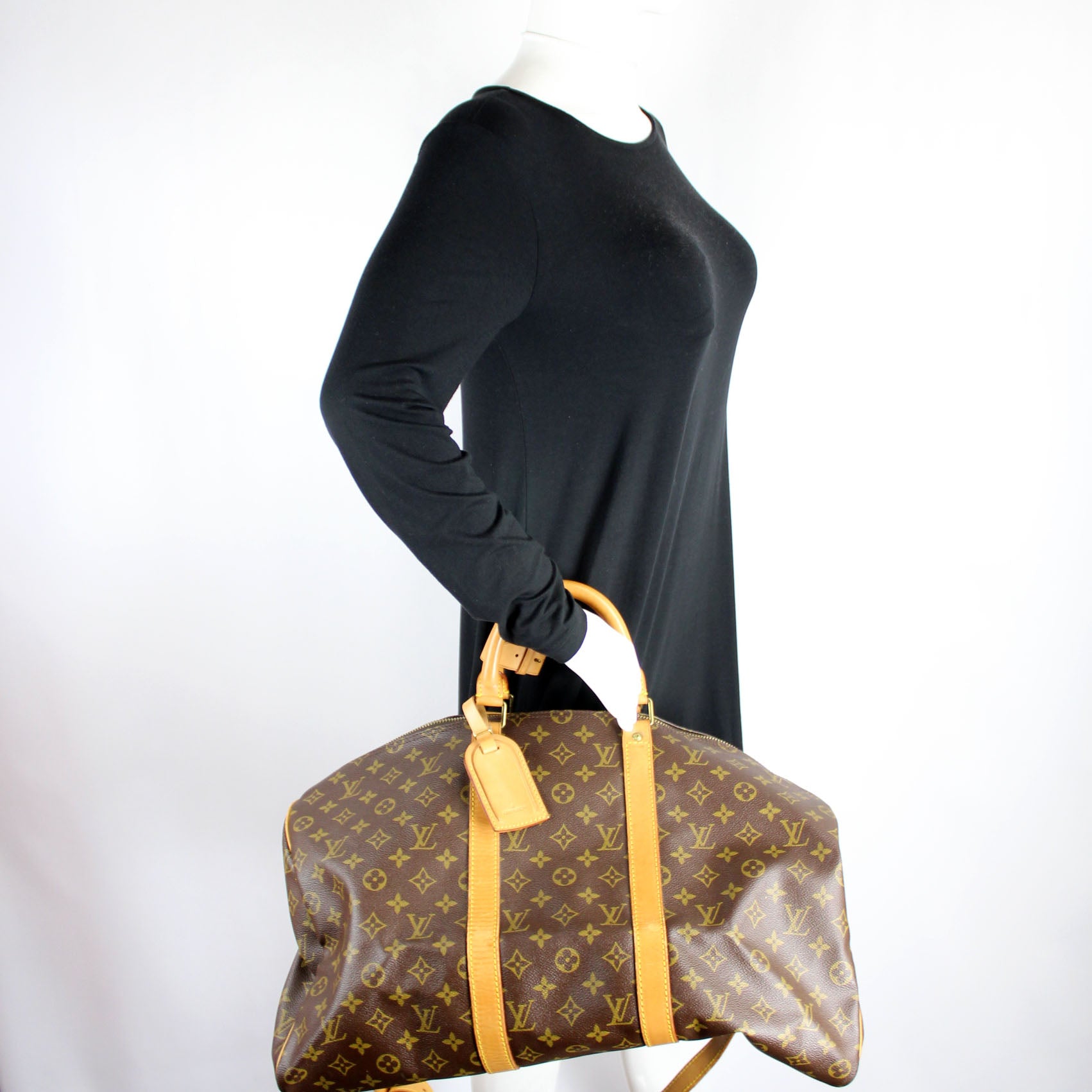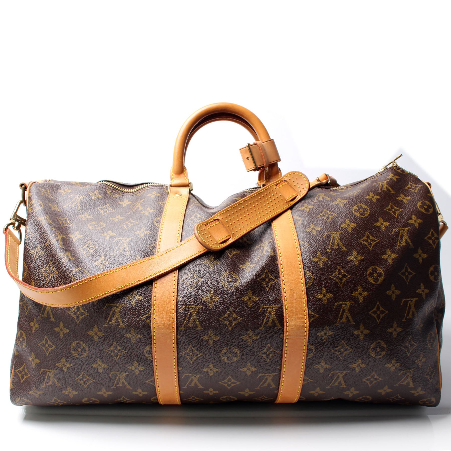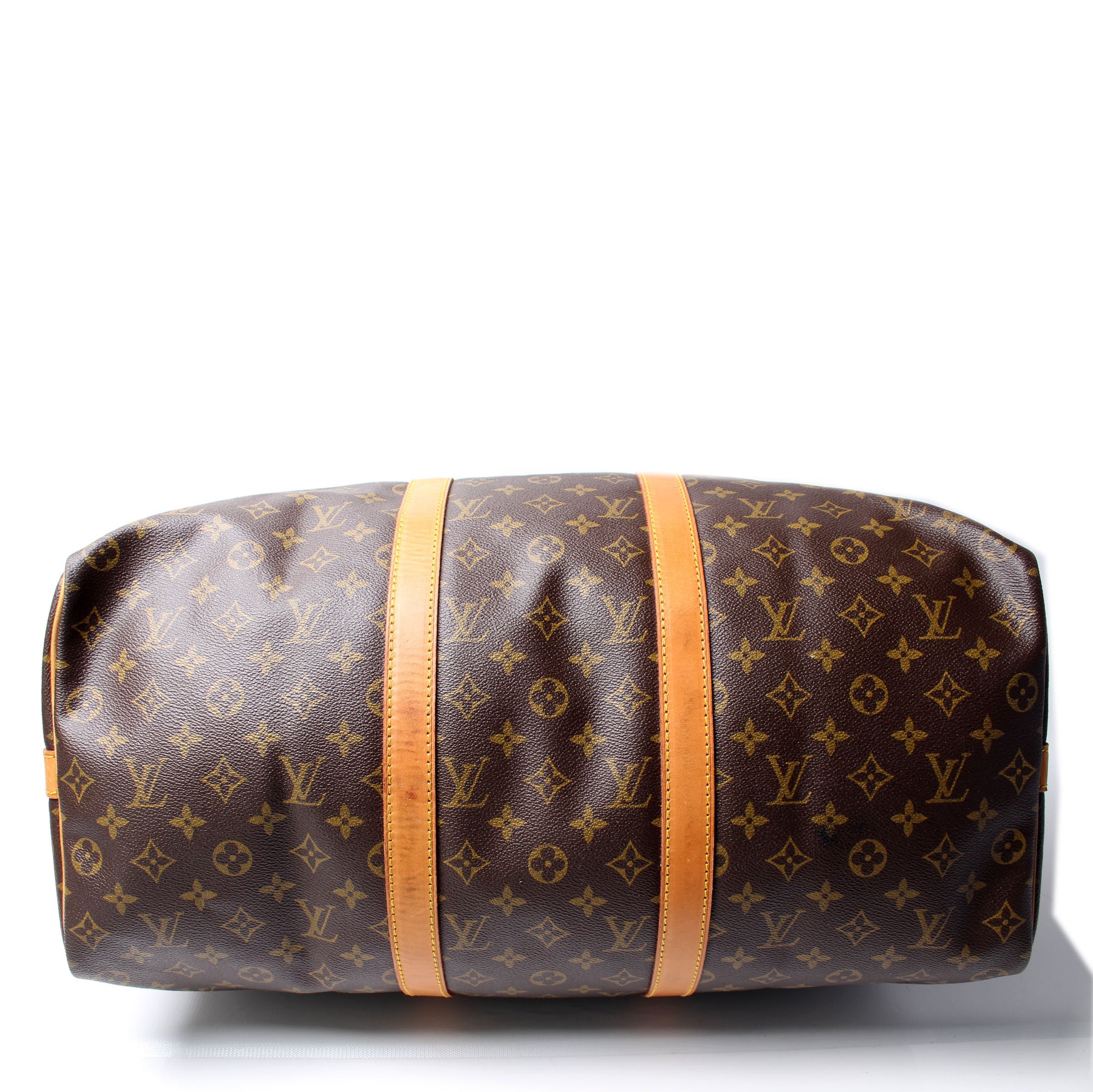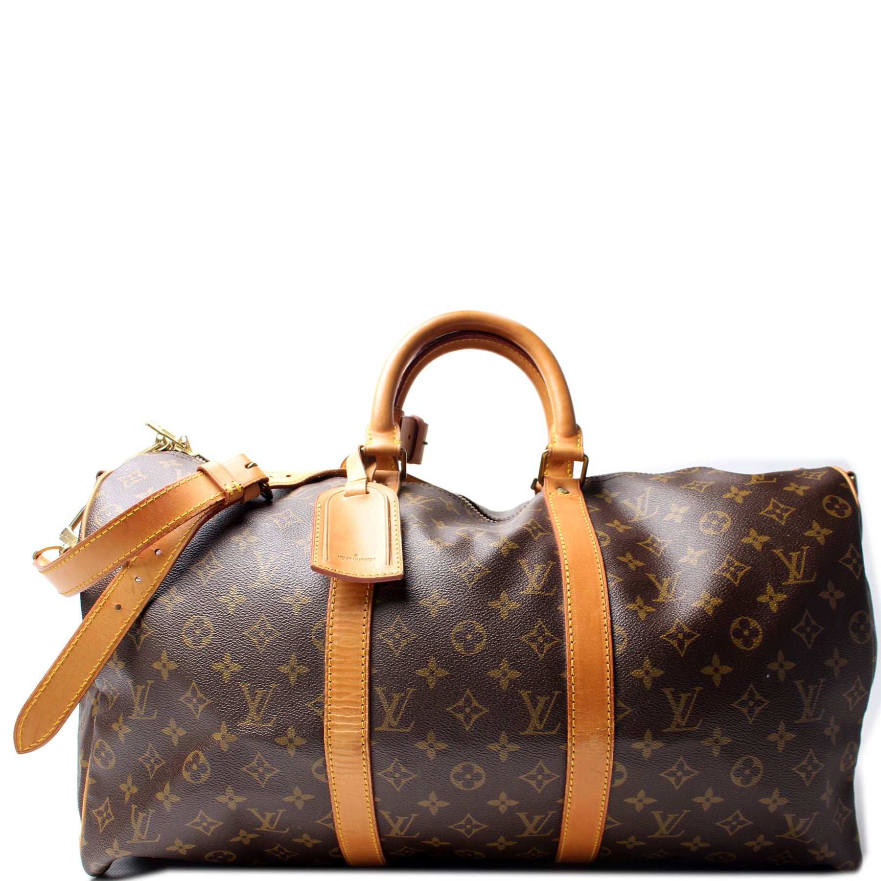 This pre-owned Louis Vuitton Keepall 50 Bandouliere is guaranteed 100% authentic. The exterior is in the classic Monogram coated canvas.