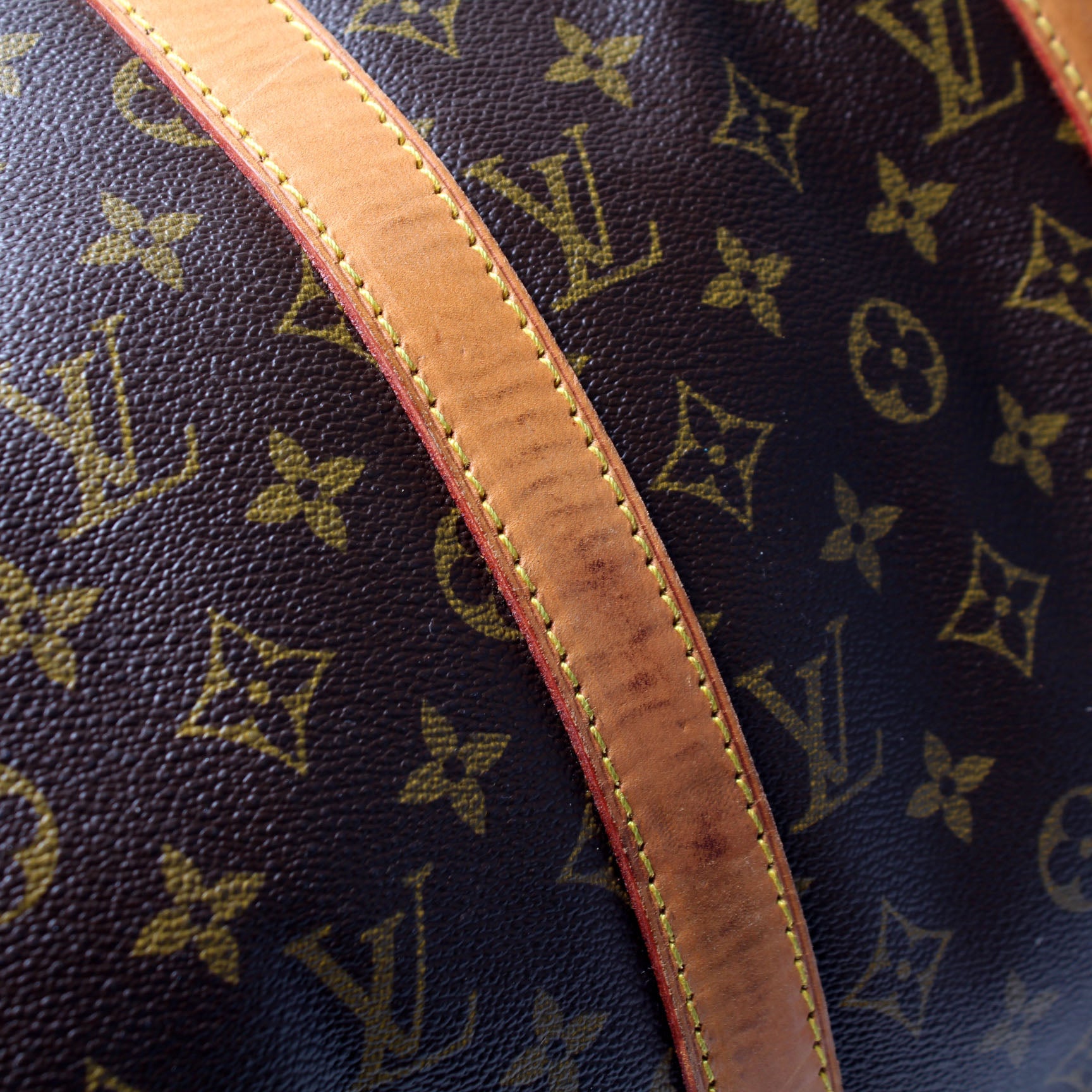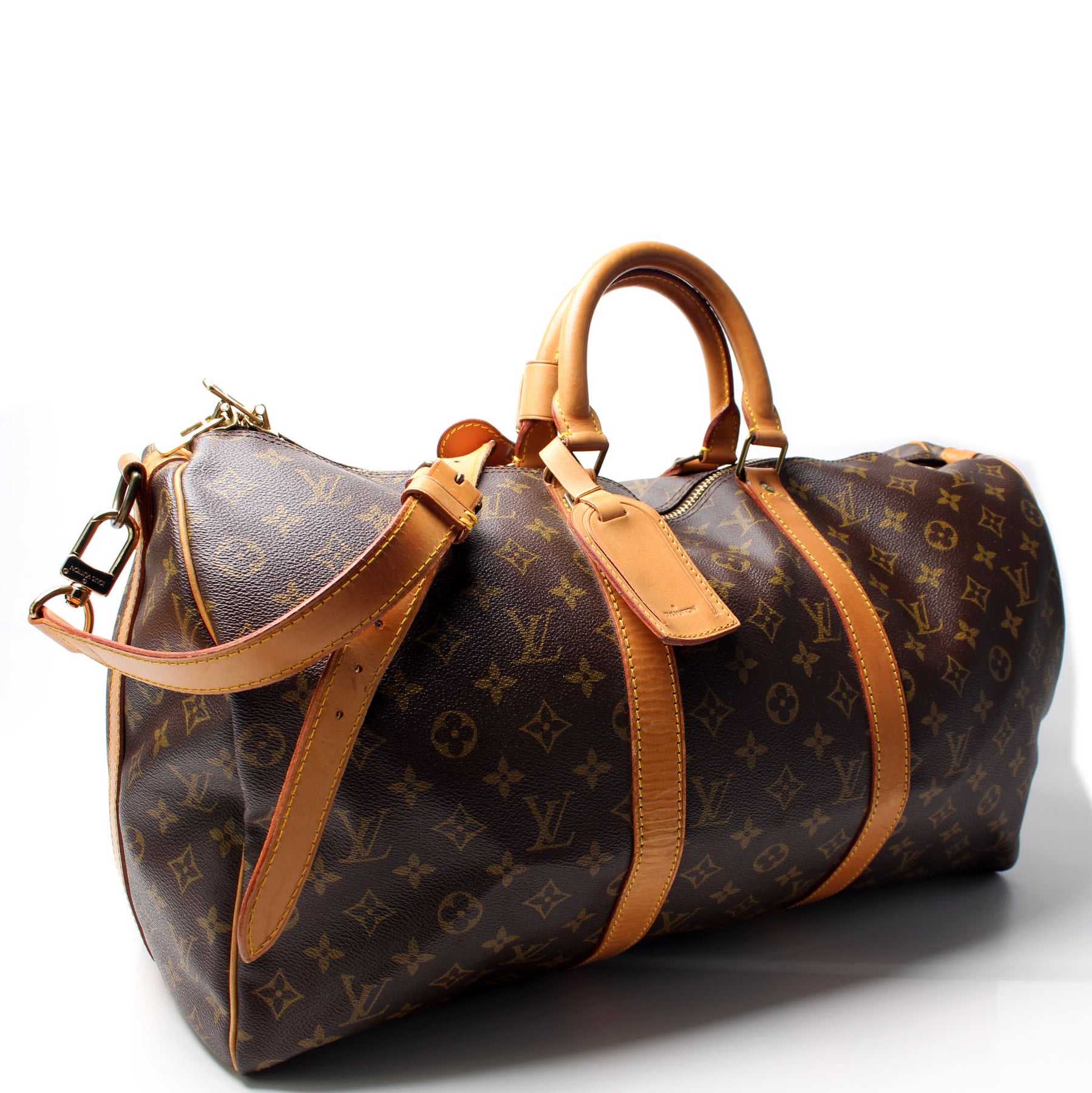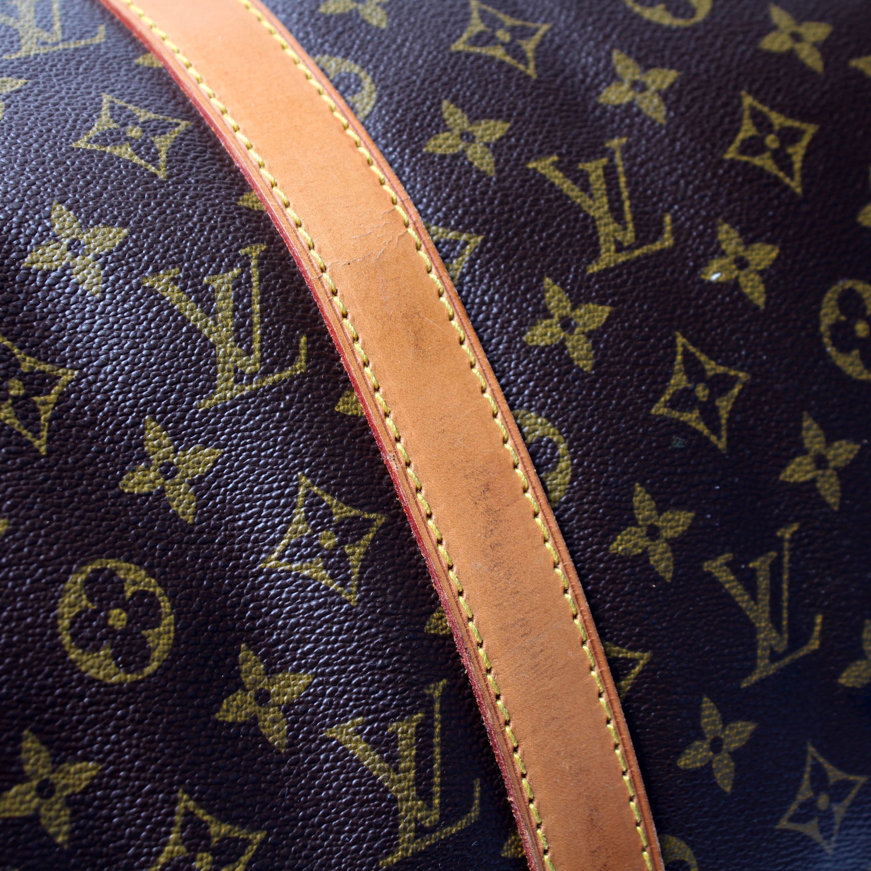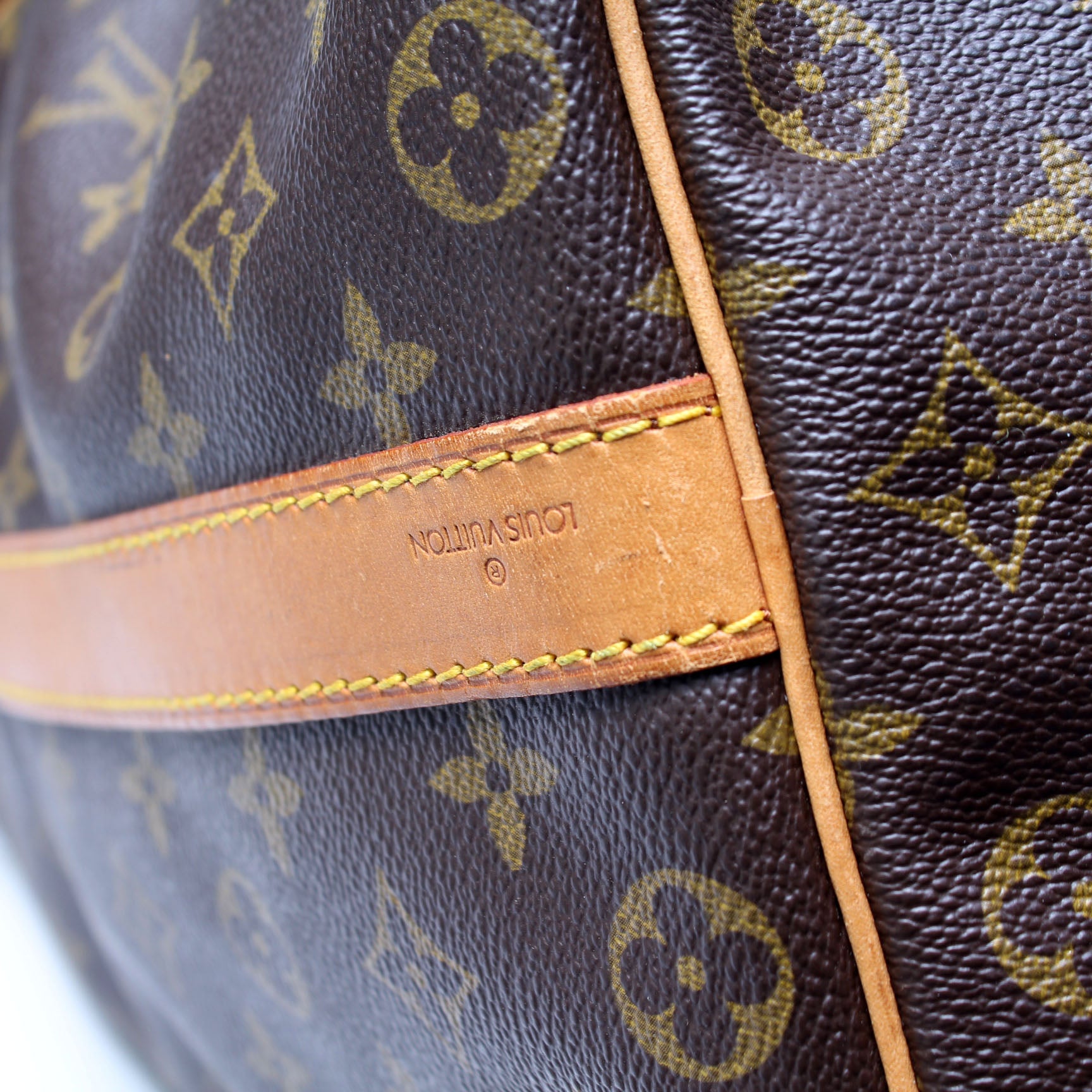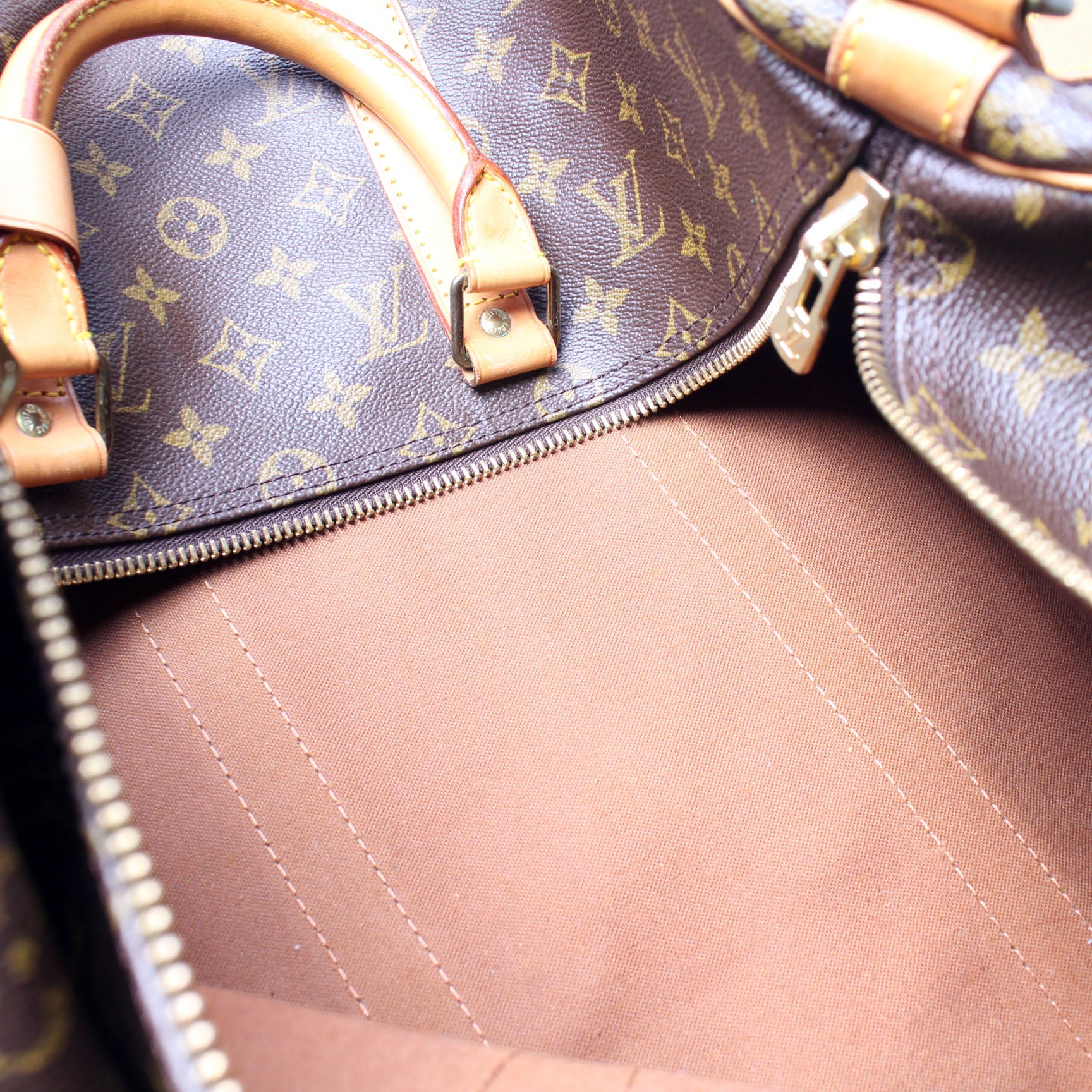 This pre-owned Louis Vuitton Keepall 50 Bandouliere is guaranteed 100% authentic. The exterior is in the classic Monogram coated canvas.