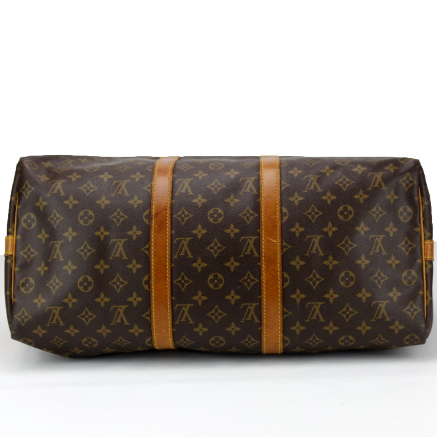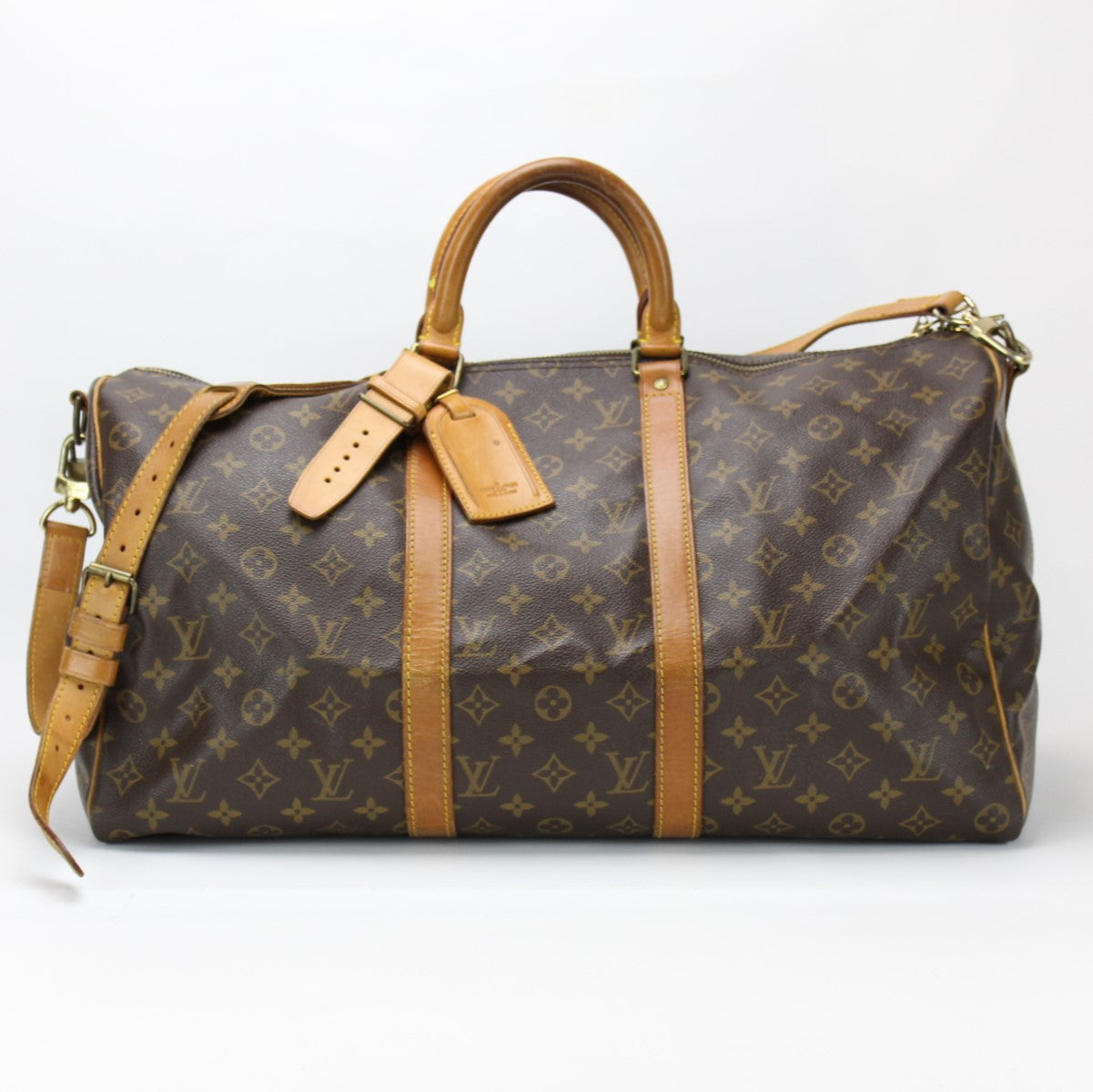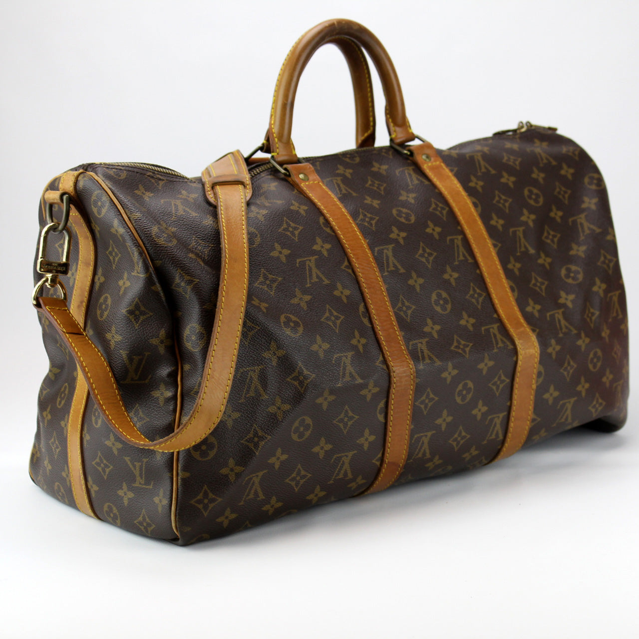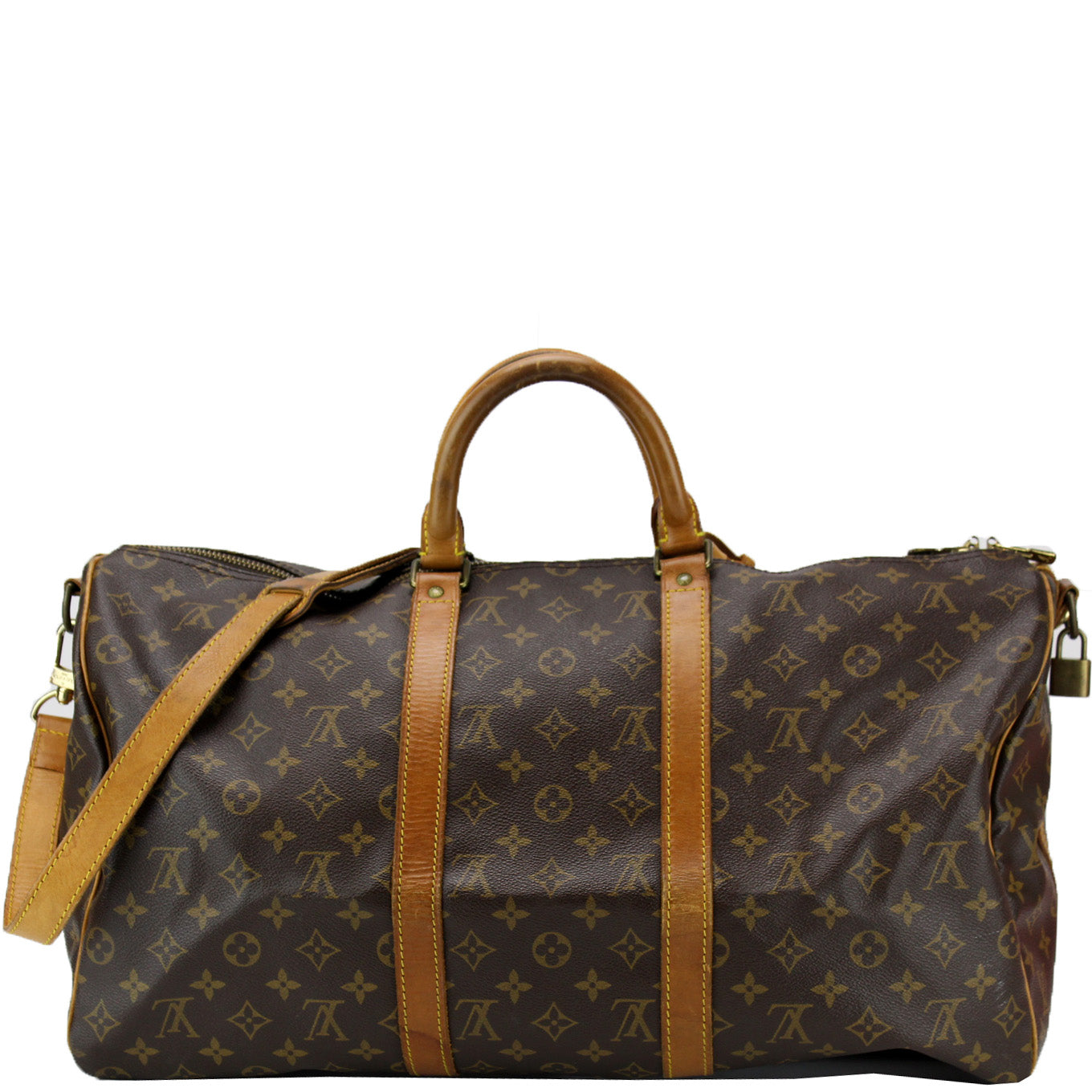 This pre-owned Louis Vuitton Keepall 50 Bandouliere is guaranteed 100% authentic. The exterior is in the classic Monogram coated canvas.
