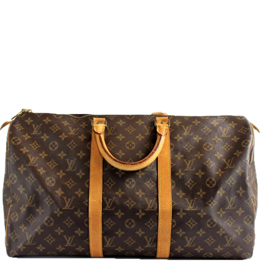 This pre-owned Louis Vuitton Keepall 50 is guaranteed 100% authentic. The exterior is in the classic Monogram coated canvas.