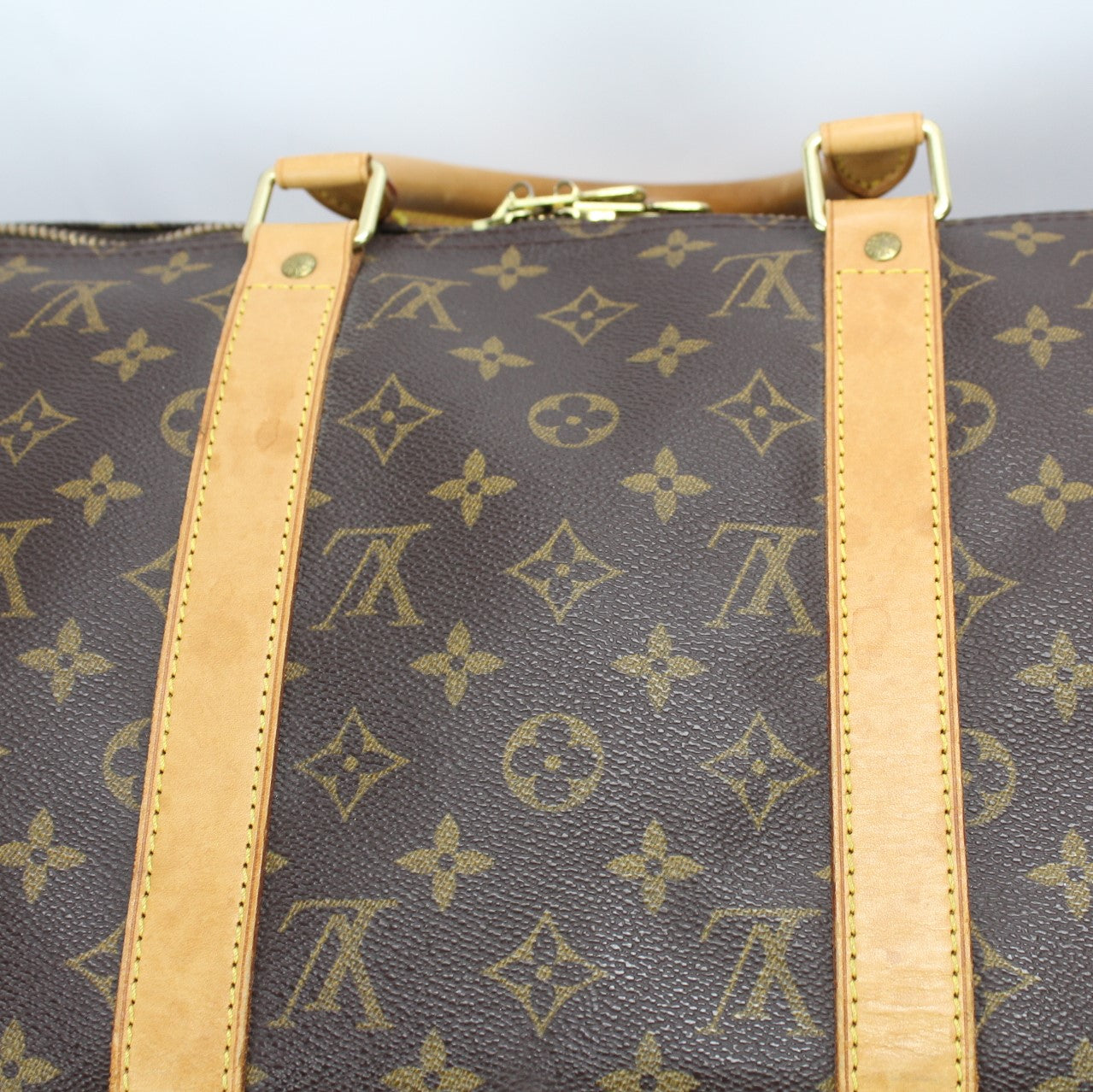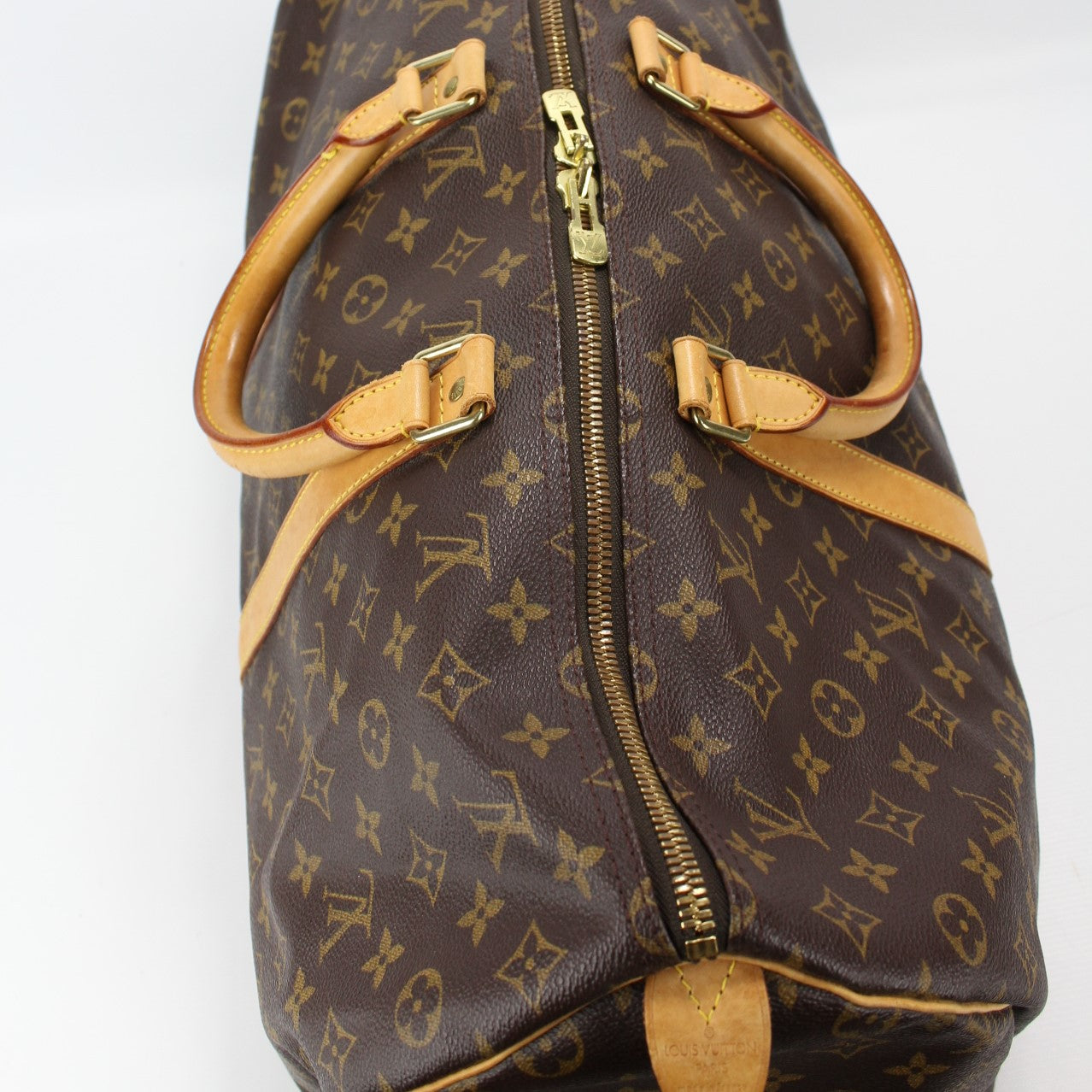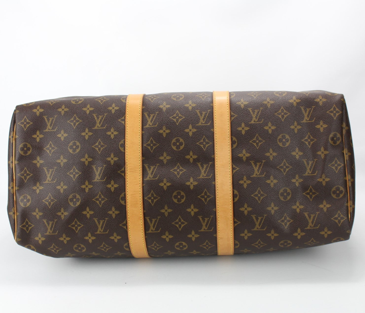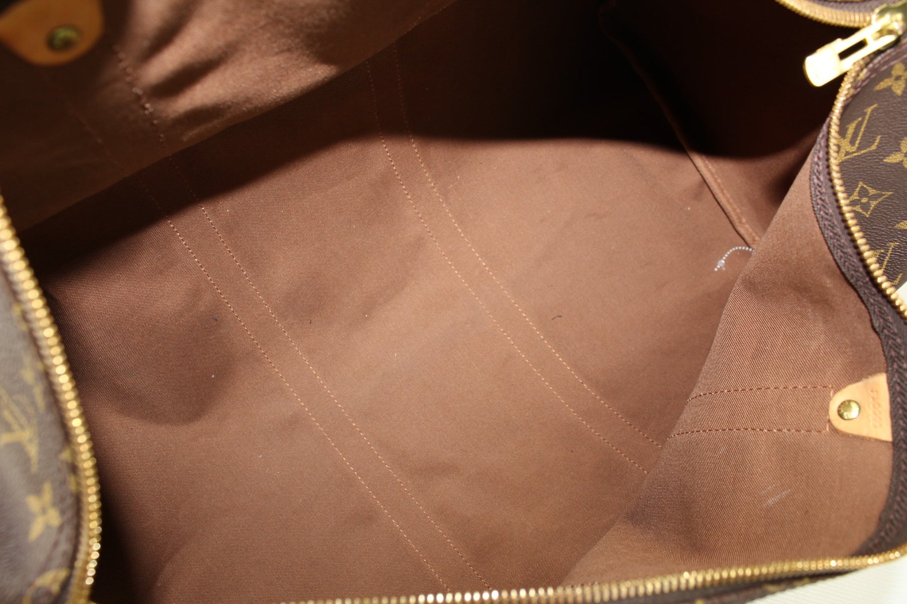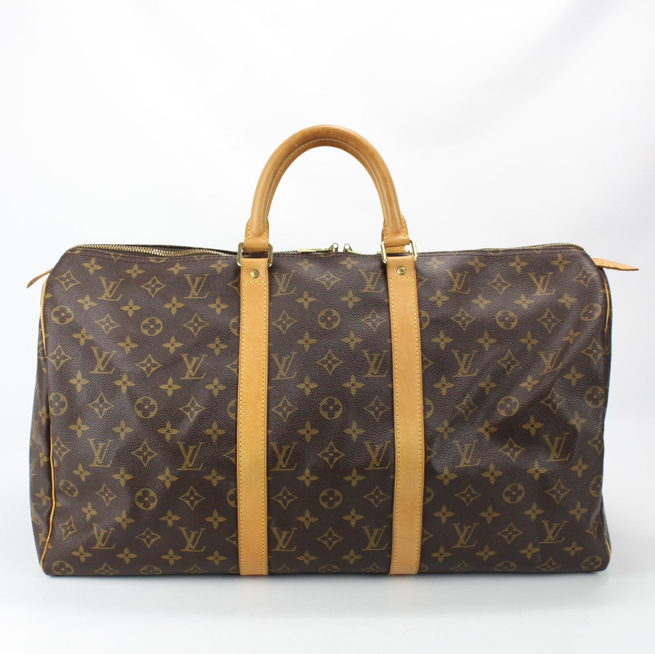 This pre-owned Louis Vuitton Keepall 50 is guaranteed 100% authentic. The exterior is in the classic Monogram coated canvas.