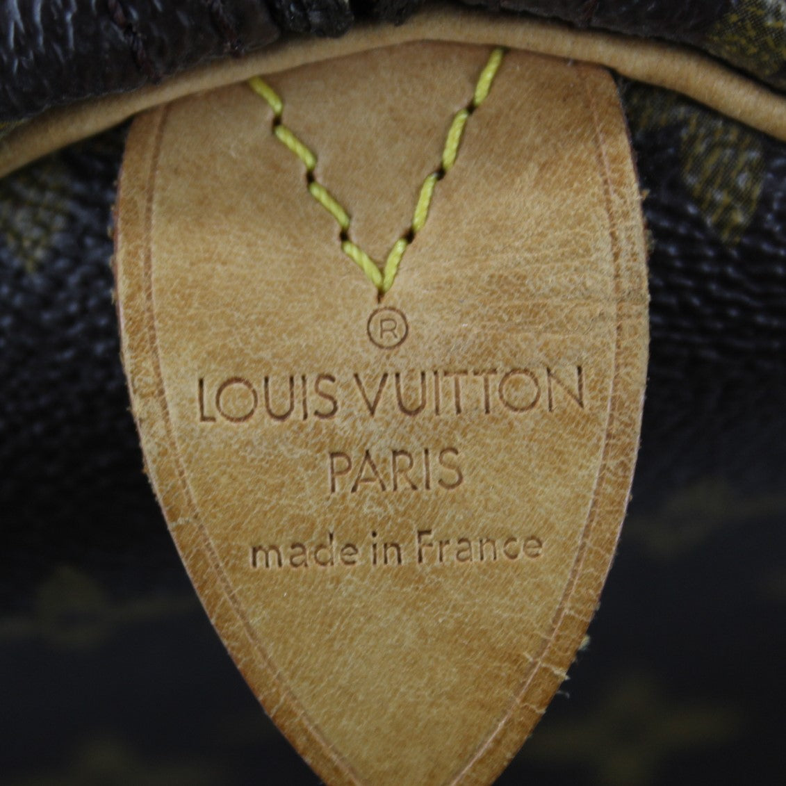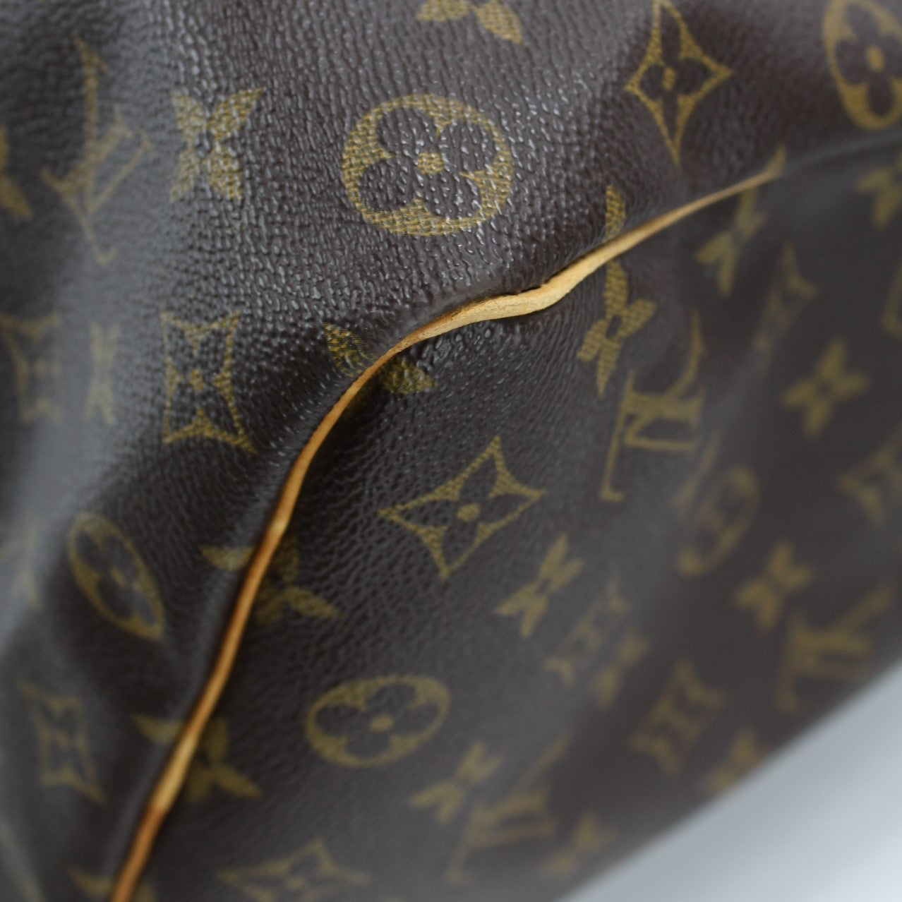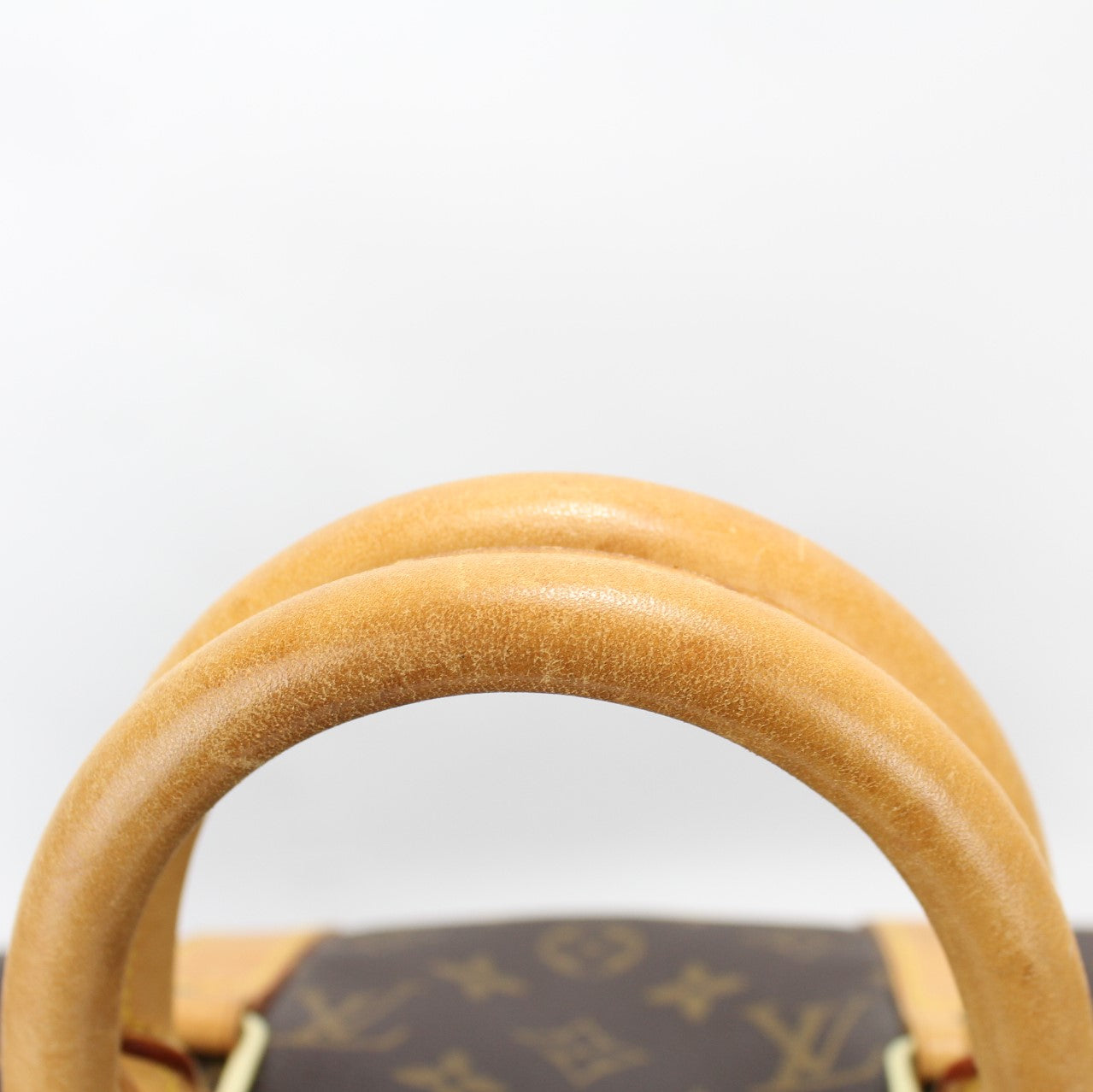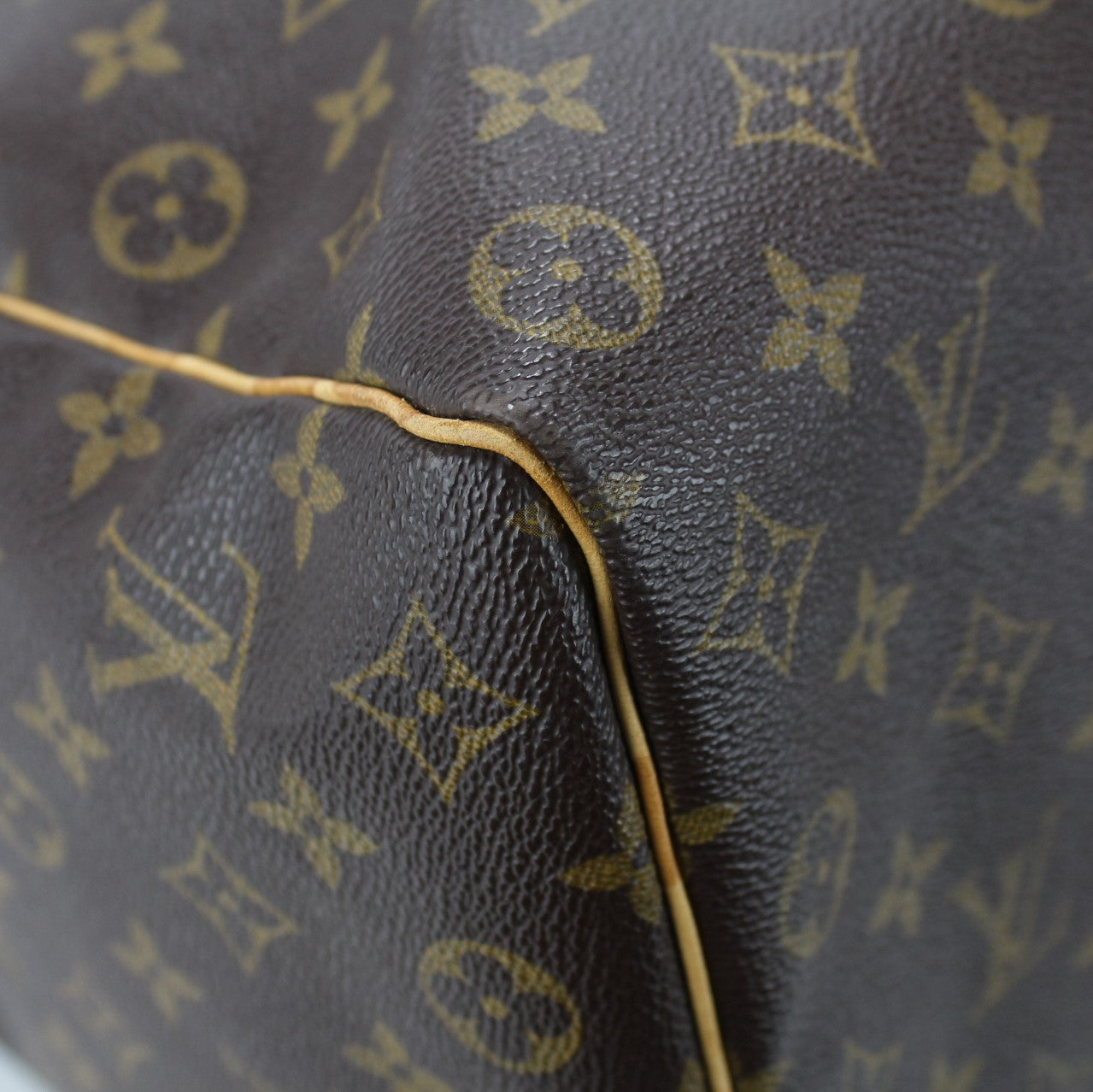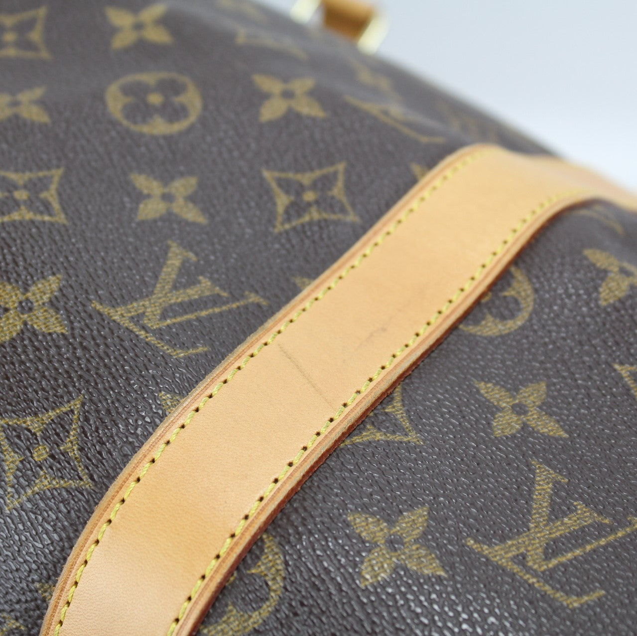 This pre-owned Louis Vuitton Keepall 50 is guaranteed 100% authentic. The exterior is in the classic Monogram coated canvas.