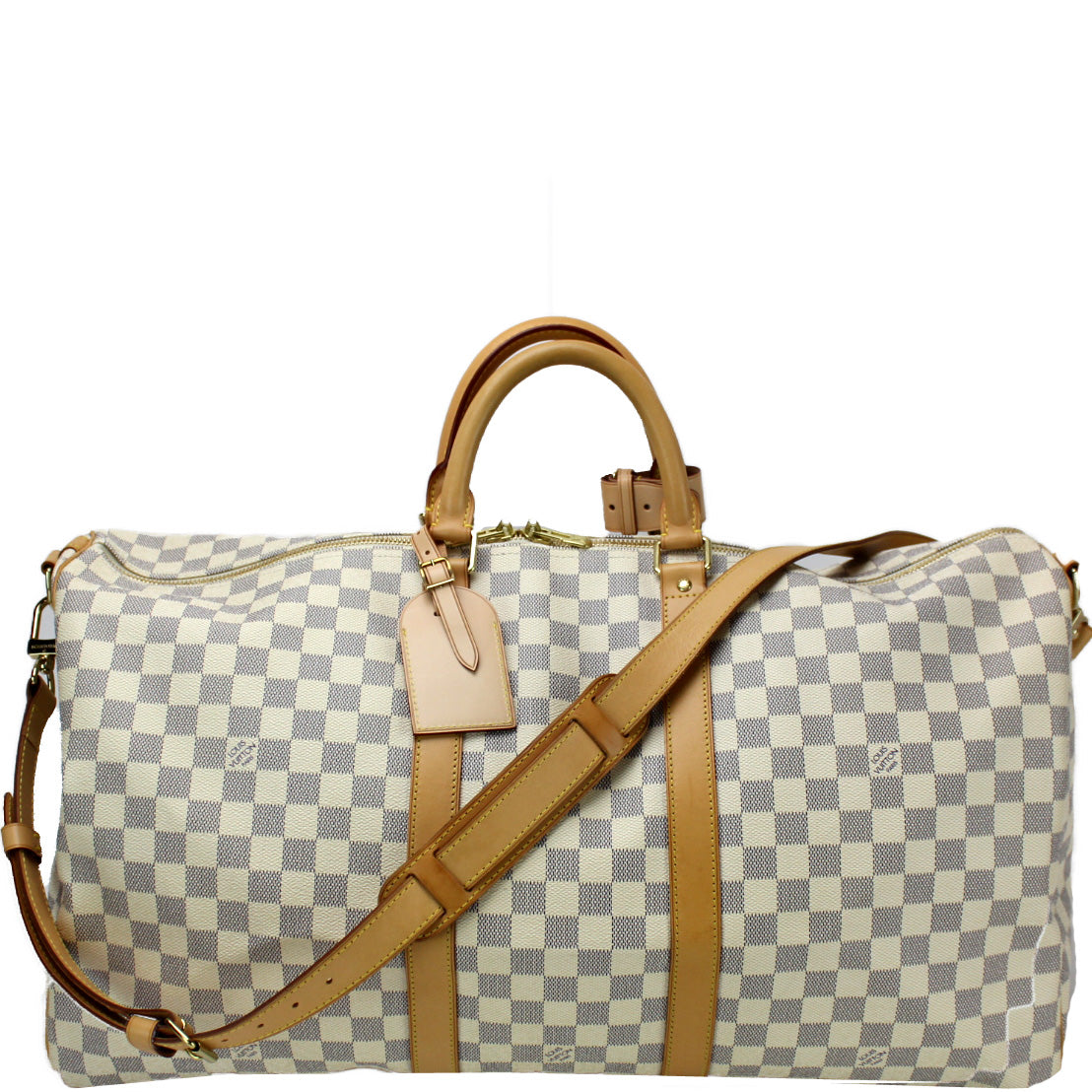 This pre-owned Louis Vuitton Keepall 55 Bandouliere is guaranteed 100% authentic. The exterior is in the classic Louis Vuitton Damier Azur coated canvas.